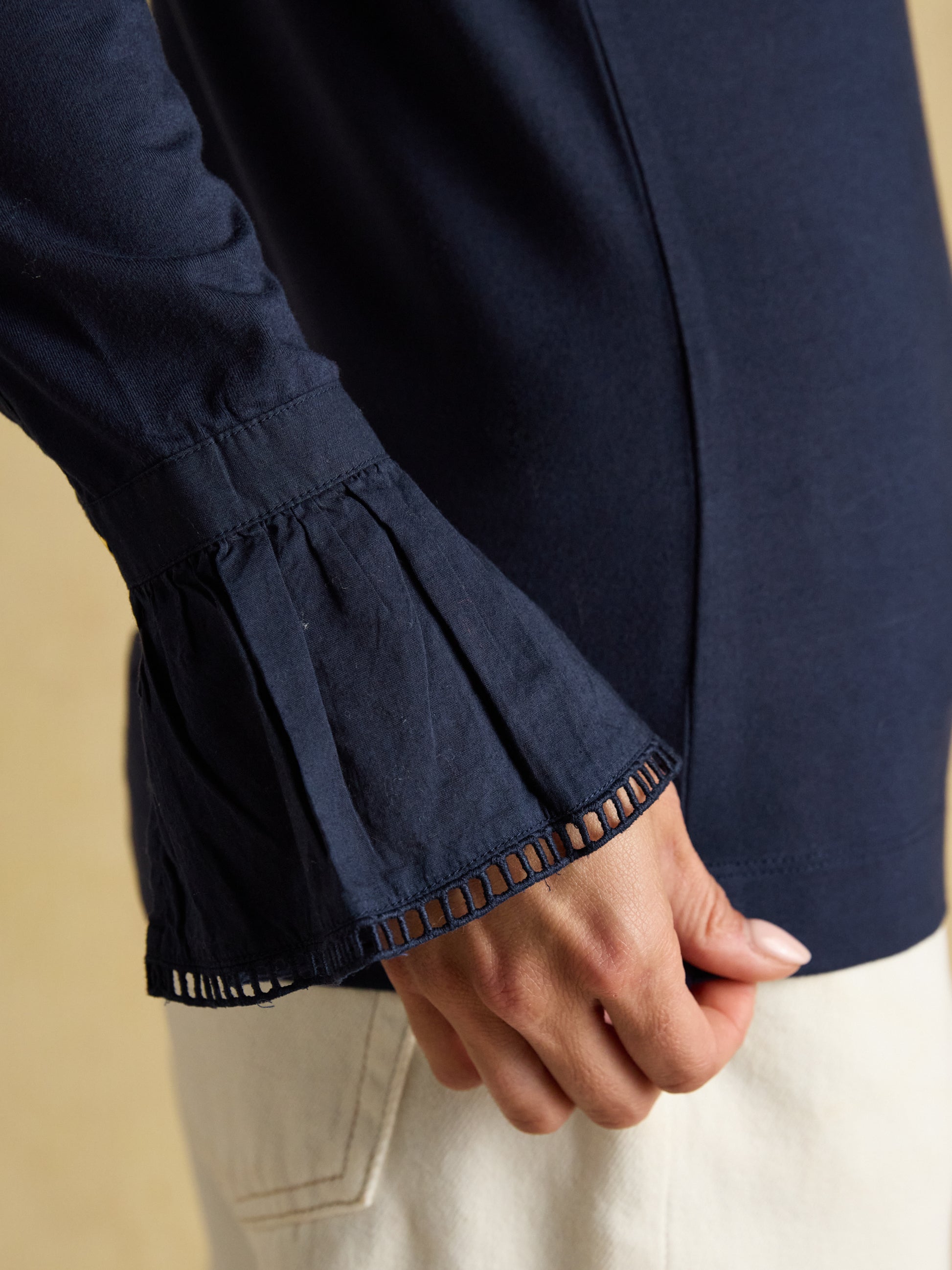 Make room for stylish layers in your autumn wardrobe with the Kate long sleeve top. It's got a jersey body and sleeves with a slim fit that is perfect for your first layer. A concealed button placket with a single exposed button allows for versatile styling, while a woven frilled neckline adds statement detail that will look great popping out of a knitted jumper. The cuffs feature a matching frilled trim with broderie detailing and a single button fastening. Choose from easy-to-style colours that will pair back with any outfit this season.