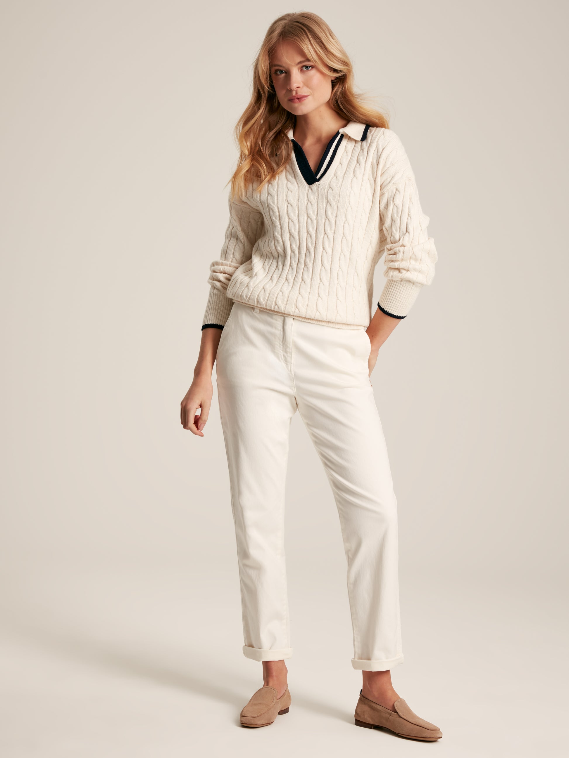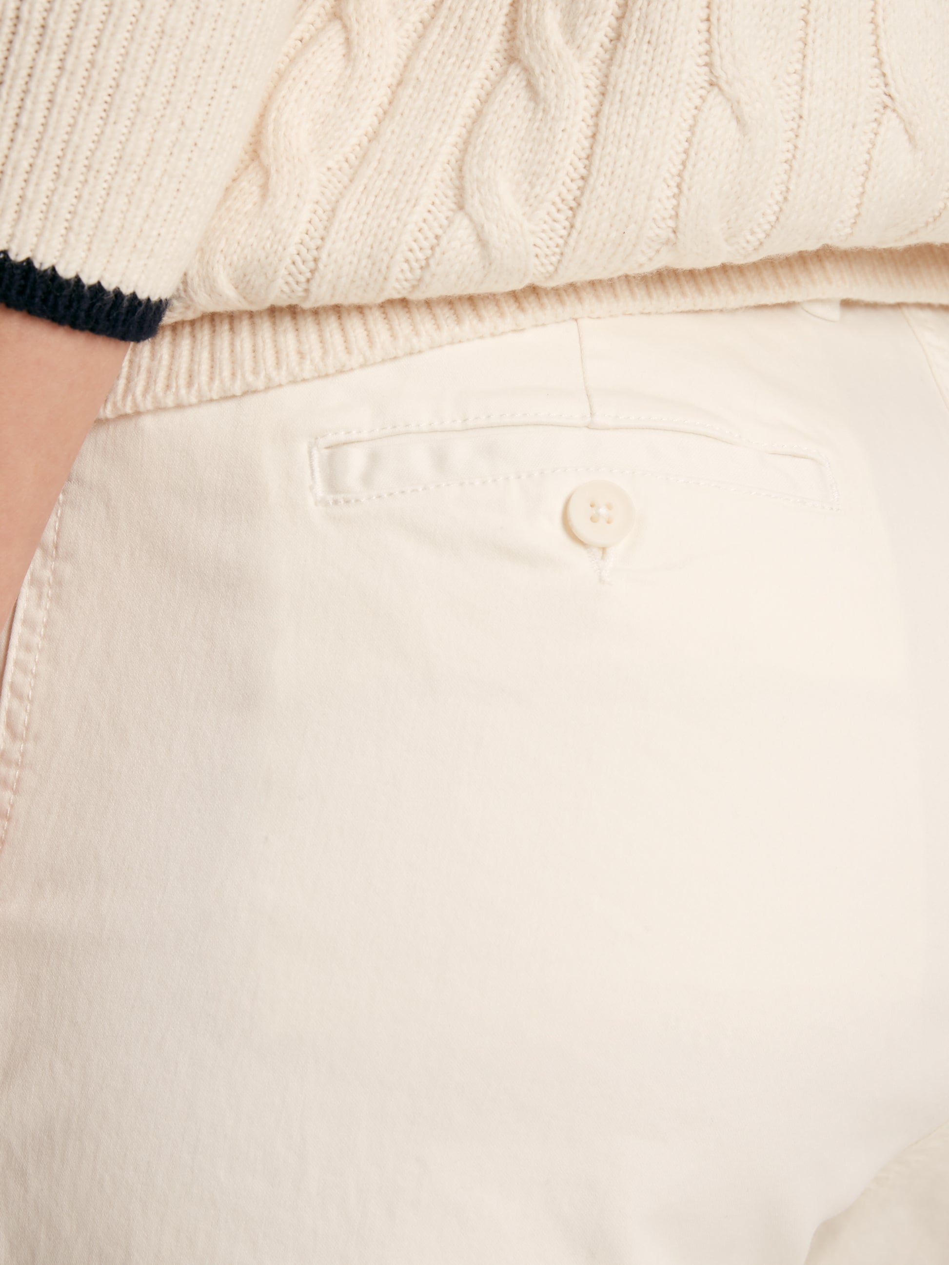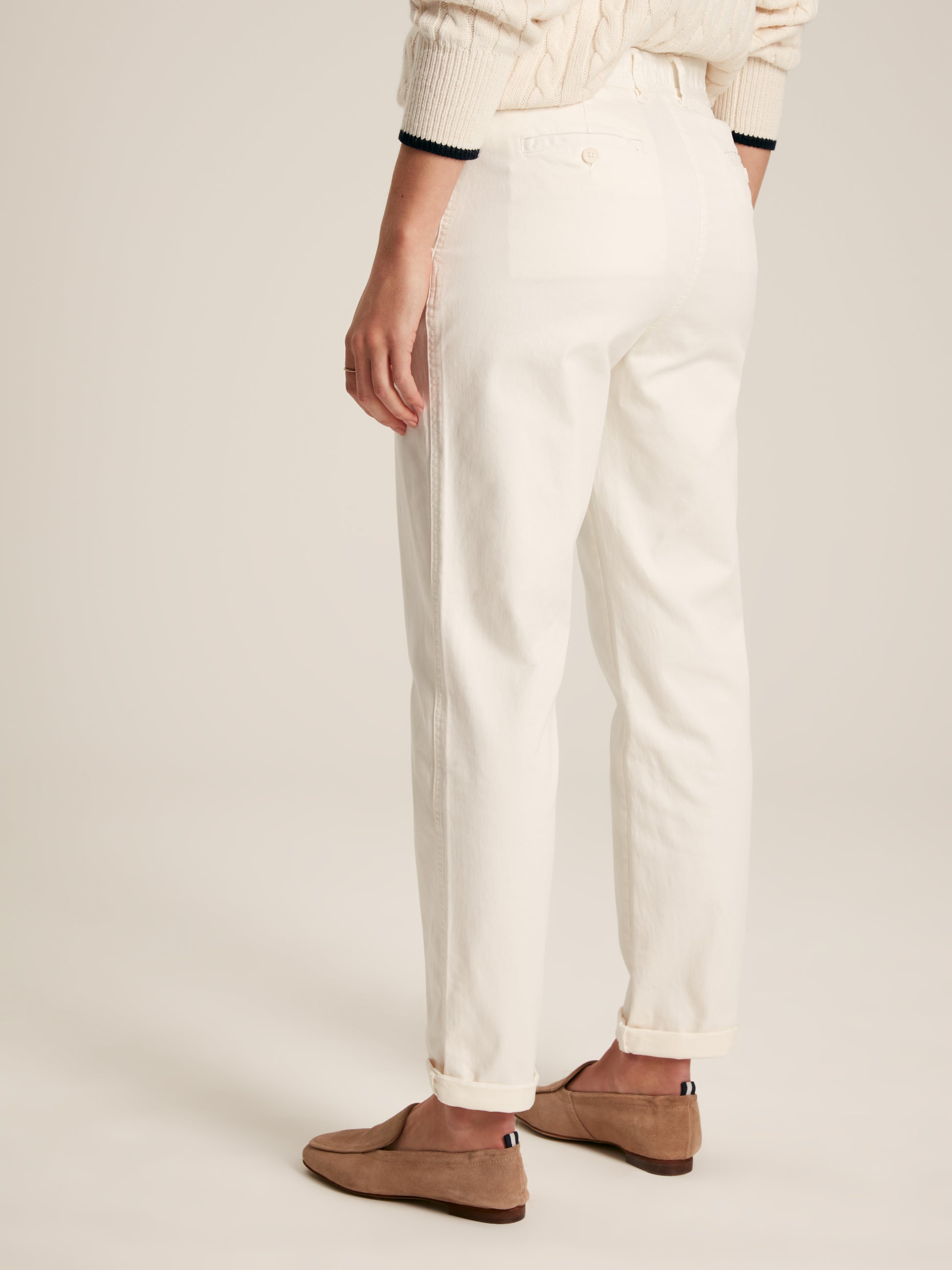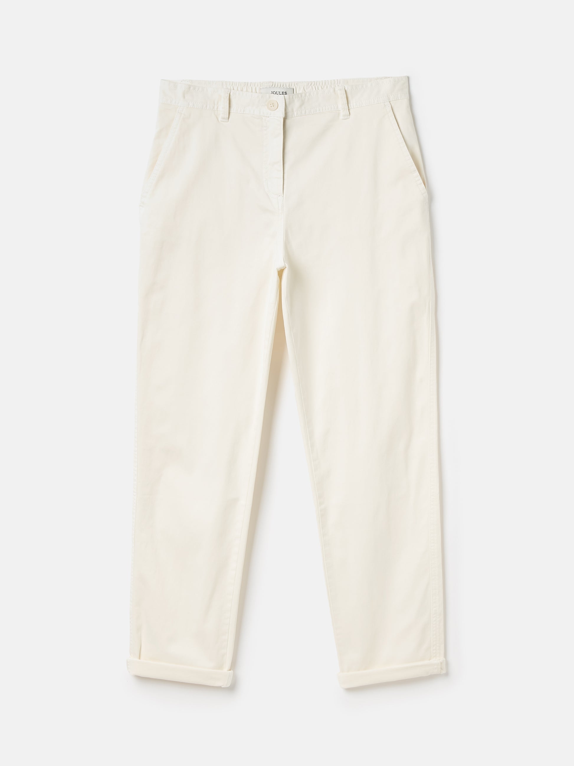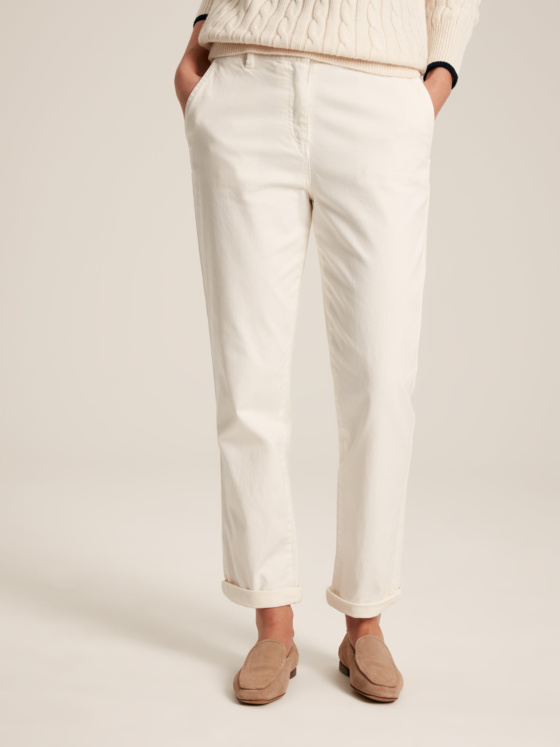 Combining comfort and style, a pair of chinos should hold a space in every woman's wardrobe. For our take on this smart casual classic, we've added a flattering mid-rise waist, a slim fit through the leg and an elasticated band to the back waistband for a little added stretch. The fabric is a cotton blend and has been brushed back for a soft-hand feel. They fasten with a zip and faux horn button fastening and have two side pockets and an additional two welt pockets to the rear with matching faux horn buttons. A true love forever pair.