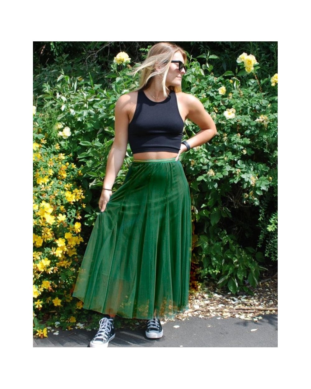 A beautiful Racing Green tulle layer skirt by White Leaf. Pair with white trainers and a plain t-shirt for a casual everyday look then transform your look for the evening with statement jewellery and heels; the possibilities are endless!