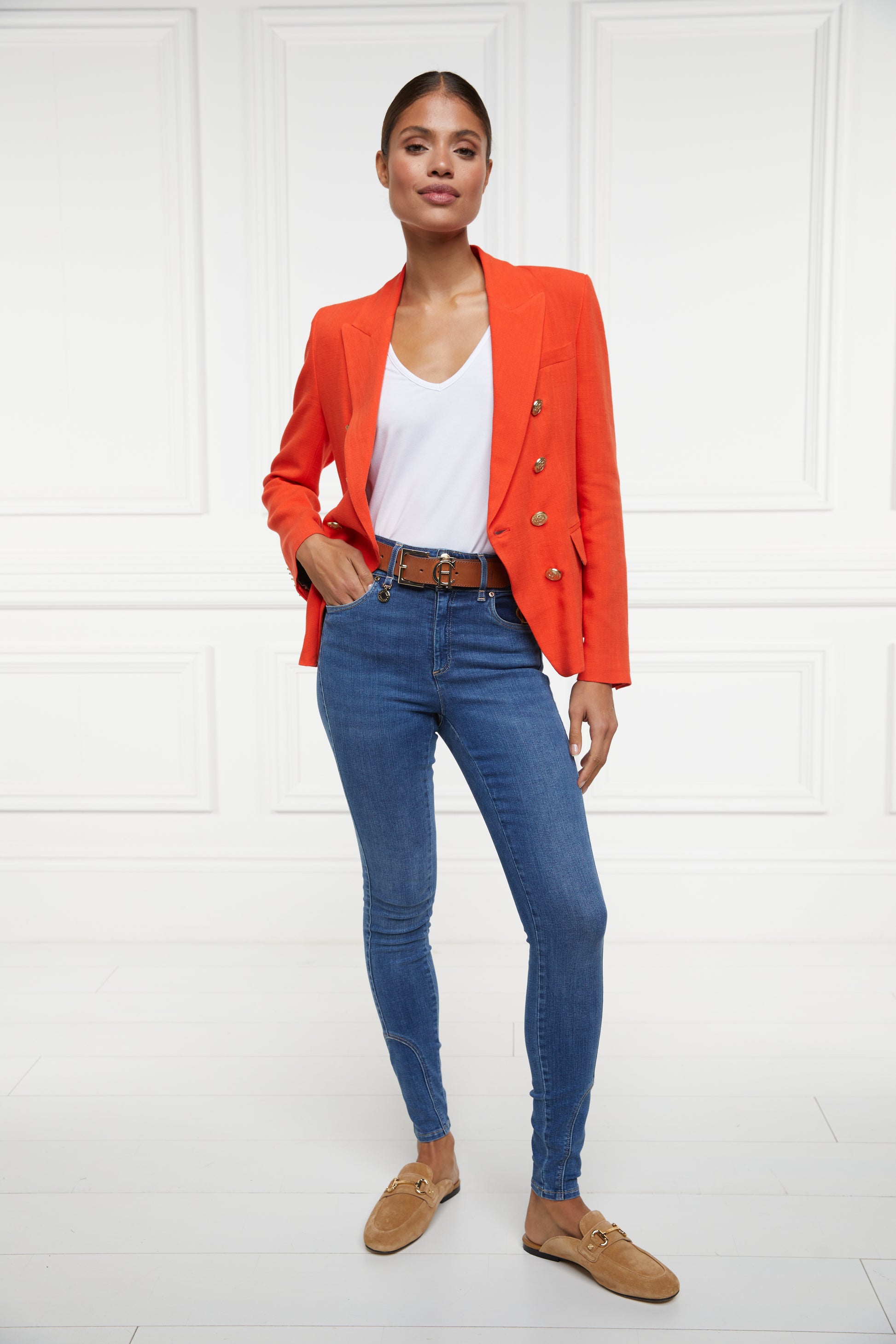 Designed to create a sharp tailored silhouette worn open or closed, the Linen Knightsbridge Blazer has been handmade in the UK. Crafted from a crease resistant lightweight and breathable linen blend & fully lined with a luxury stretch lining for extra comfort, this piece is a must-have for your summer wardrobe. Elevated with HC signature gold hardware to the front and cuffs, the bold colour makes for a chic and contemporary statement. Wear yours with jeans or pair with our matching Tailored Shorts.