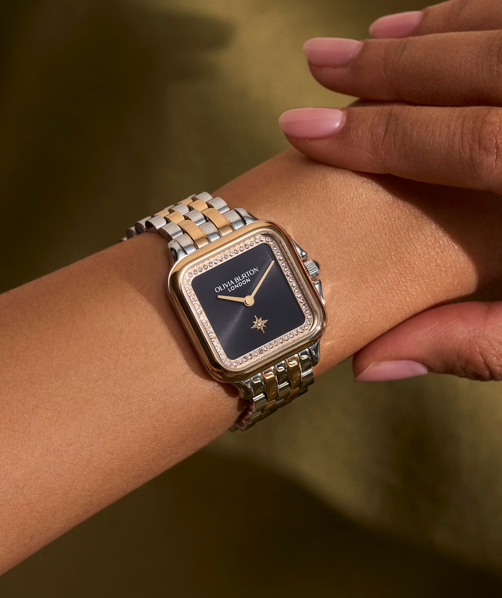 Our iconic Grosvenor watch gets a little extra drama. A black sunray dial is framed by tonal light gold crystals to showcase the elegant soft-square design. Finished with a meaningful North Star marker and two-tone bracelet strap, this dial is a celebration of London’s sophisticated style.
