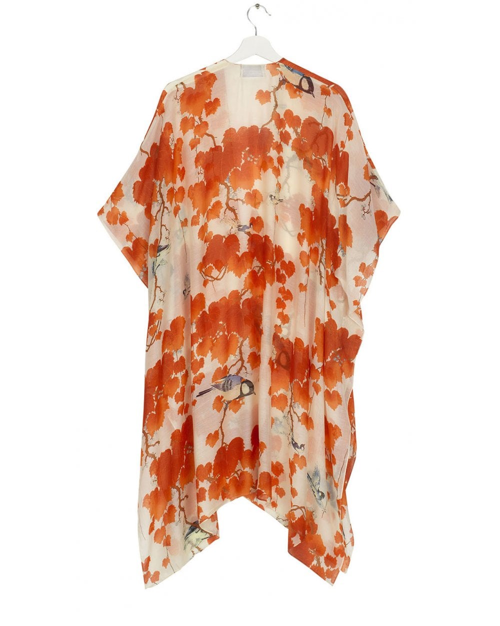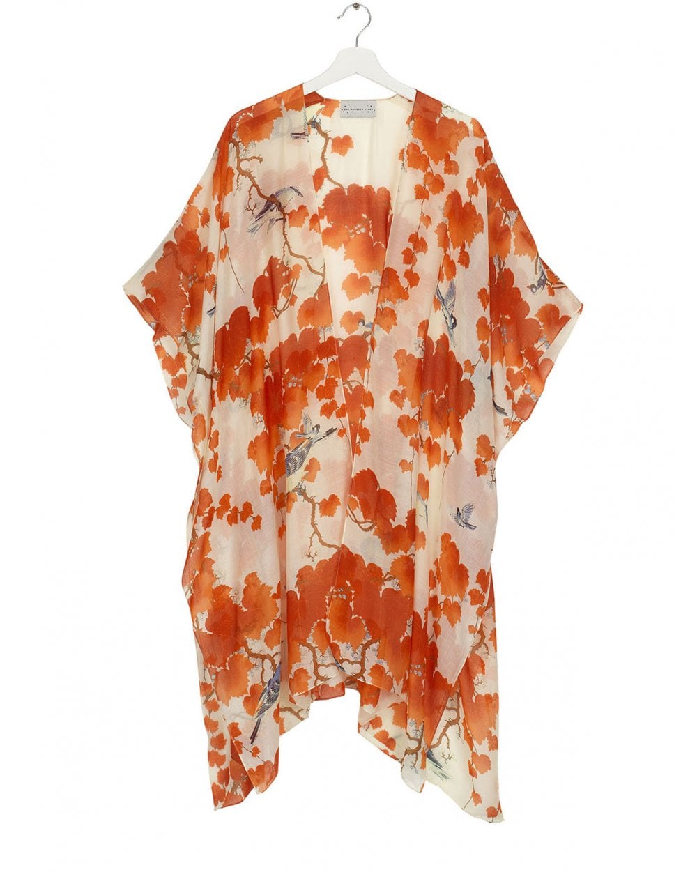 The One Hundred Stars Acer Red design features the beautiful ornamental foliage of the Japanese maple tree with bold scarlet and orange tones on a rich ivory base. These lightweight throwovers make the perfect cover up, they’re mid-length with an open front and loose arms they are perfect for the warmer months or worn on holiday as the ideal resort wear.