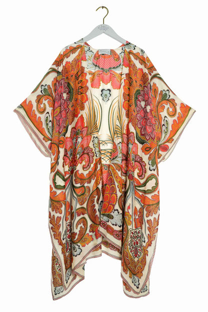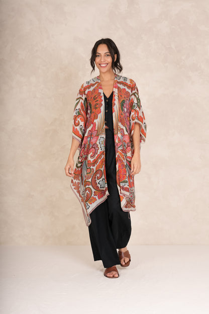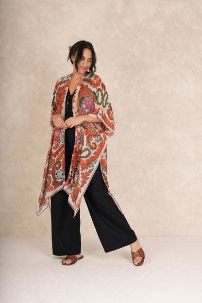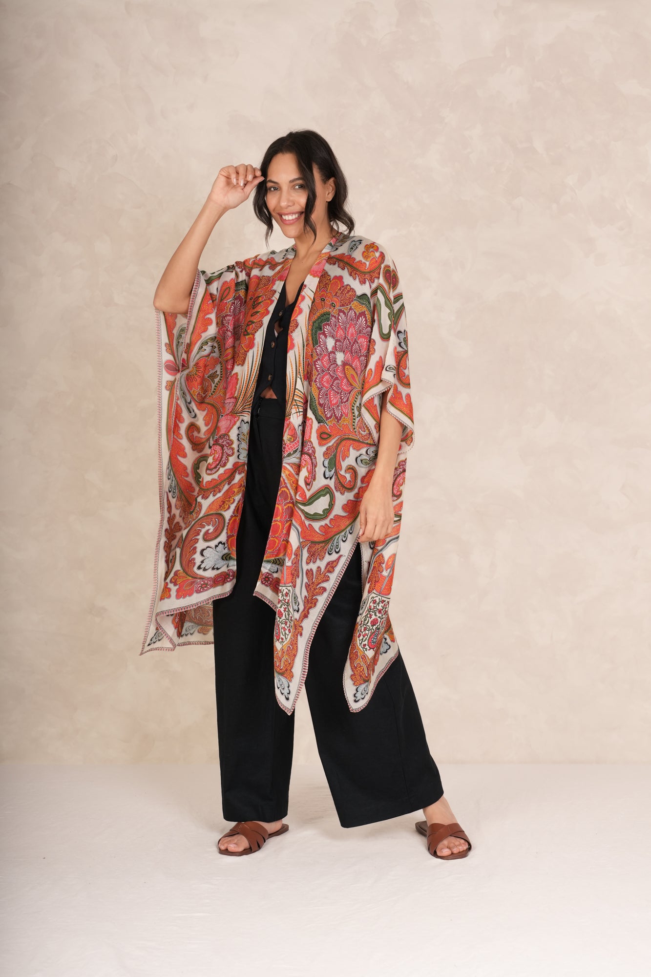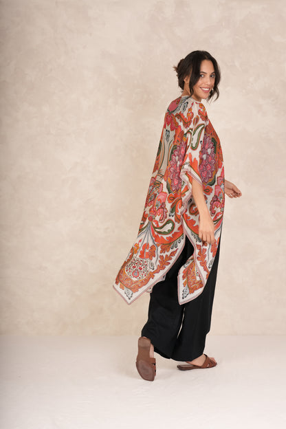 A modern look at a traditional Indian paisley, our Fiesta print has a fantastic and stunning colour range inspired by Spain. Showcasing bright oranges and hints of calming greens with bohemian elements, this design is perfect for adding a new signature style to your wardrobe.