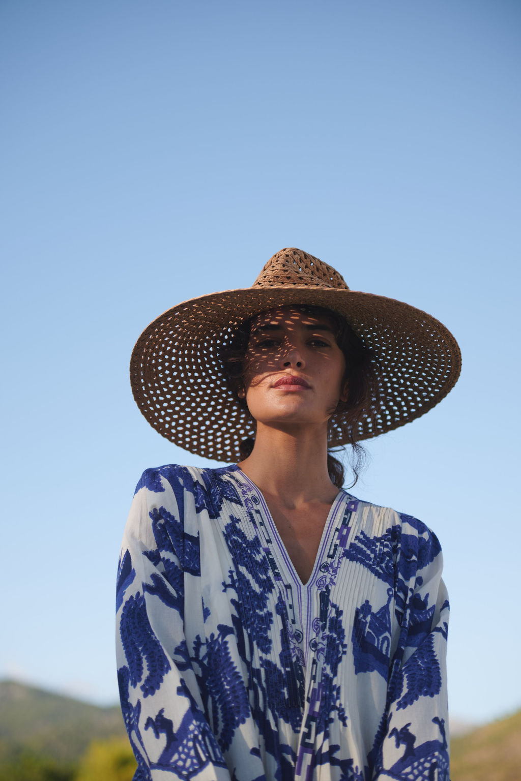 The best-selling Giant Willow Blue design features the classic blue willow print on an ivory base, which can often be found adorning vintage pottery. With its delicately pleated placket top leading down to a flowing maxi skirt, this dress showcases the entire One Hundred Stars signature print. Made from 100% organic cotton, this dress has a straightforward V-neck, includes must-have pockets. An easy, cool dress to wear on hot summer days.