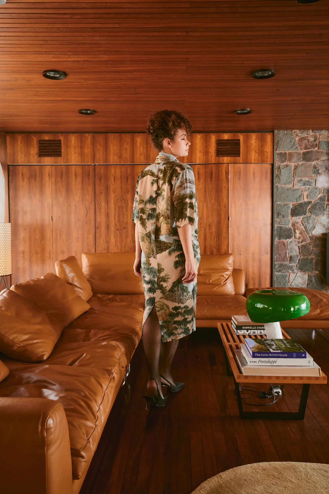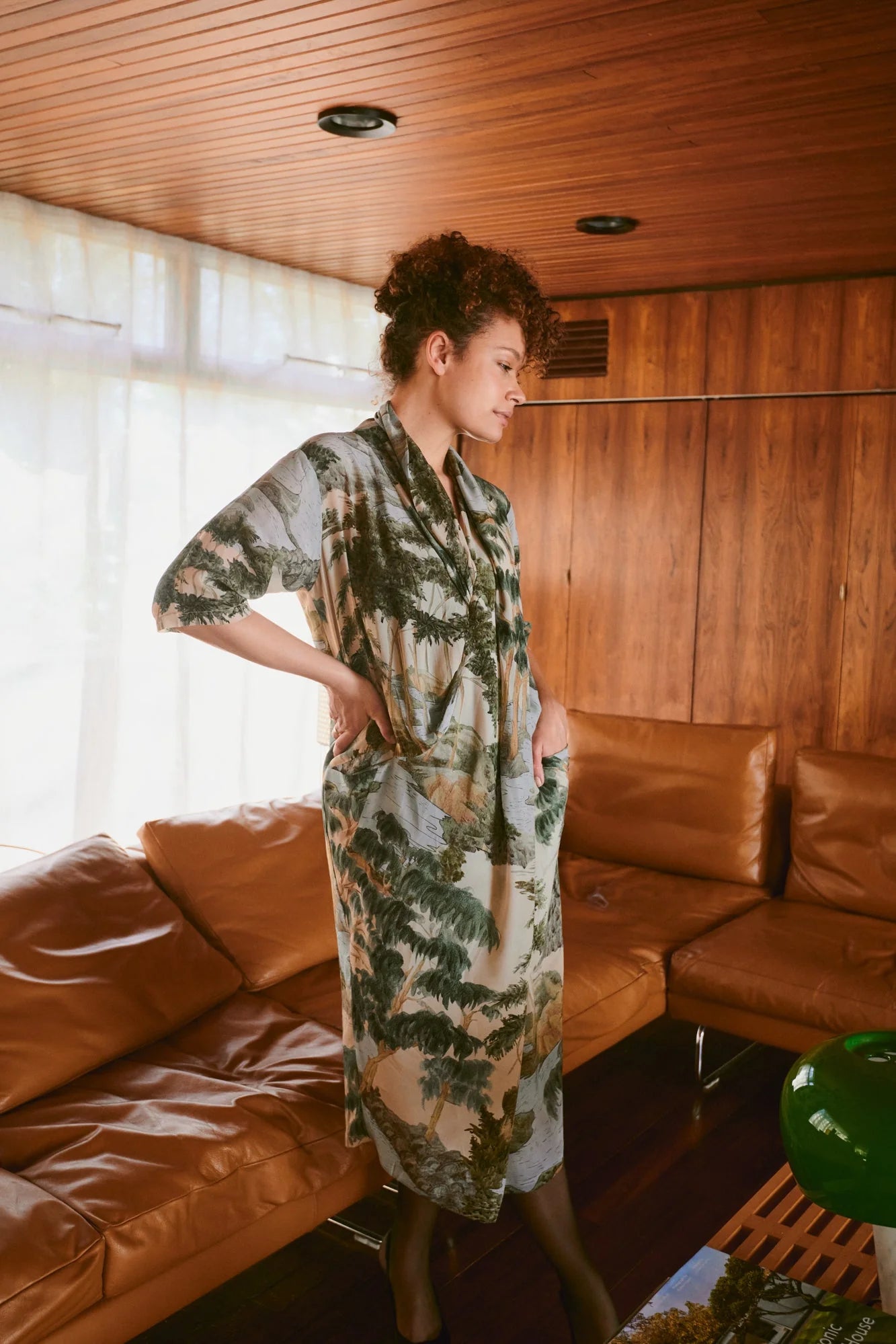 This cowl neck, V-line dress features a pin tuck front, and pockets and can be styled loose or worn with a belt to create a beautiful silhouette.