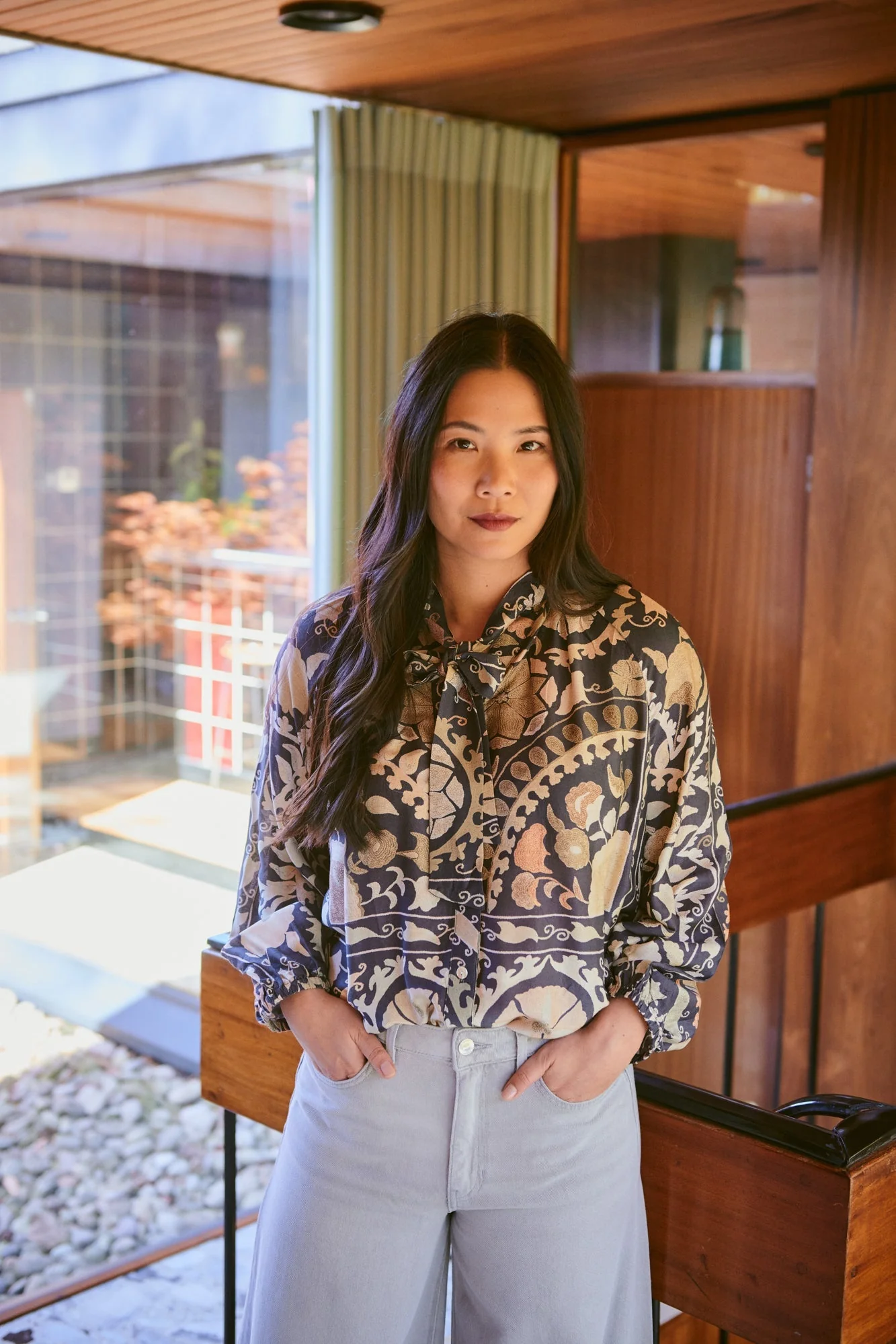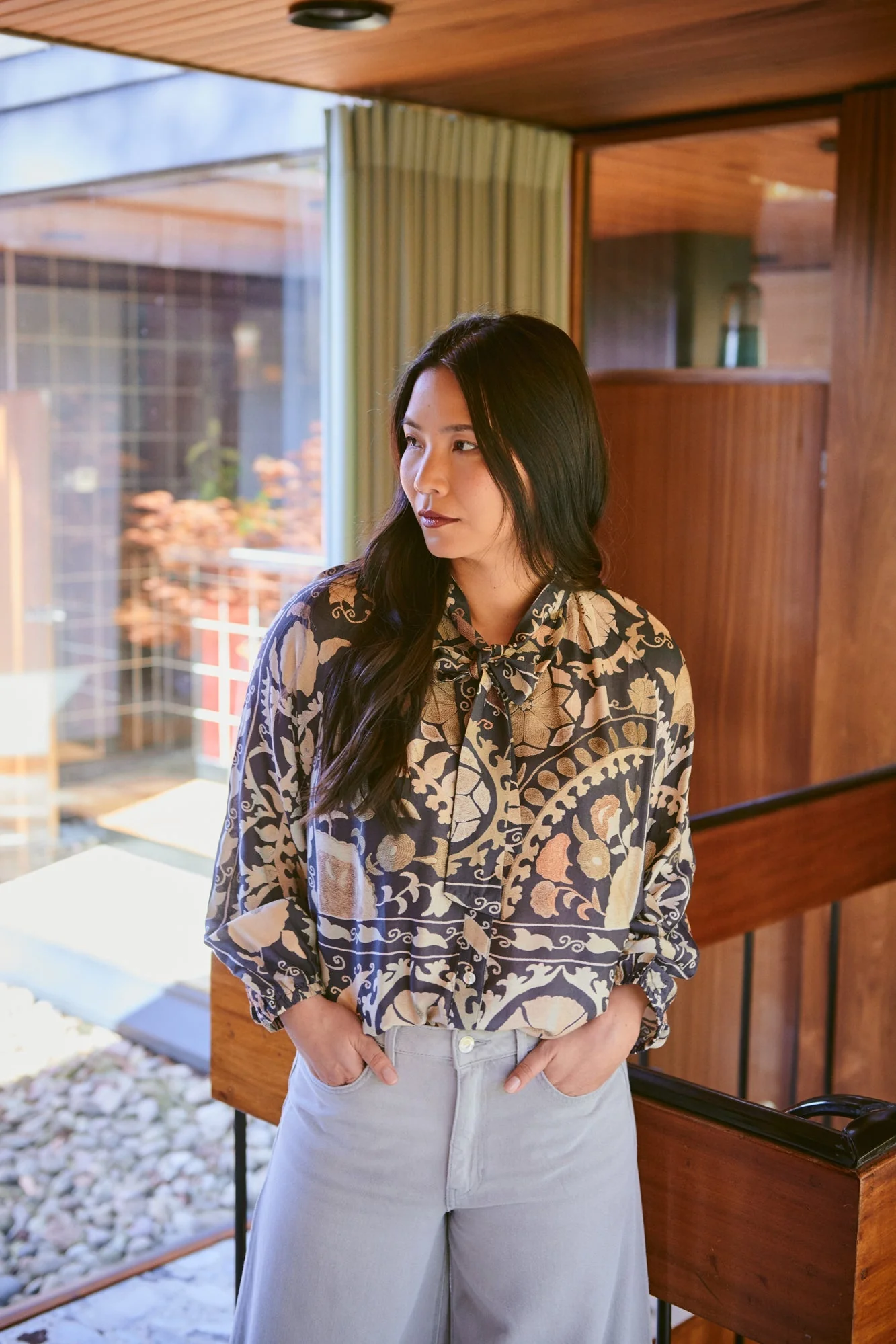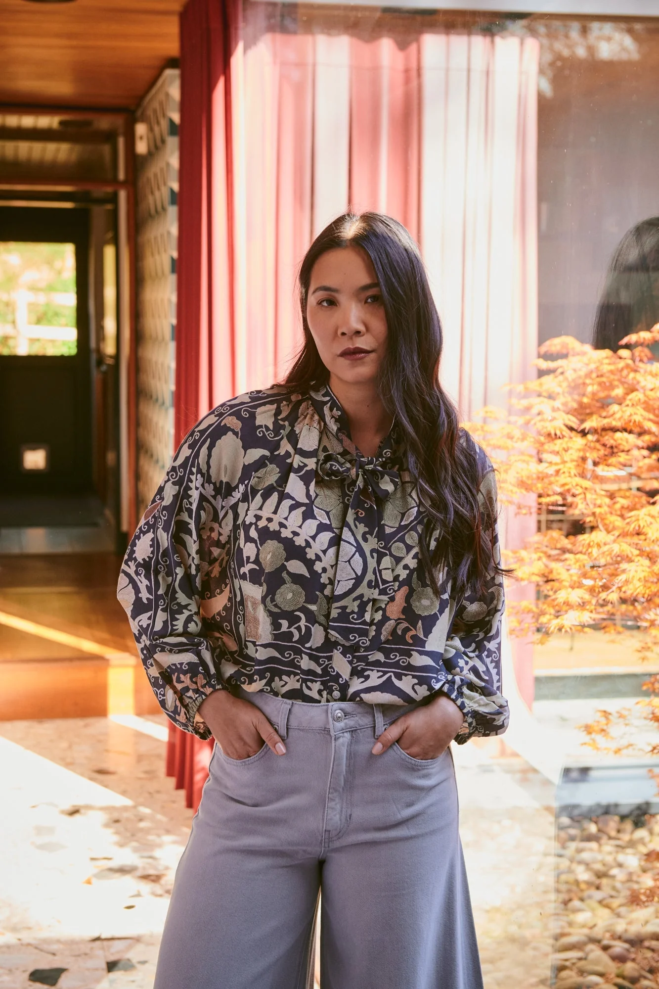 This classic shape blouse shows our prints beautifully. The Pussy-bow can be teamed with our A line skirt for a more formal look or worn or simply as a casual blouse.