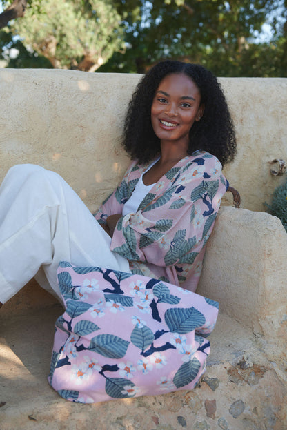 A very gentle and feminine print, our Tree Blossom Pink features elegant white apple blossoms and lush green leaves, overlaid on a blush pink background. Apple blossoms represent peace and long life and are also seen as a symbol of love. Perfect to team with faded denim or creamy white canvas.