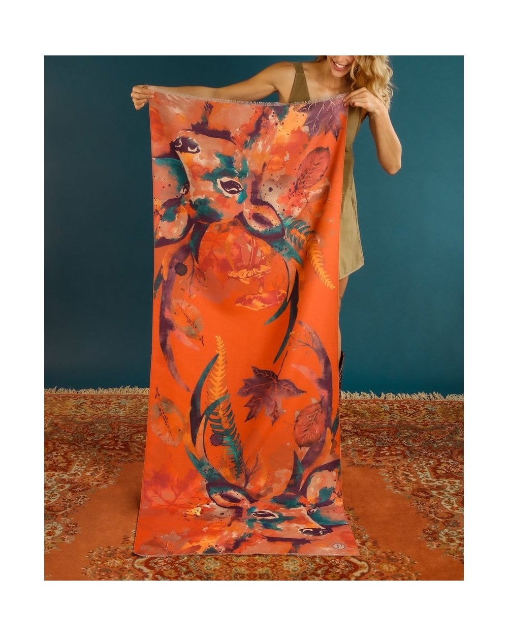 Bold colours aren’t just for summer! Brighten up those cold winter days with this luxurious floral stag print scarf. In a bold burnt orange, featuring a striking stag, this super-soft weighted scarf can be wrapped in many ways to suit your own style.