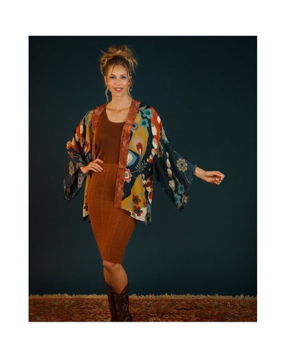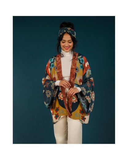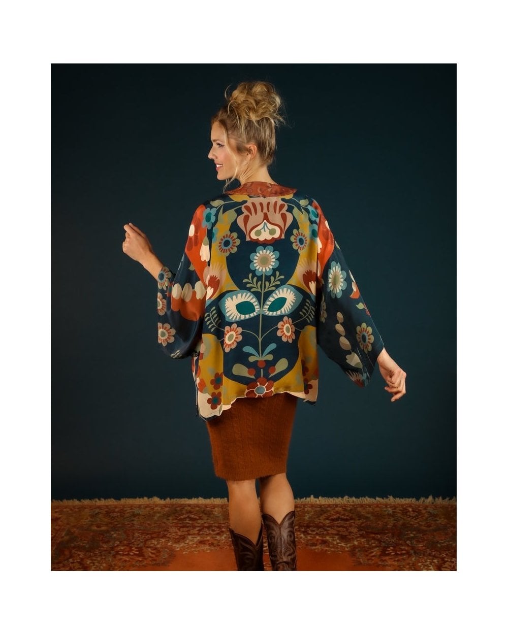 Elevate your dinner party look with this luxurious crepe de chine feel Kimono. Featuring a Scandinavian Floral print with a bold palette, it is perfect for those who love to be playful with their style - a great piece for dressing up a simple outfit.