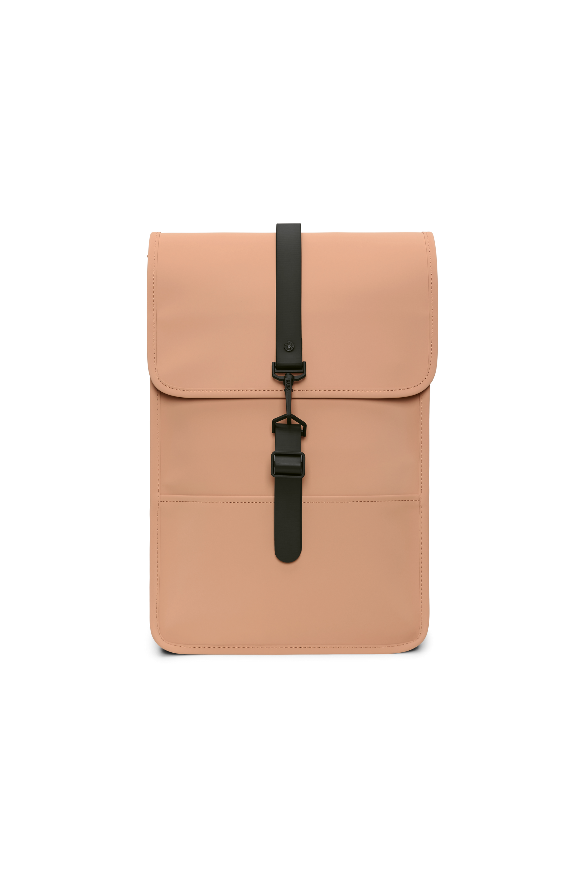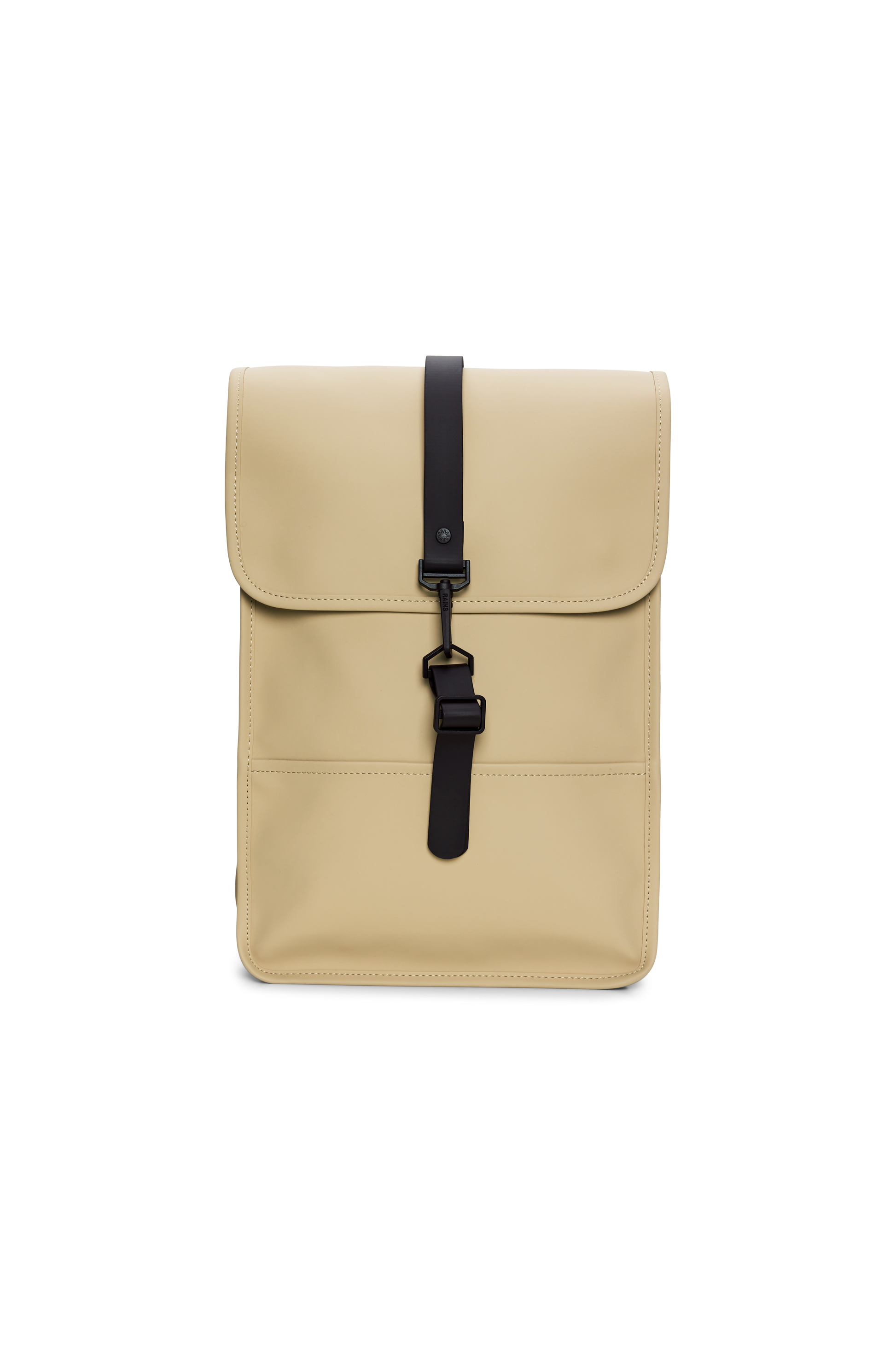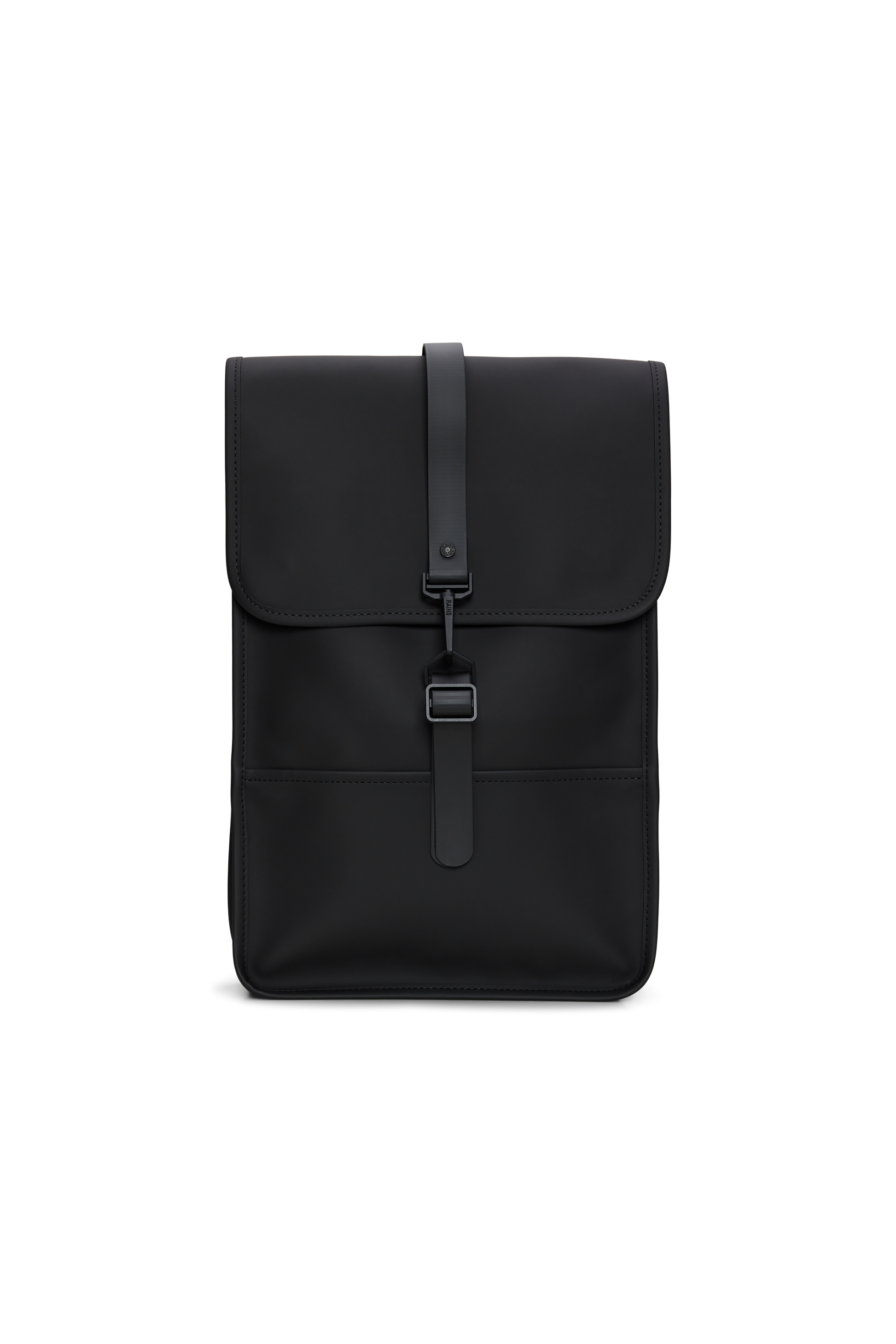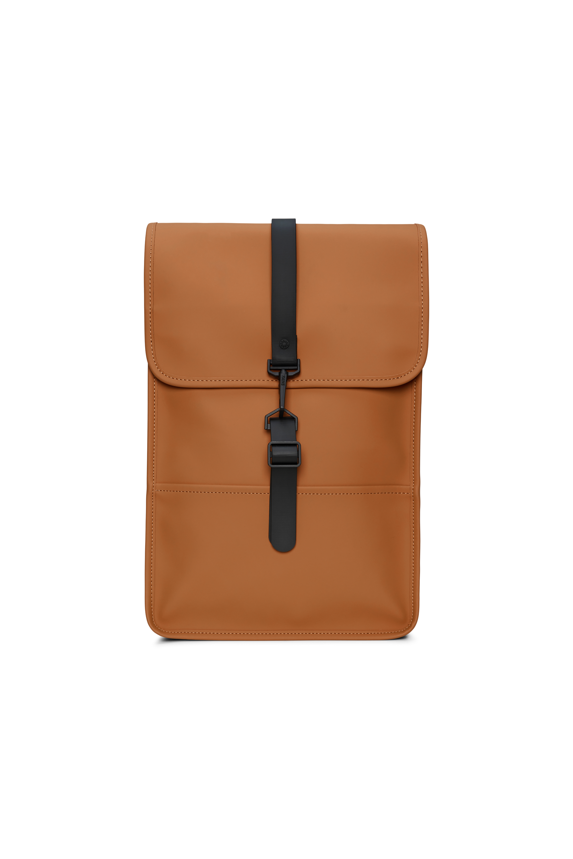 Backpack Mini is a downscaled version of Backpack. The silhouette is characterized by its prominent flap and central strap with carabiner closure. This clean and ever contemporary waterproof rucksack features an internal laptop pocket, a main compartment, and a concealed external phone pocket on the back panel. Backpack Mini is cut in Rains' signature waterproof PU fabric, engineered for carrying strength, durability, and a smooth feel.