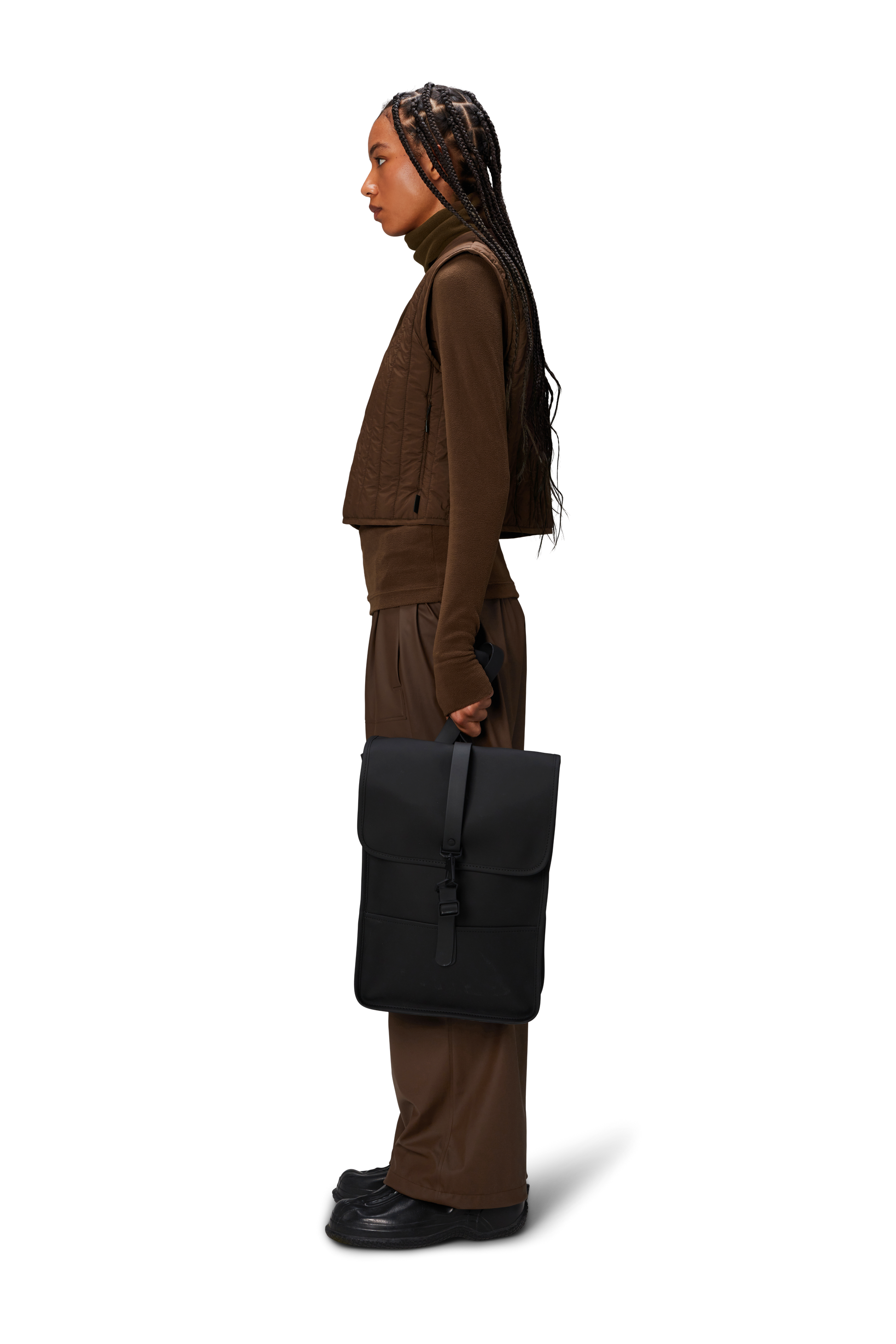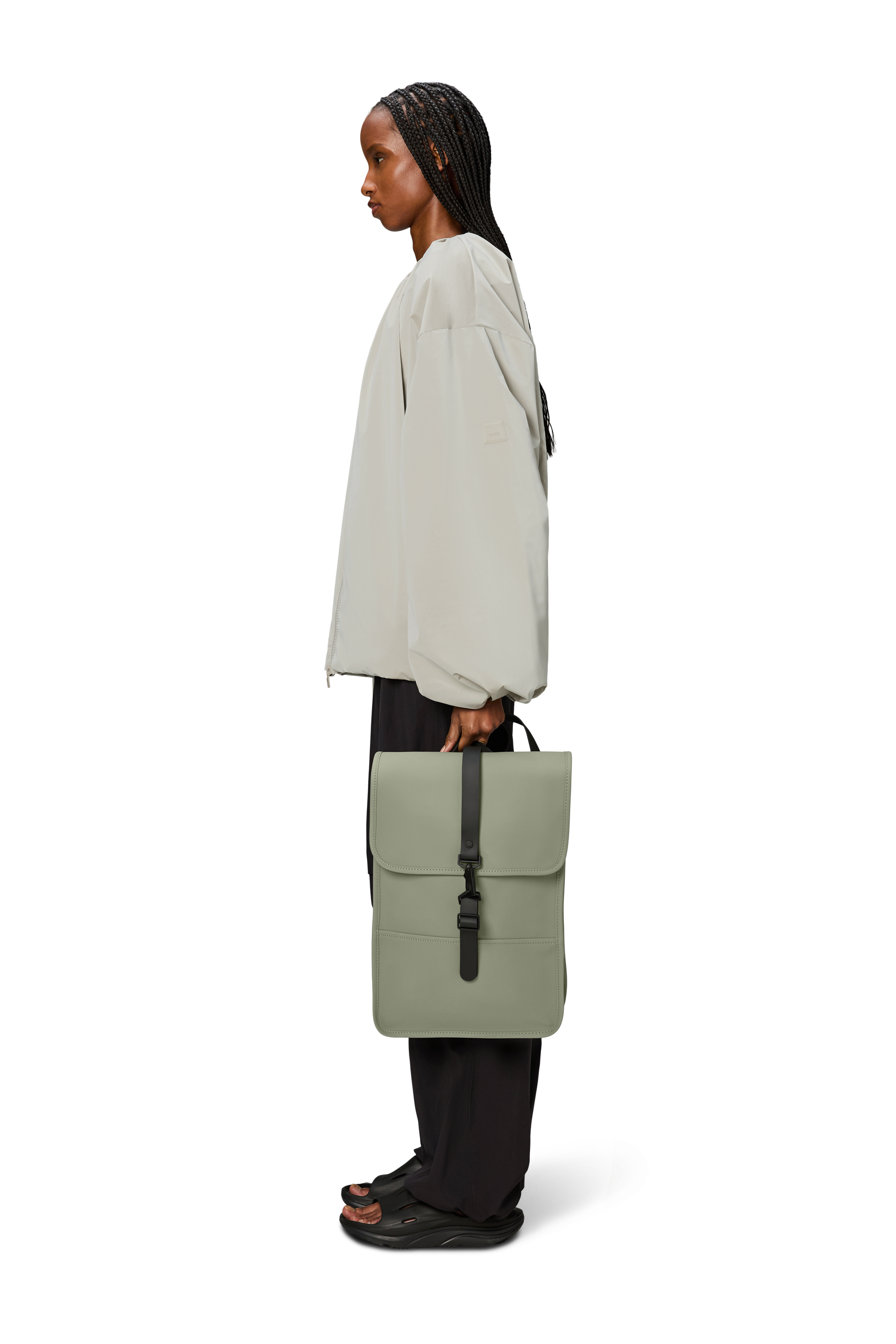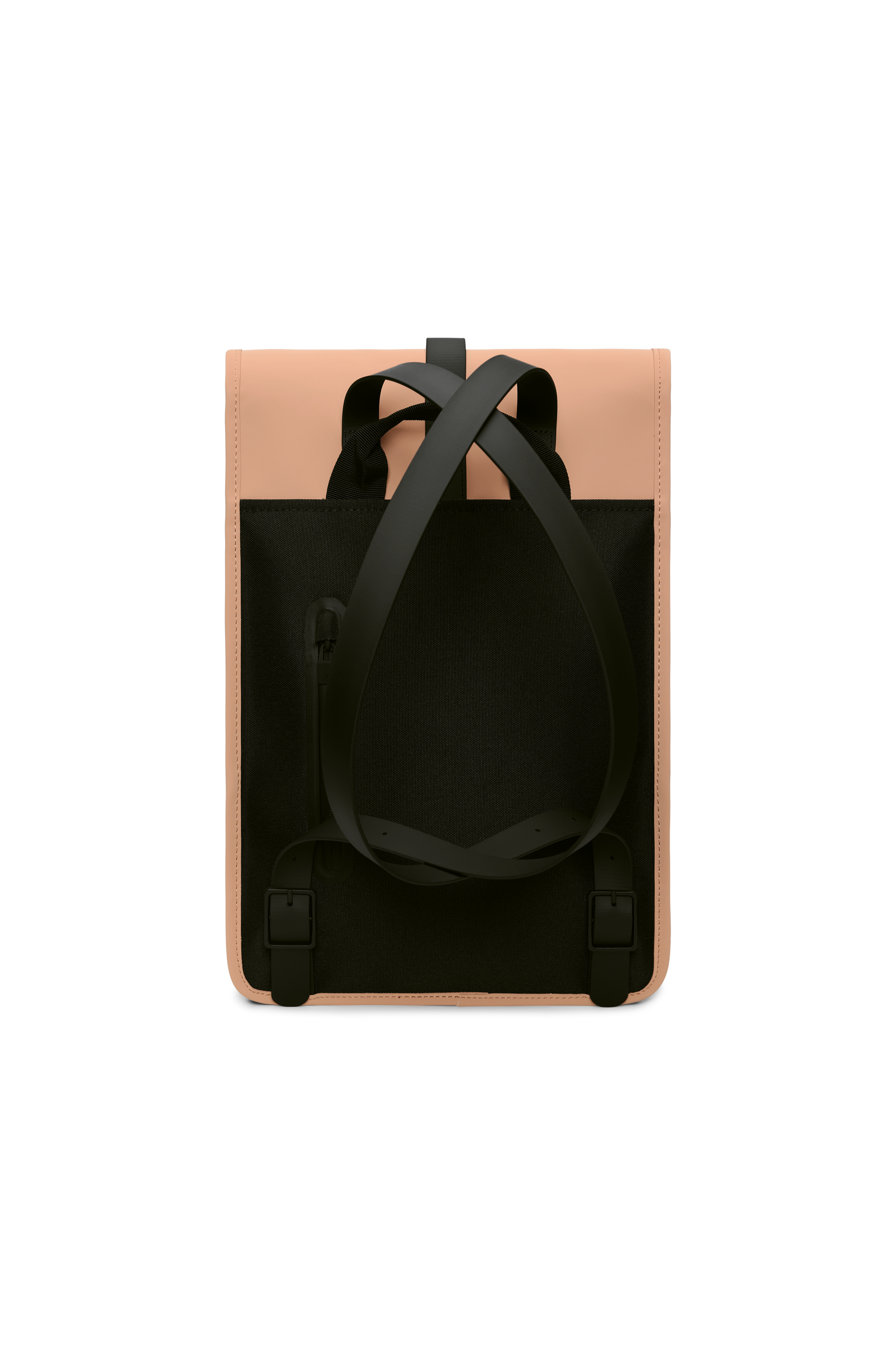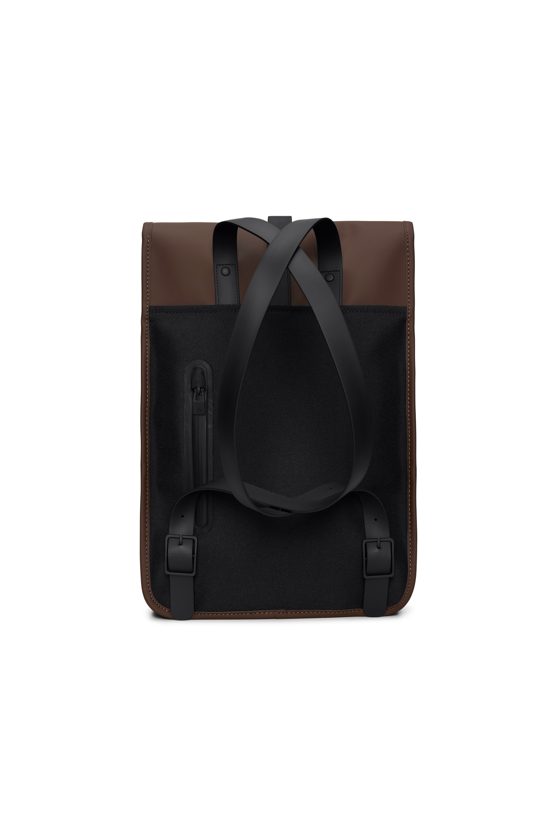 Backpack Mini is a downscaled version of Backpack. The silhouette is characterized by its prominent flap and central strap with carabiner closure. This clean and ever contemporary waterproof rucksack features an internal laptop pocket, a main compartment, and a concealed external phone pocket on the back panel. Backpack Mini is cut in Rains' signature waterproof PU fabric, engineered for carrying strength, durability, and a smooth feel.