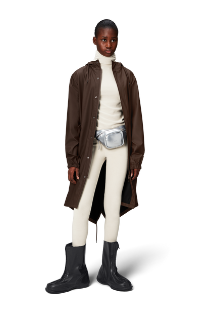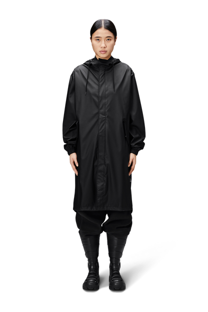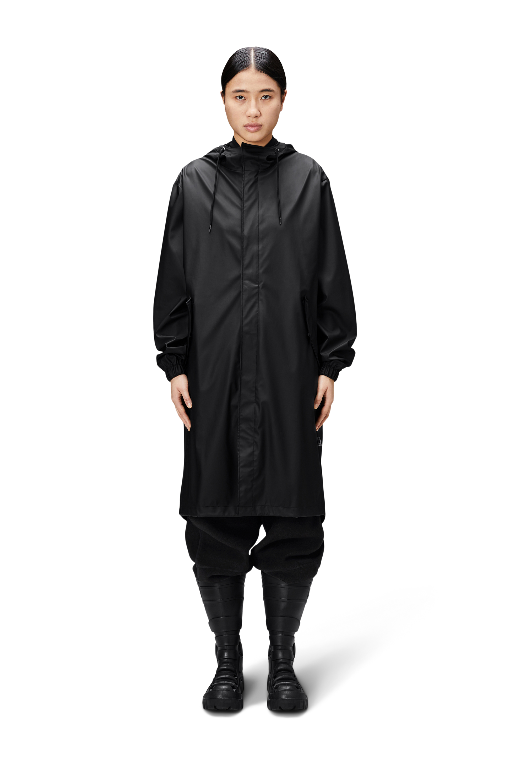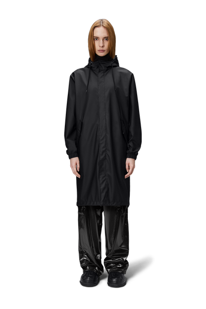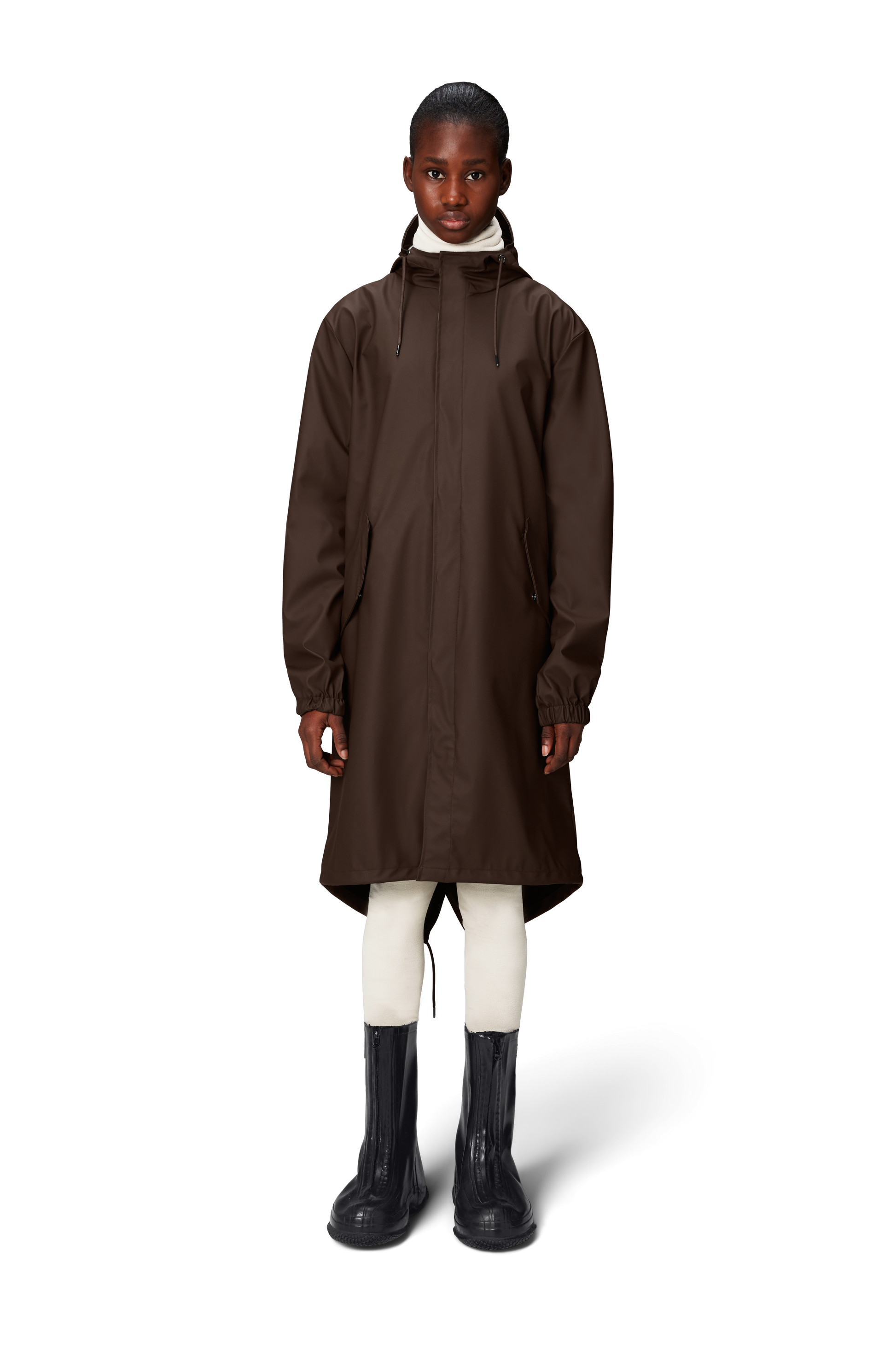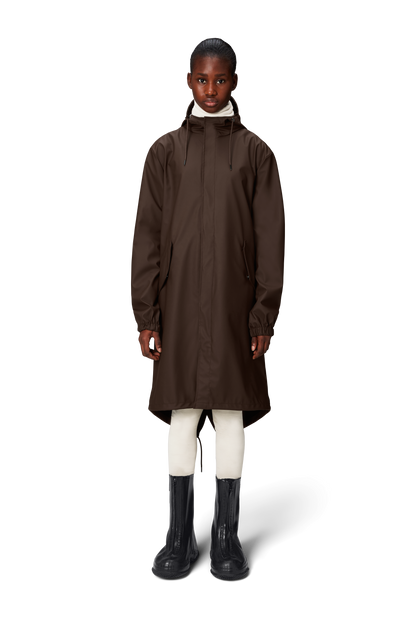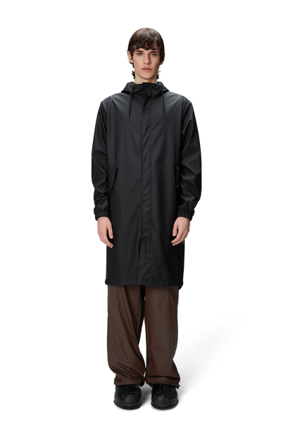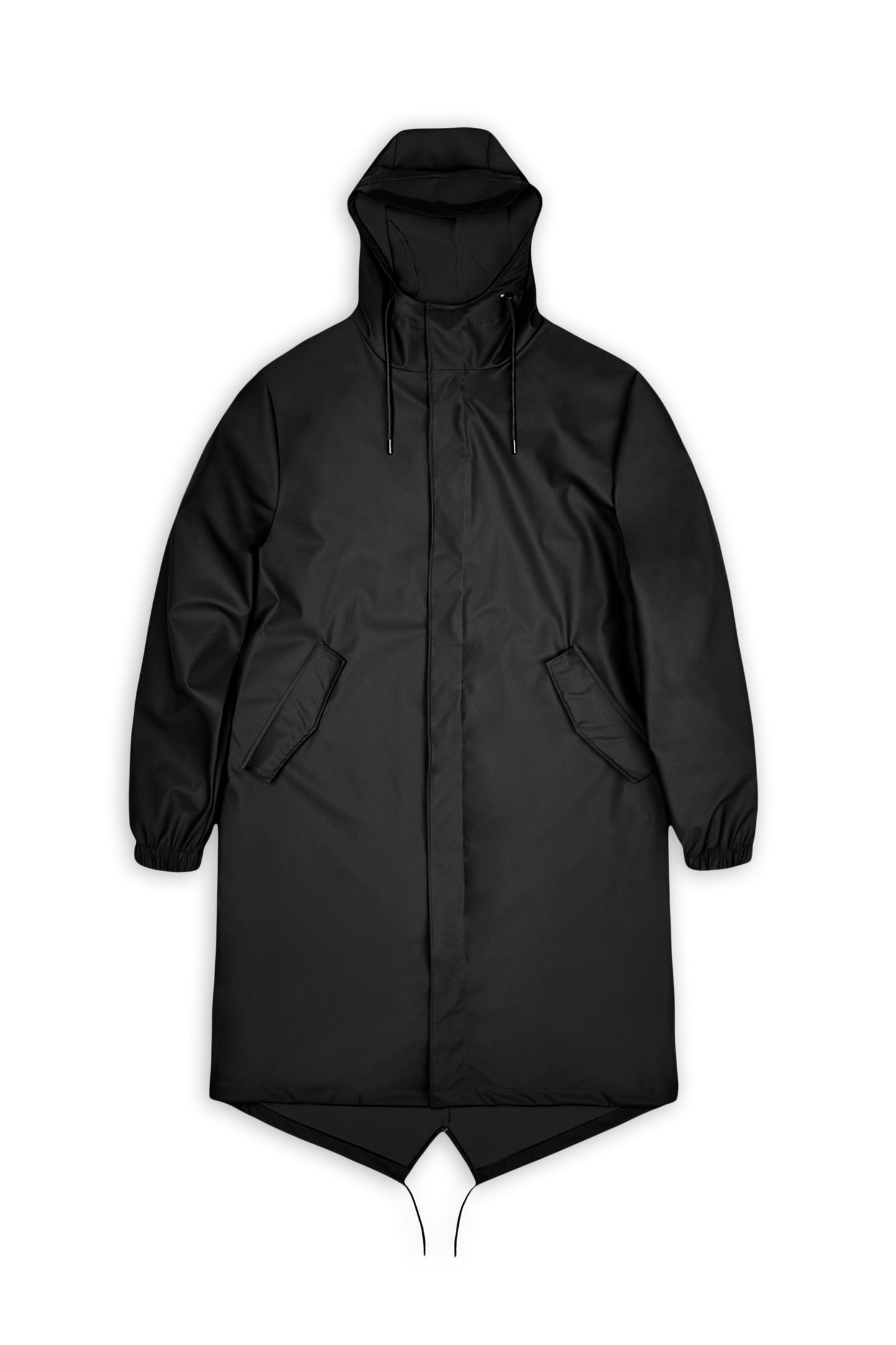 Fishtail Parka is a unisex raincoat. Characterized by its pared-back aesthetic and drawstring fishtail hem in parka-length. This design features utility-inspired pockets, vented back yoke and a hood with built-in cap and drawstring. Style is finished with elasticated cuffs for a tighter fit around wrist. Fishtail Parka has a casual fit with an elegant drape, making it a clear cut raincoat for daily commutes. The coated zip closure is concealed by a placket with snap fastenings. This rain jacket is cut from Rains' signature PU fabric and features welded seams. The finish is lightweight with a smooth feel.