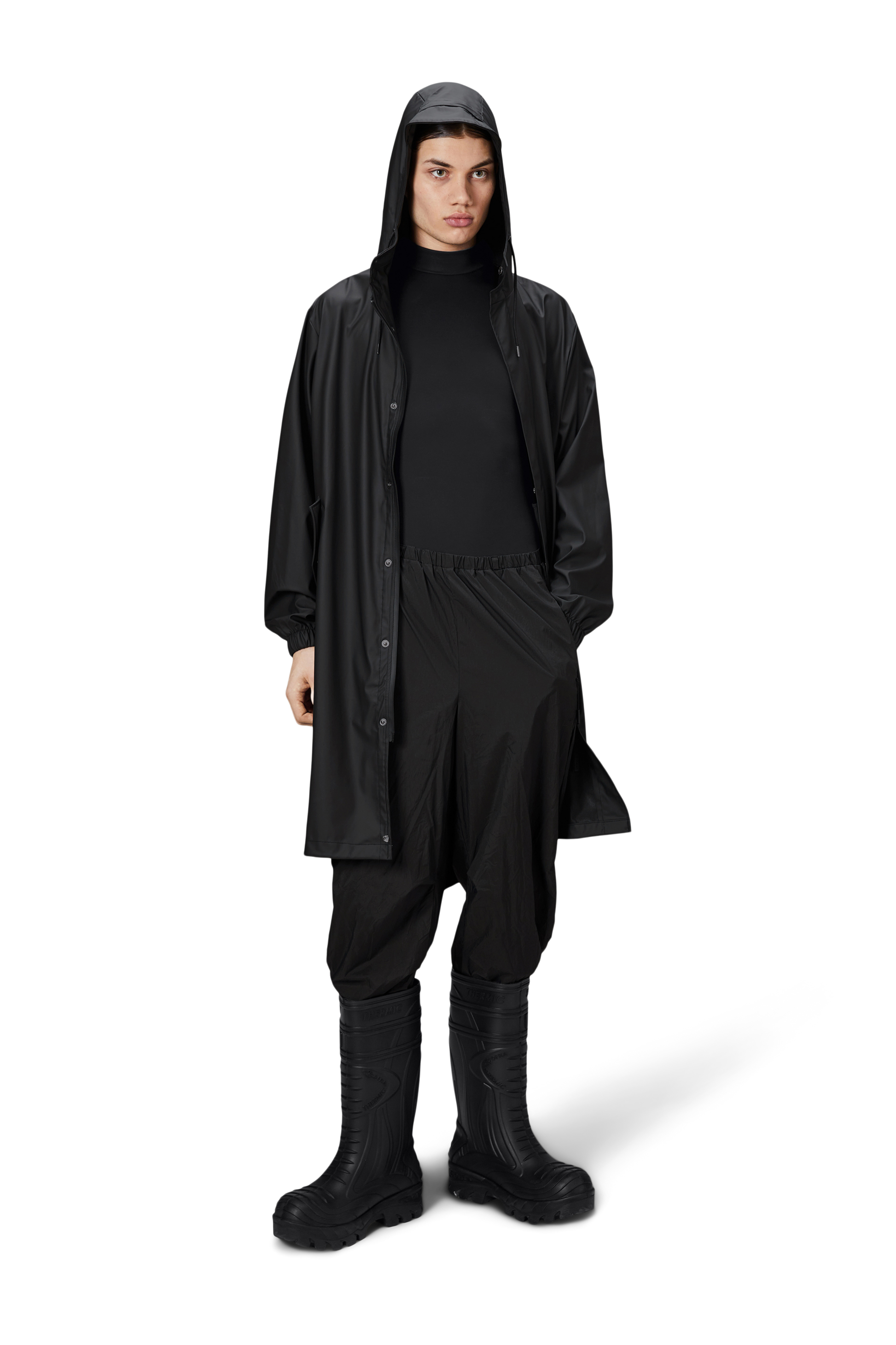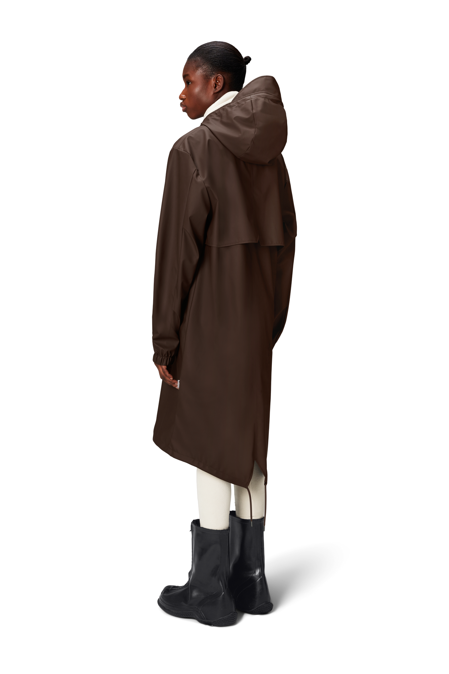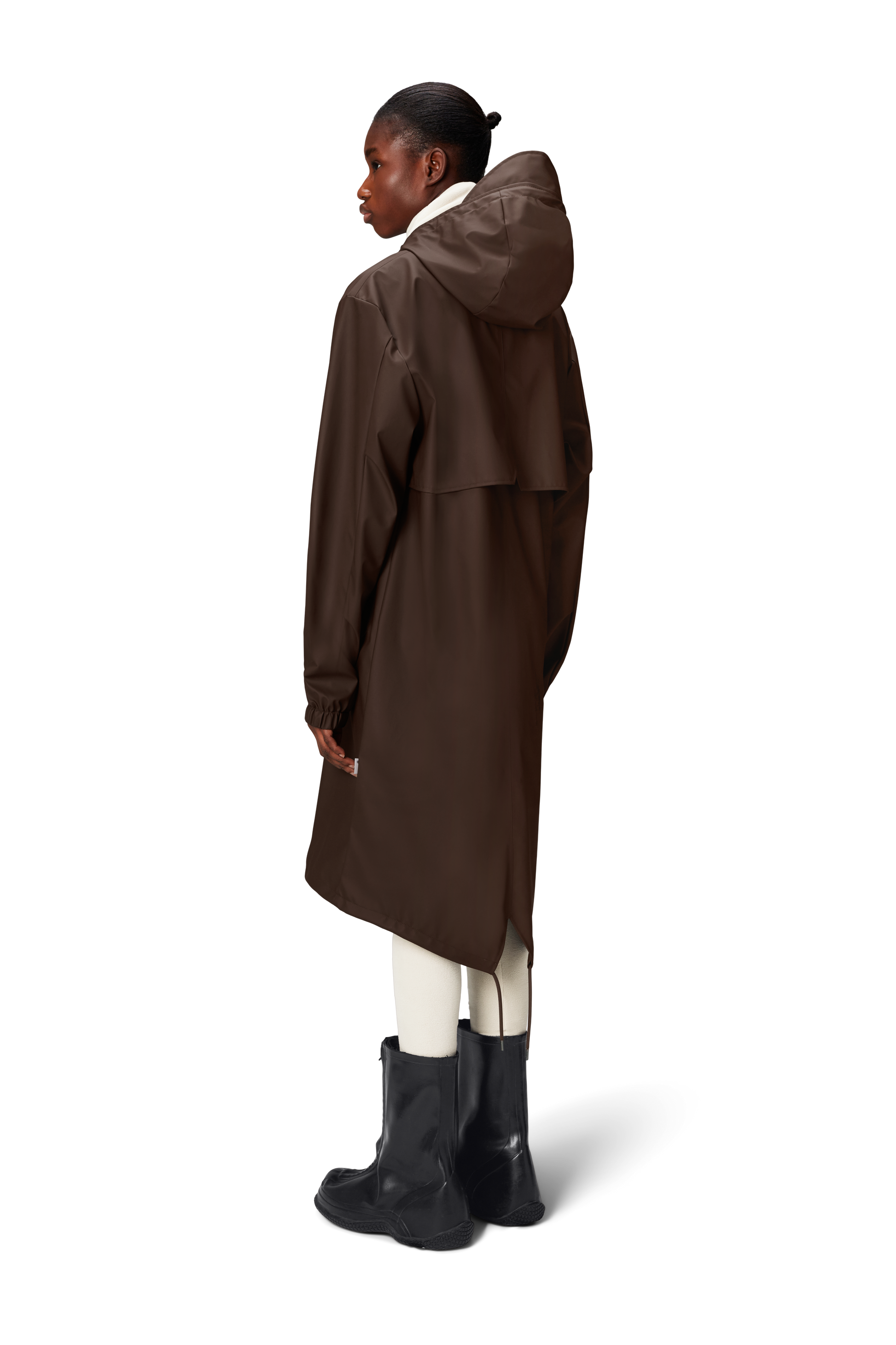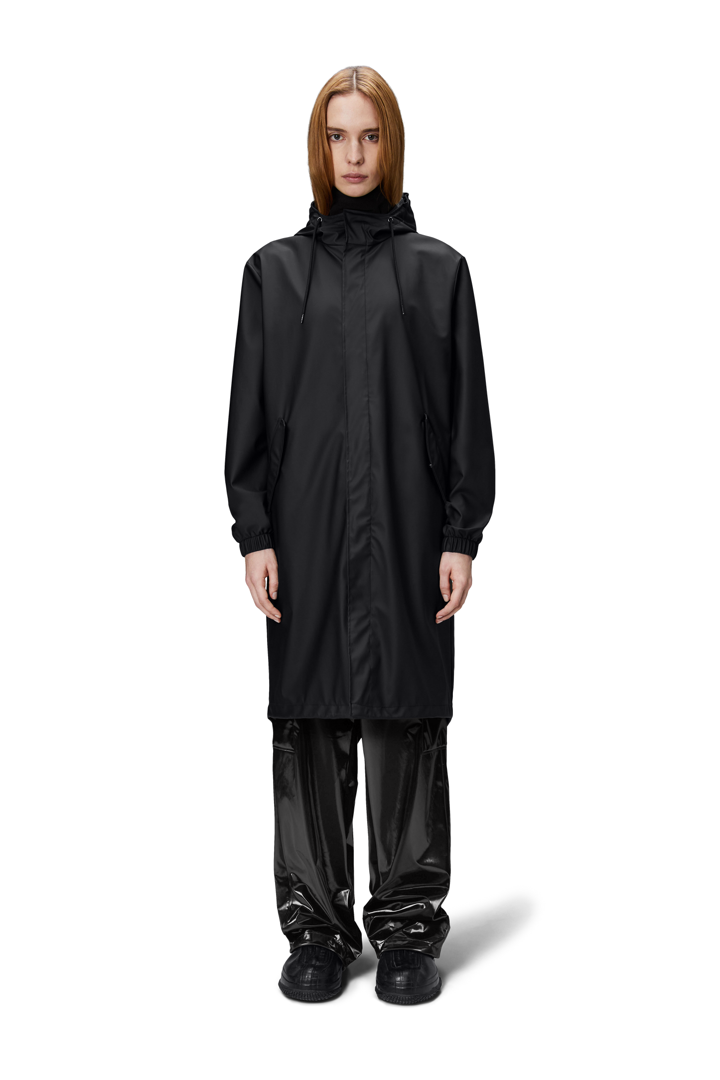Fishtail Parka is a unisex raincoat. Characterized by its pared-back aesthetic and drawstring fishtail hem in parka-length. This design features utility-inspired pockets, vented back yoke and a hood with built-in cap and drawstring. Style is finished with elasticated cuffs for a tighter fit around wrist. Fishtail Parka has a casual fit with an elegant drape, making it a clear cut raincoat for daily commutes. The coated zip closure is concealed by a placket with snap fastenings. This rain jacket is cut from Rains' signature PU fabric and features welded seams. The finish is lightweight with a smooth feel.