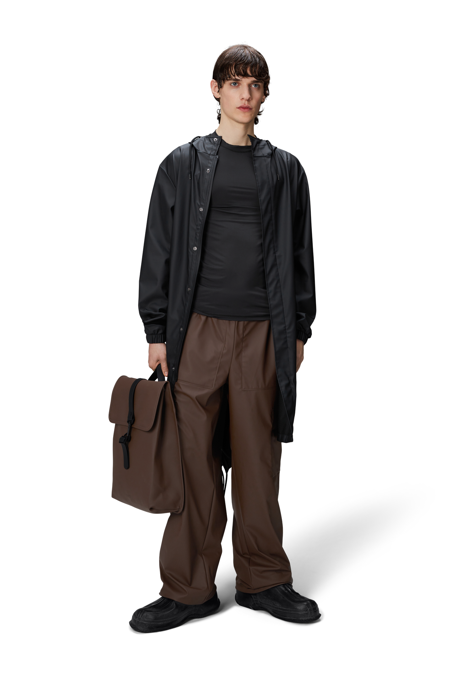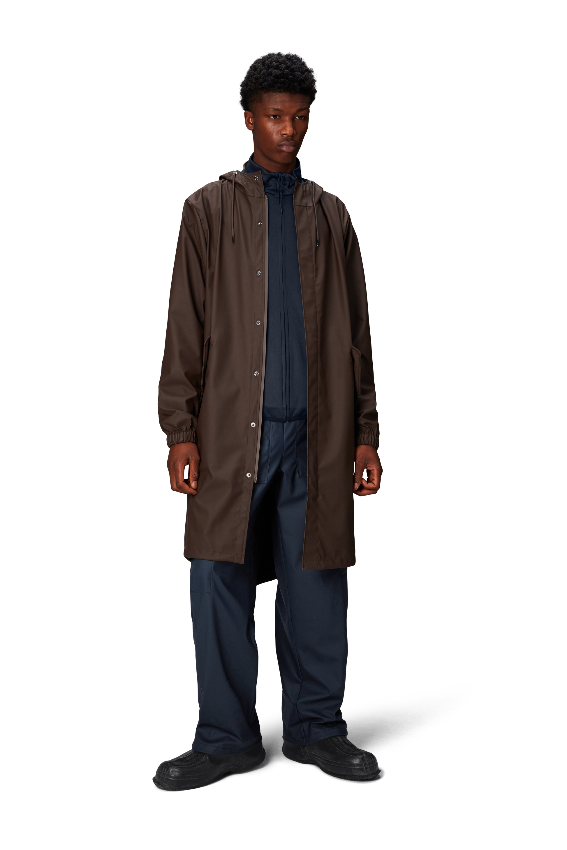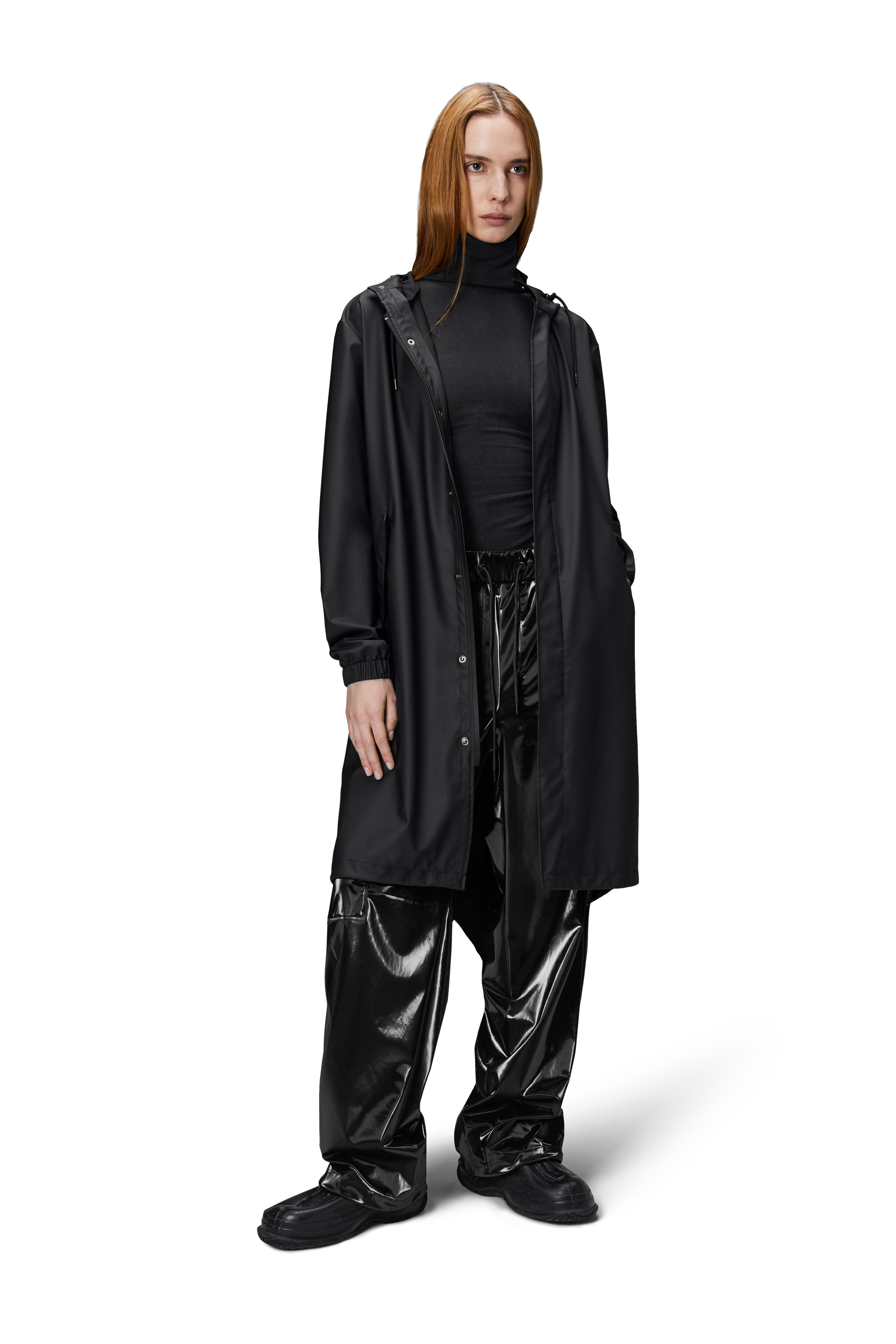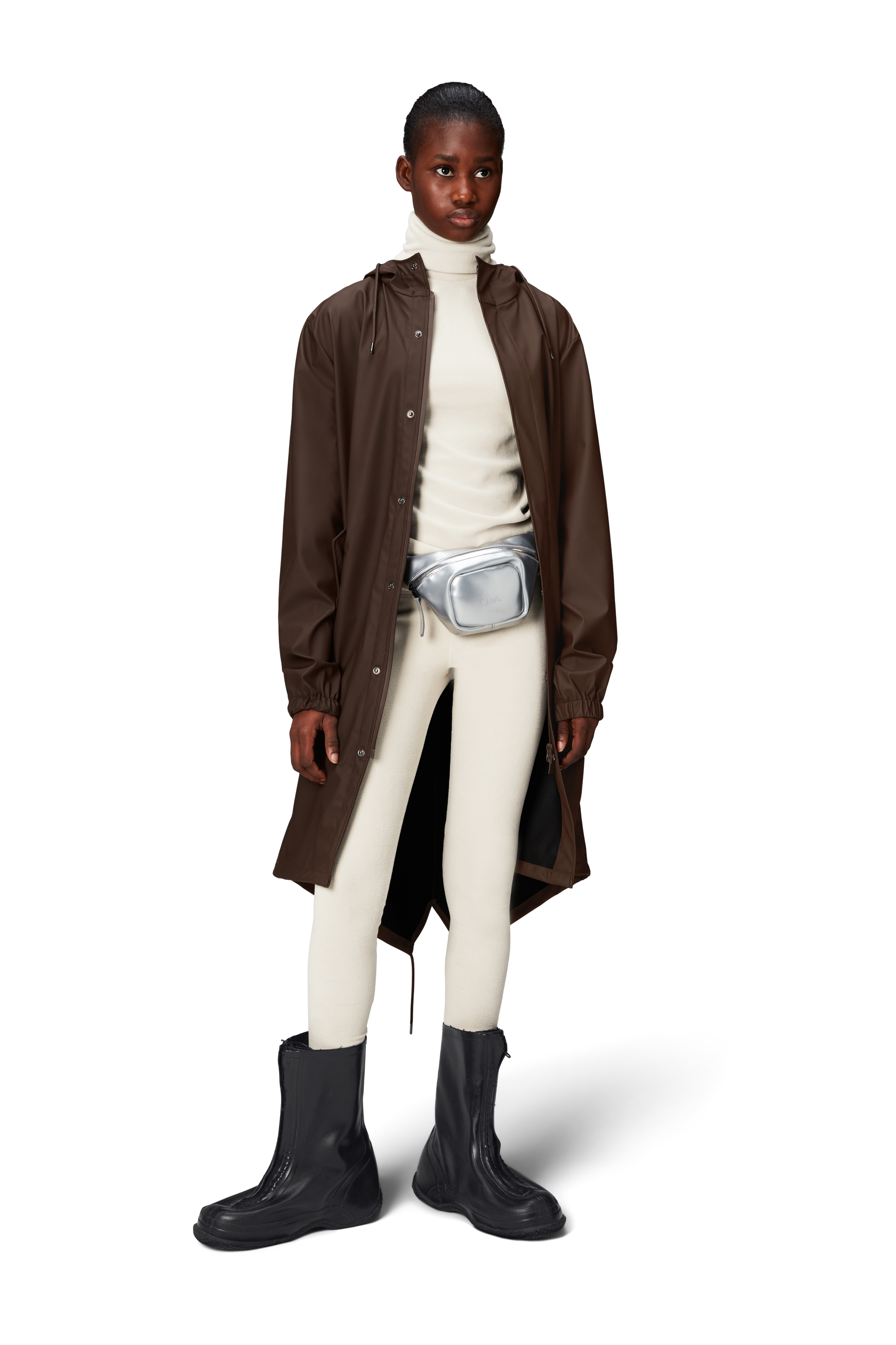 Fishtail Parka is a unisex raincoat. Characterized by its pared-back aesthetic and drawstring fishtail hem in parka-length. This design features utility-inspired pockets, vented back yoke and a hood with built-in cap and drawstring. Style is finished with elasticated cuffs for a tighter fit around wrist. Fishtail Parka has a casual fit with an elegant drape, making it a clear cut raincoat for daily commutes. The coated zip closure is concealed by a placket with snap fastenings. This rain jacket is cut from Rains' signature PU fabric and features welded seams. The finish is lightweight with a smooth feel.