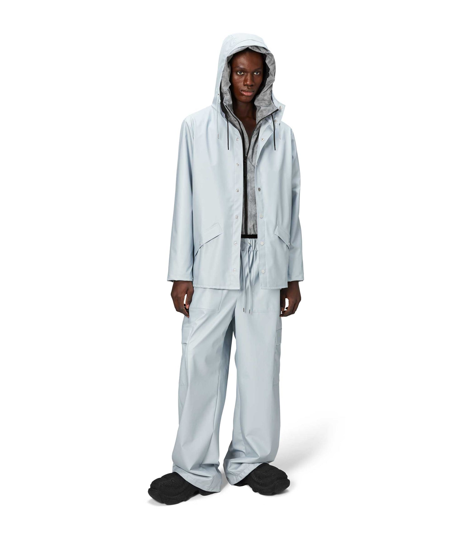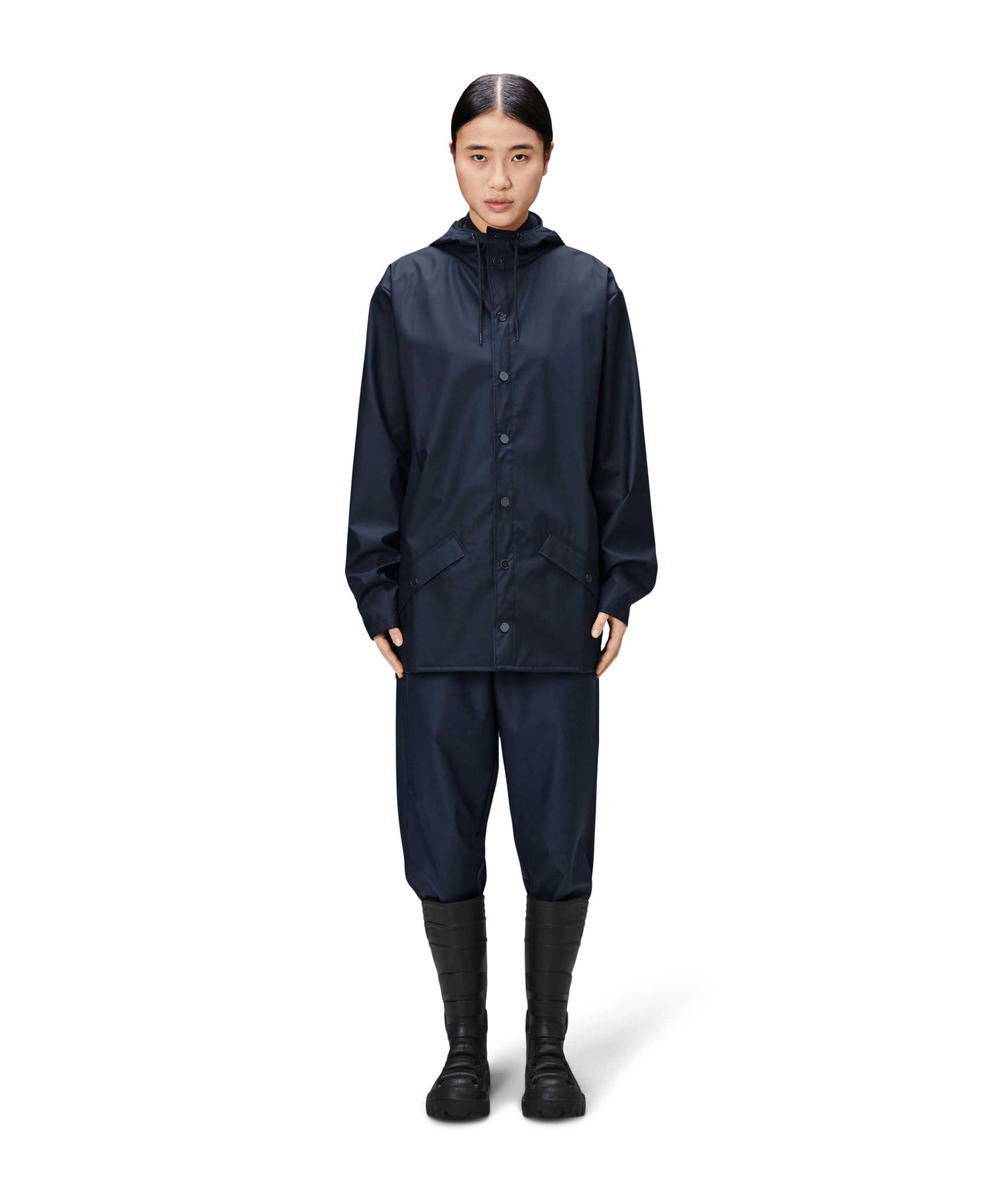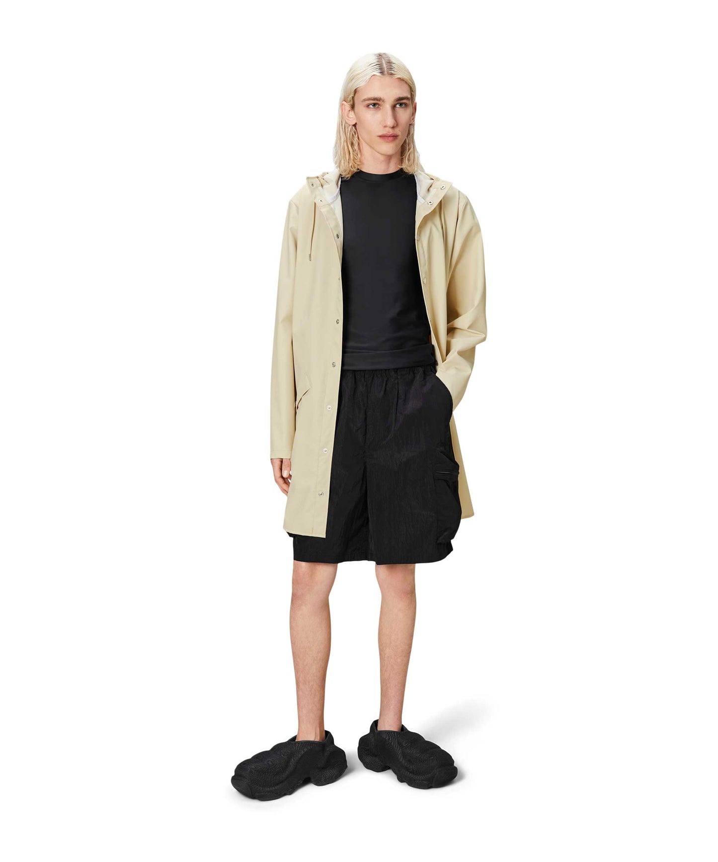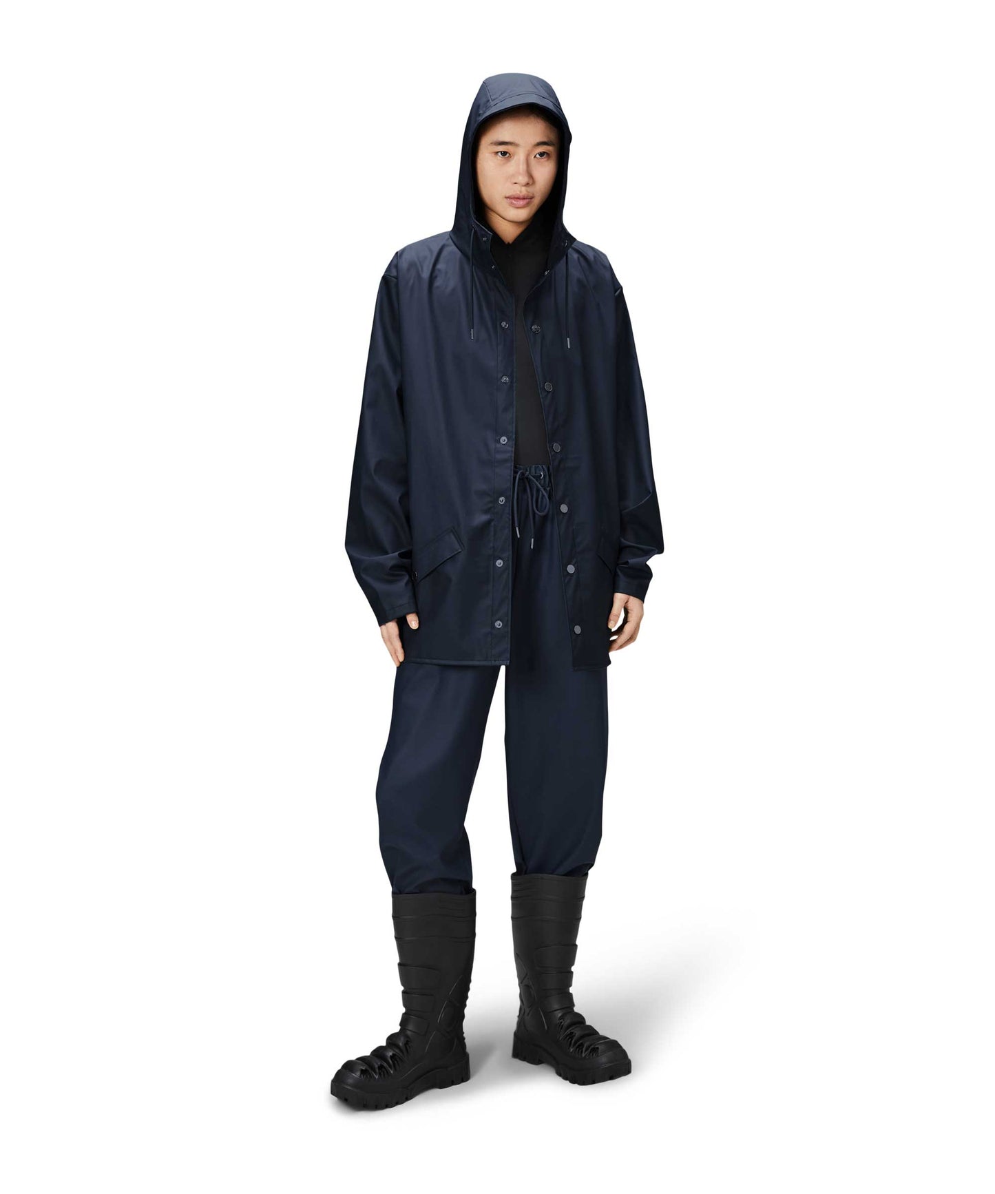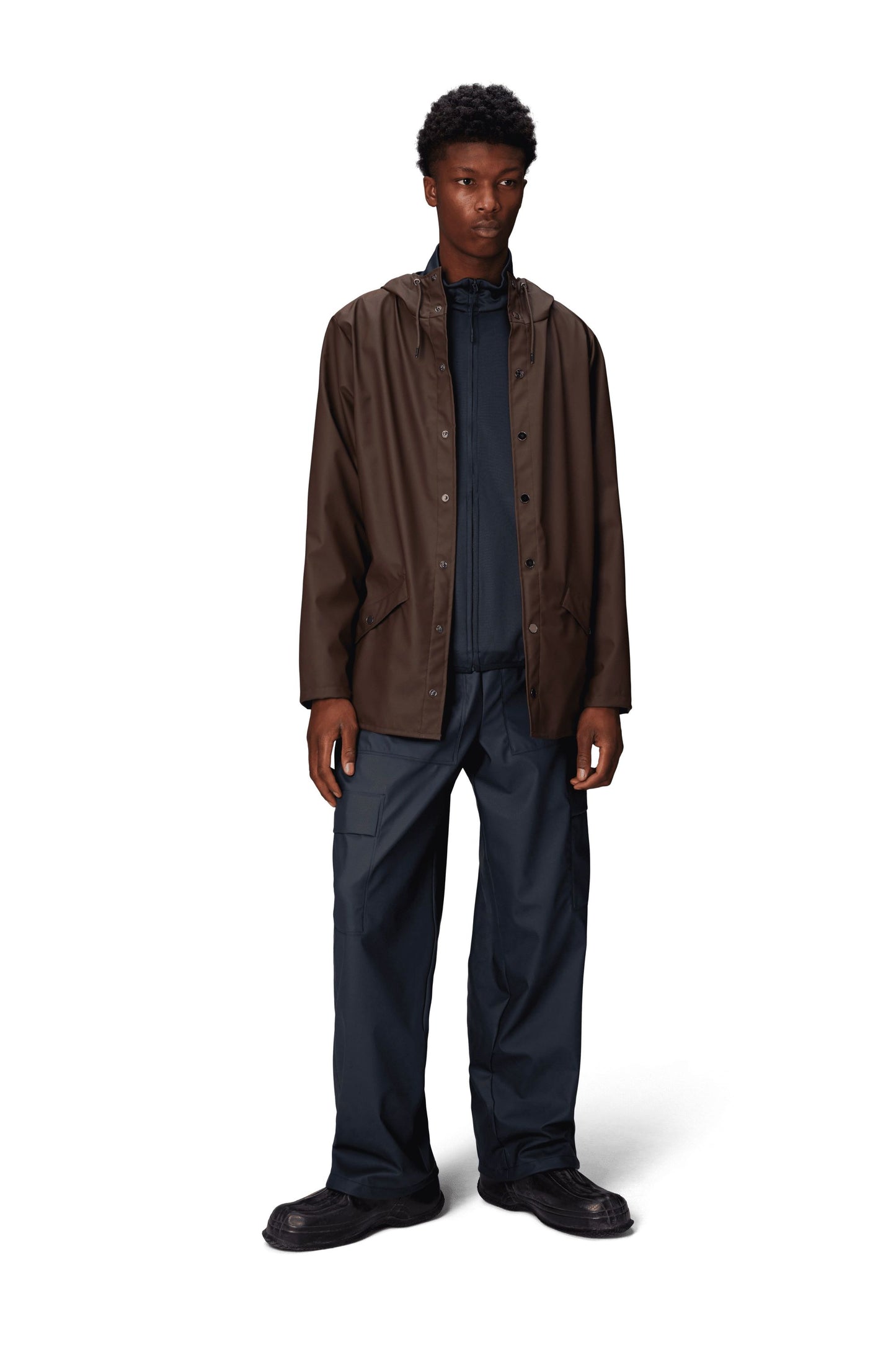 This contemporary unisex Rains Jacket is characterized by a minimal silhouette and high functionality. Featuring a placket with snap fastenings for closure, hood with built-in cap and two side pockets with snaps, it is completed with under-arm eyelets and a back yoke with concealed vents for breathable comfort. The sleeves are finished with snaps for an adjustable fit. The easy-to-wear design features Rains' signature PU fabric and features welded seams, for a lightweight finish and smooth feel.