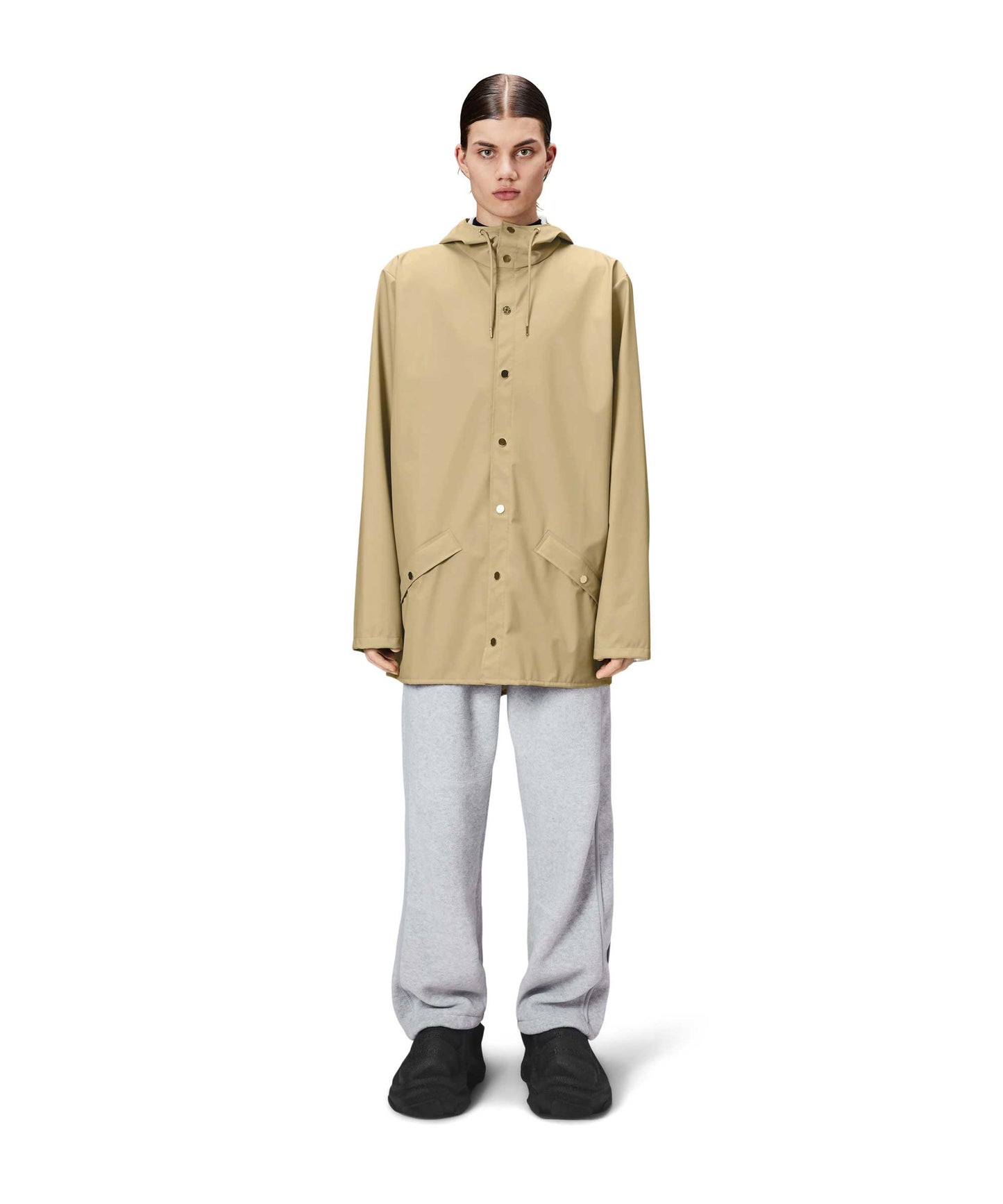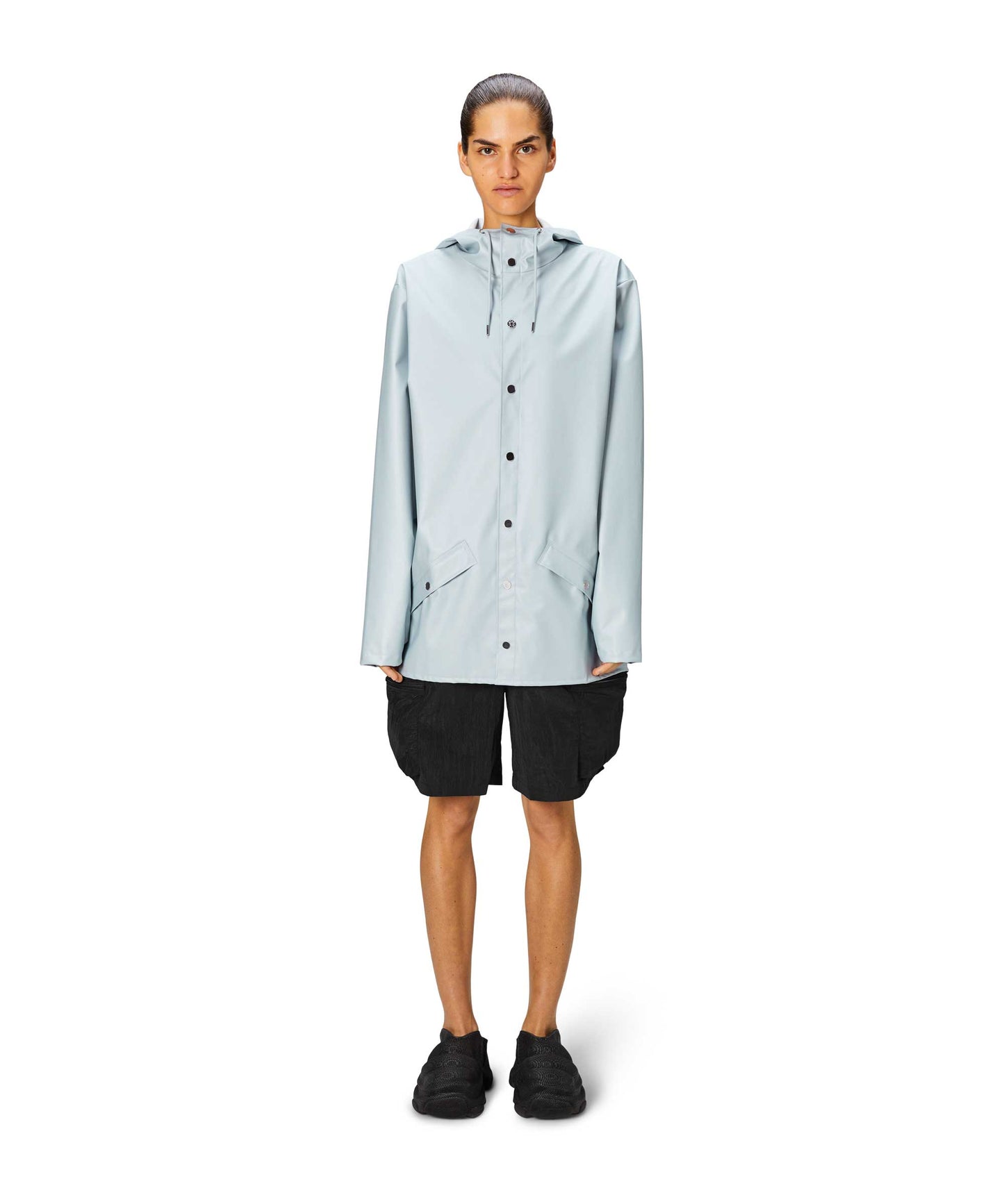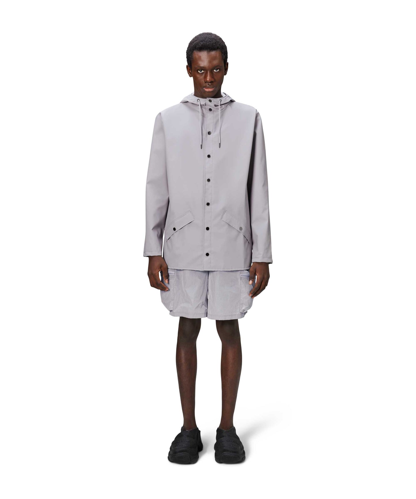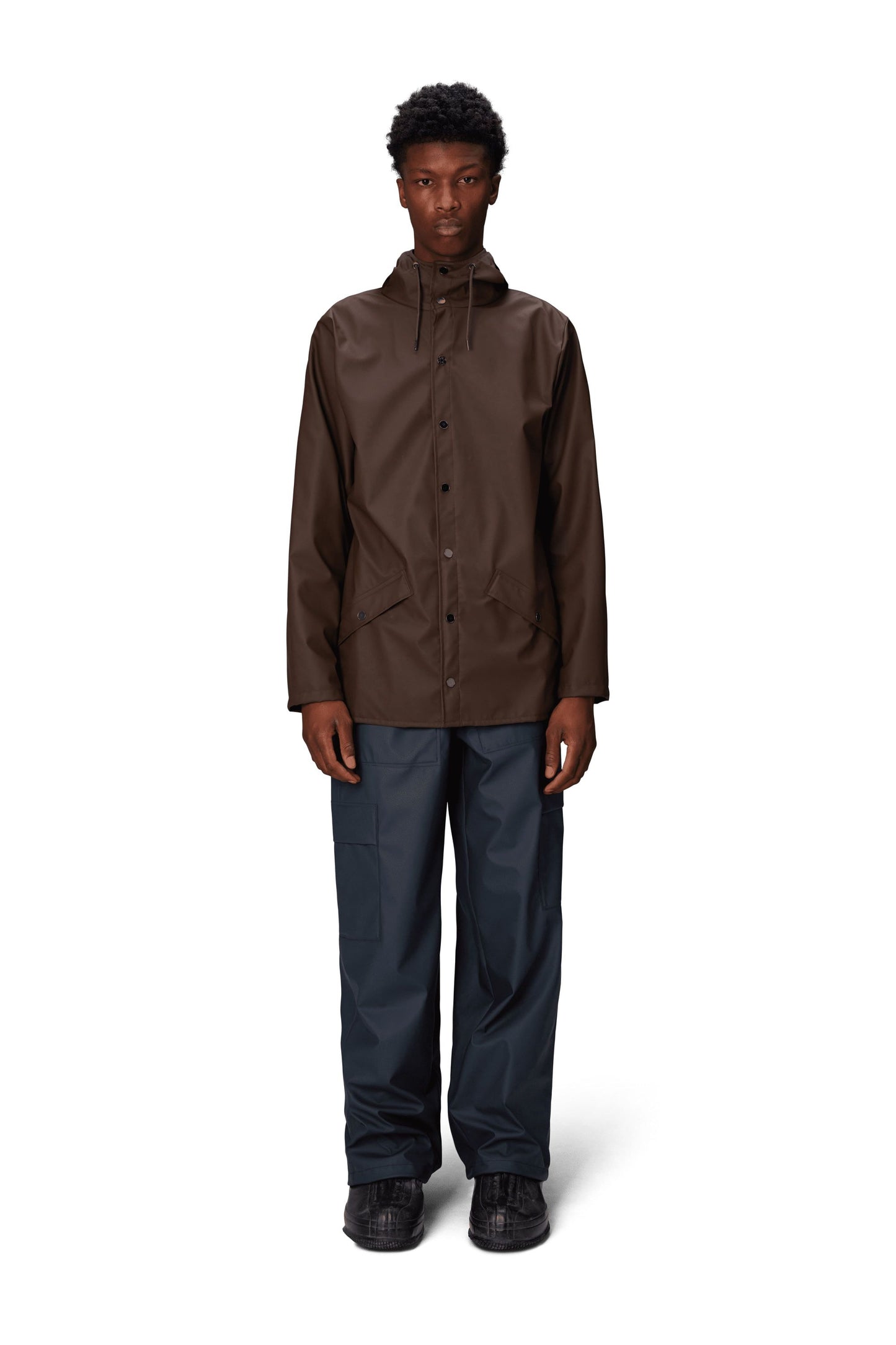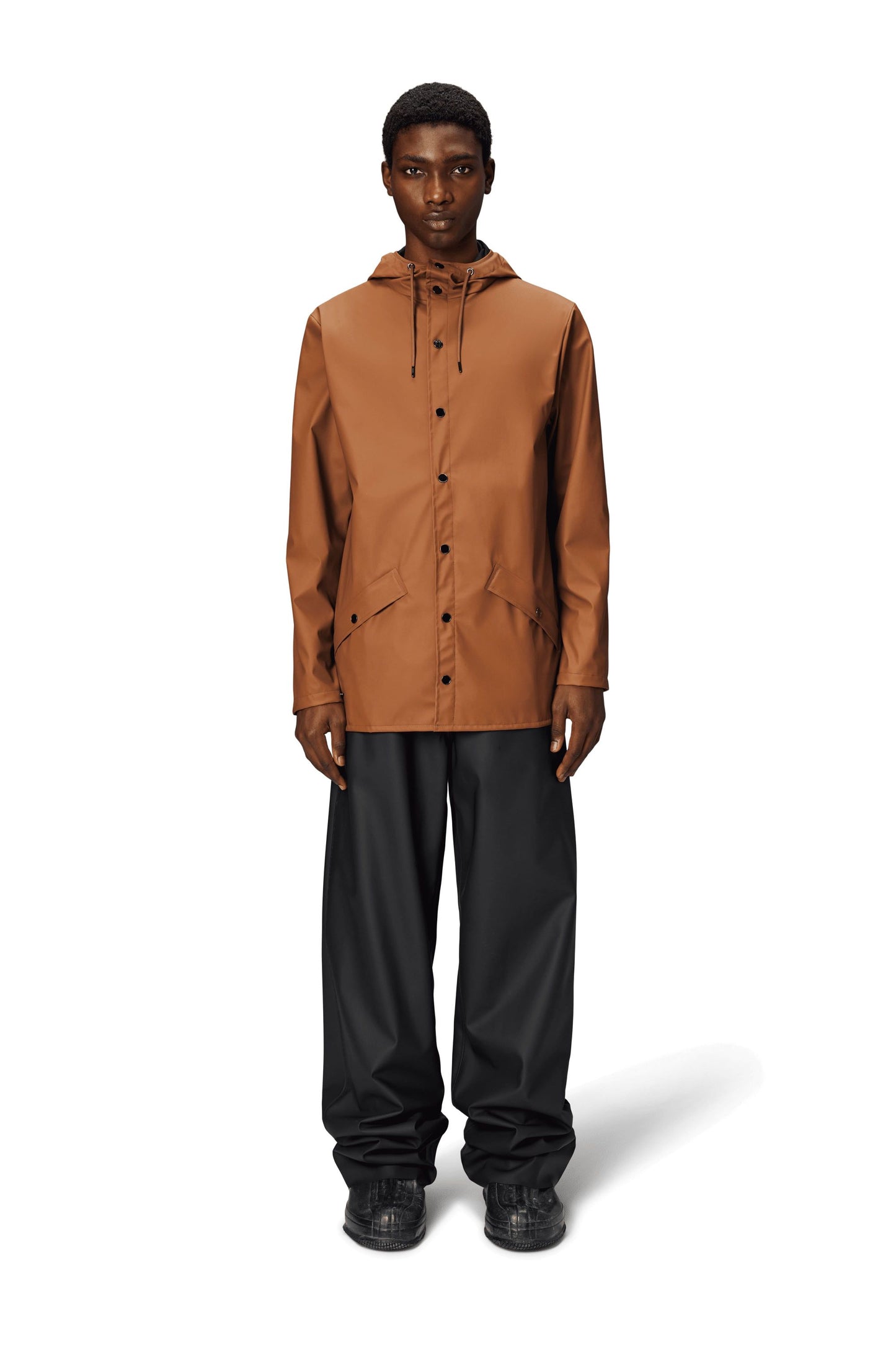 This contemporary unisex Rains Jacket is characterized by a minimal silhouette and high functionality. Featuring a placket with snap fastenings for closure, hood with built-in cap and two side pockets with snaps, it is completed with under-arm eyelets and a back yoke with concealed vents for breathable comfort. The sleeves are finished with snaps for an adjustable fit. The easy-to-wear design features Rains' signature PU fabric and features welded seams, for a lightweight finish and smooth feel.