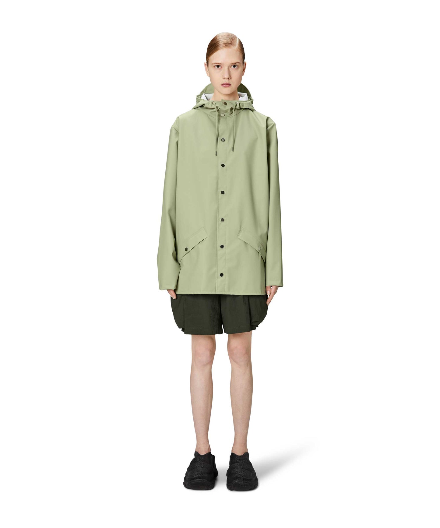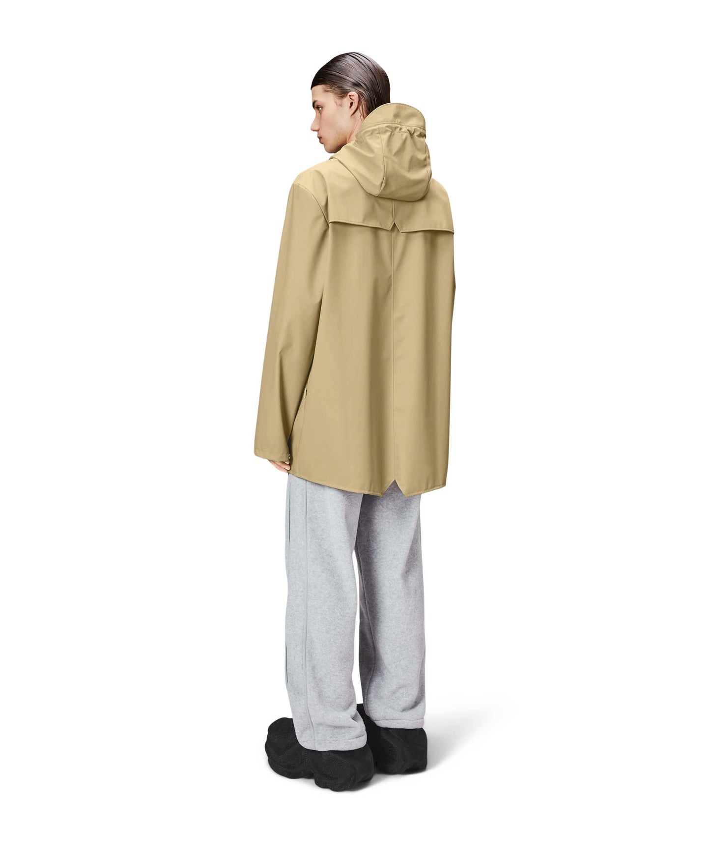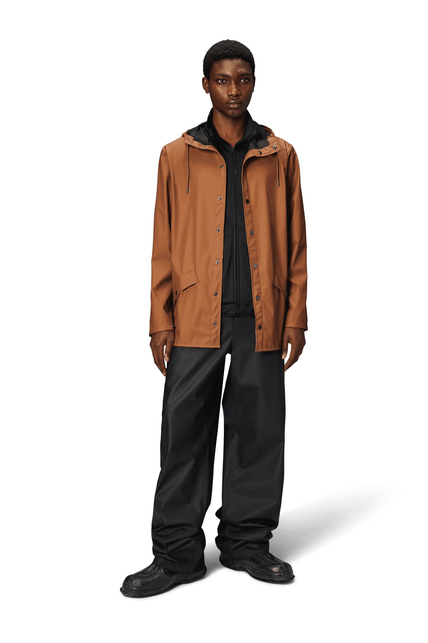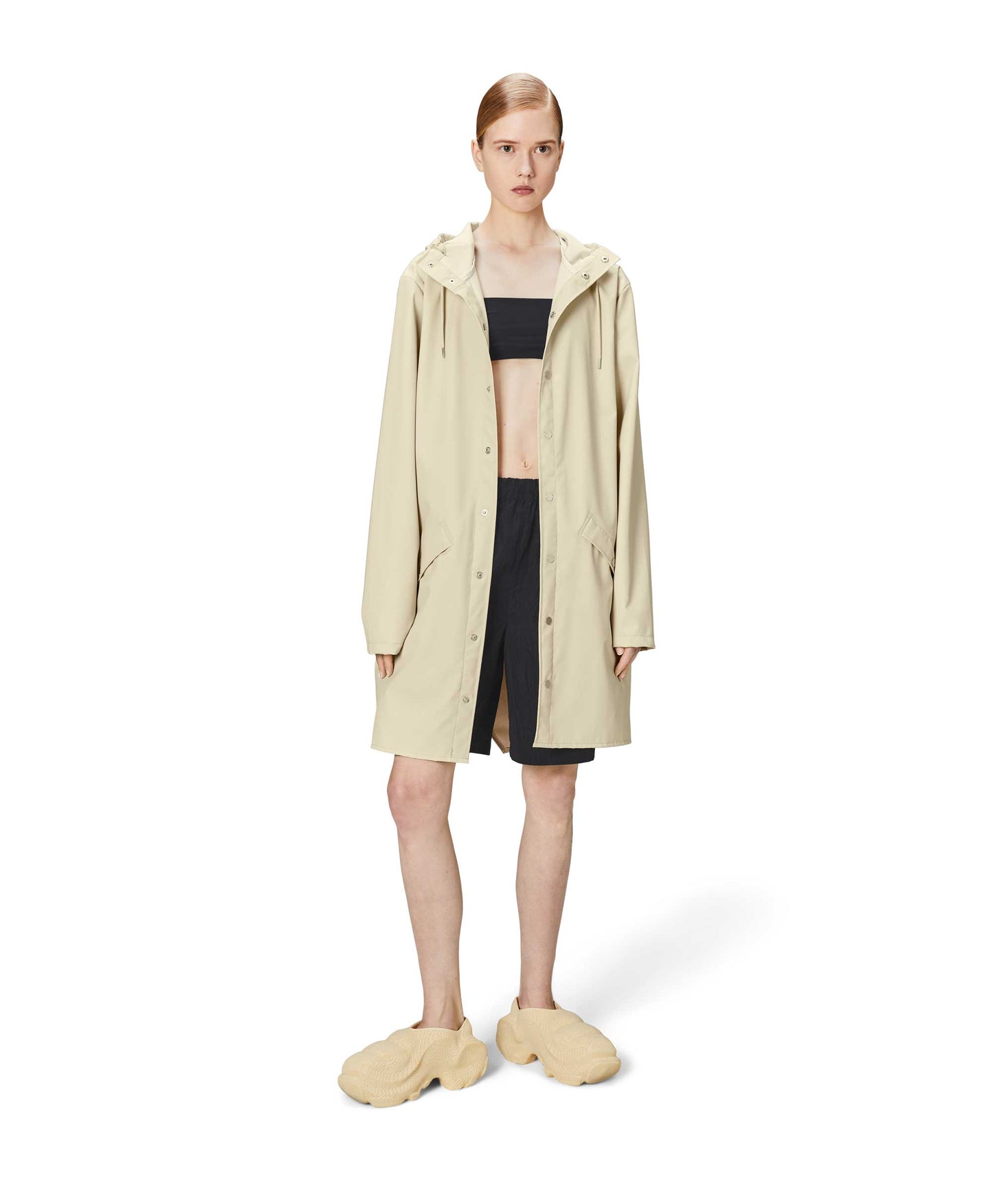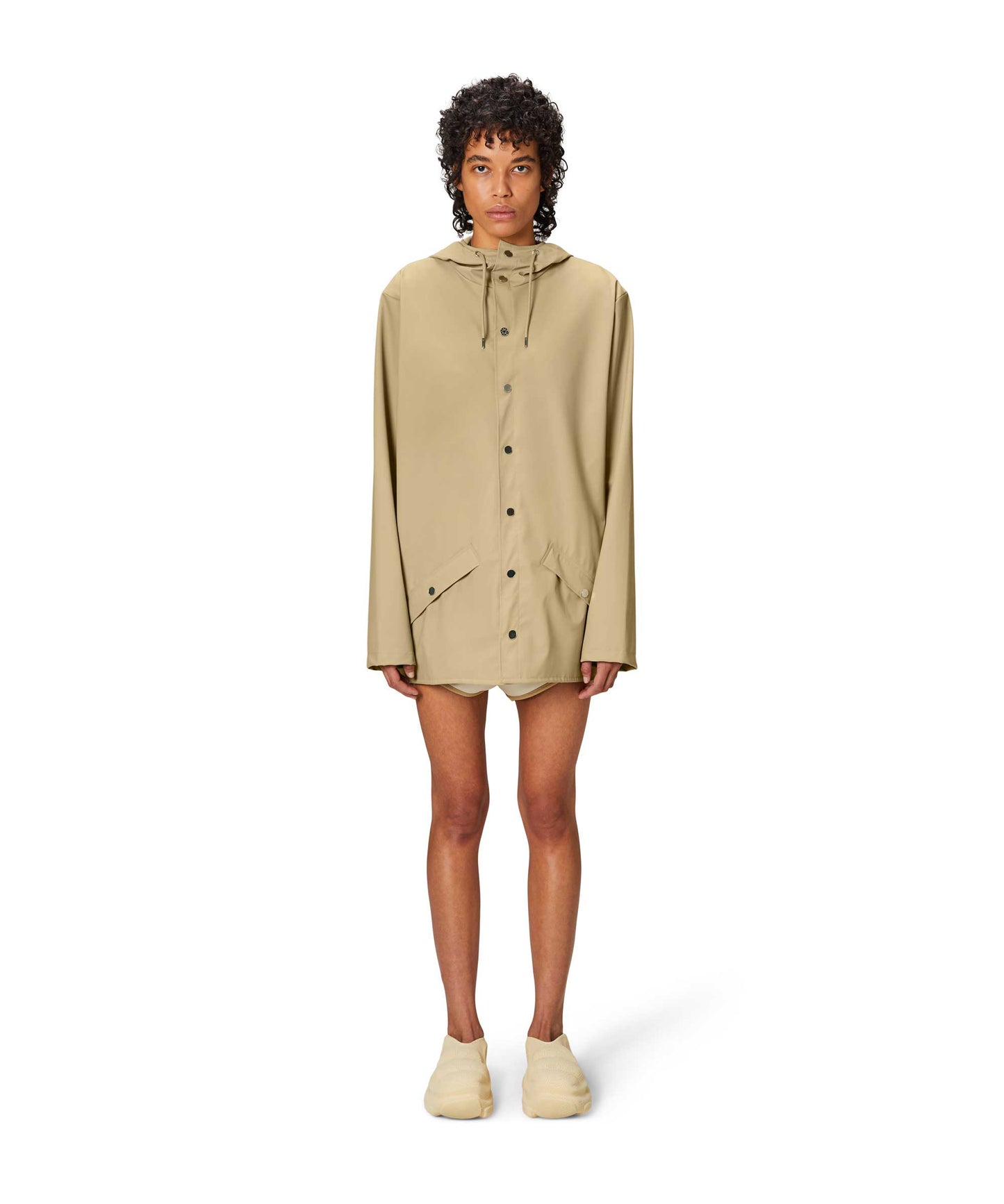 This contemporary unisex Rains Jacket is characterized by a minimal silhouette and high functionality. Featuring a placket with snap fastenings for closure, hood with built-in cap and two side pockets with snaps, it is completed with under-arm eyelets and a back yoke with concealed vents for breathable comfort. The sleeves are finished with snaps for an adjustable fit. The easy-to-wear design features Rains' signature PU fabric and features welded seams, for a lightweight finish and smooth feel.