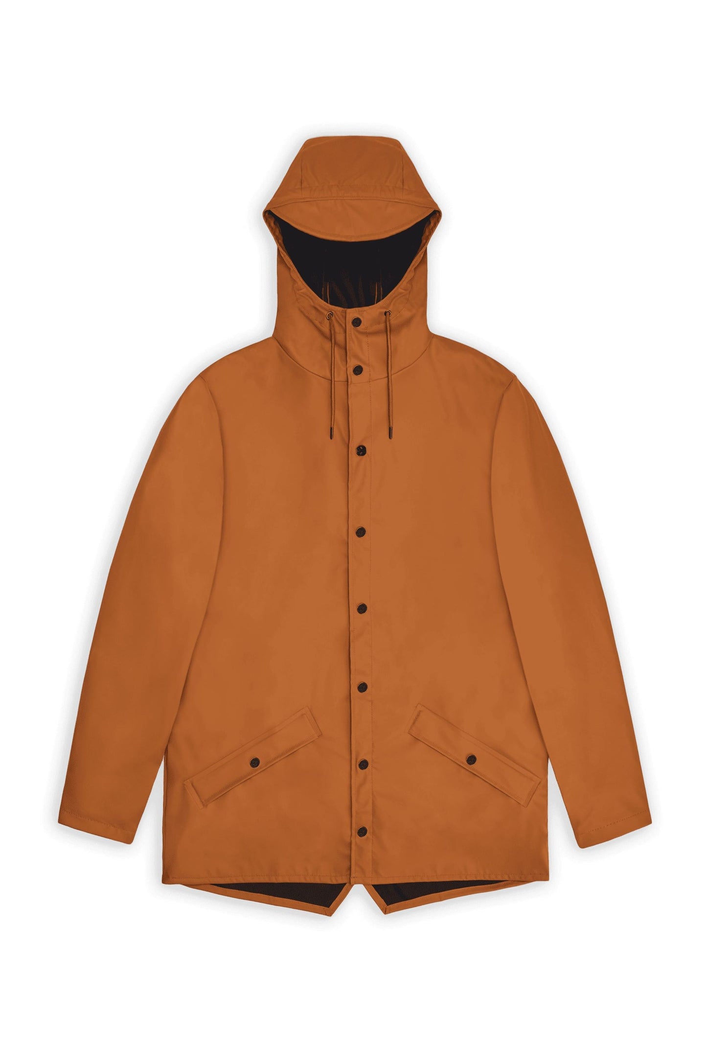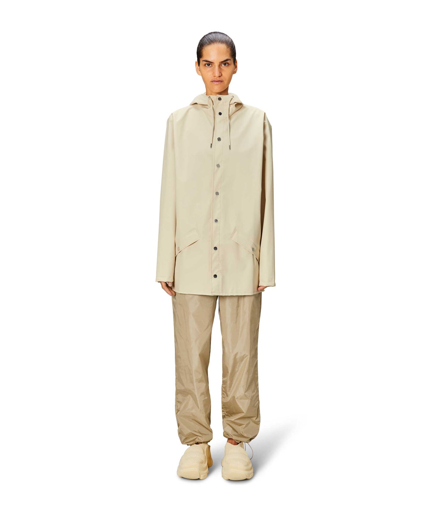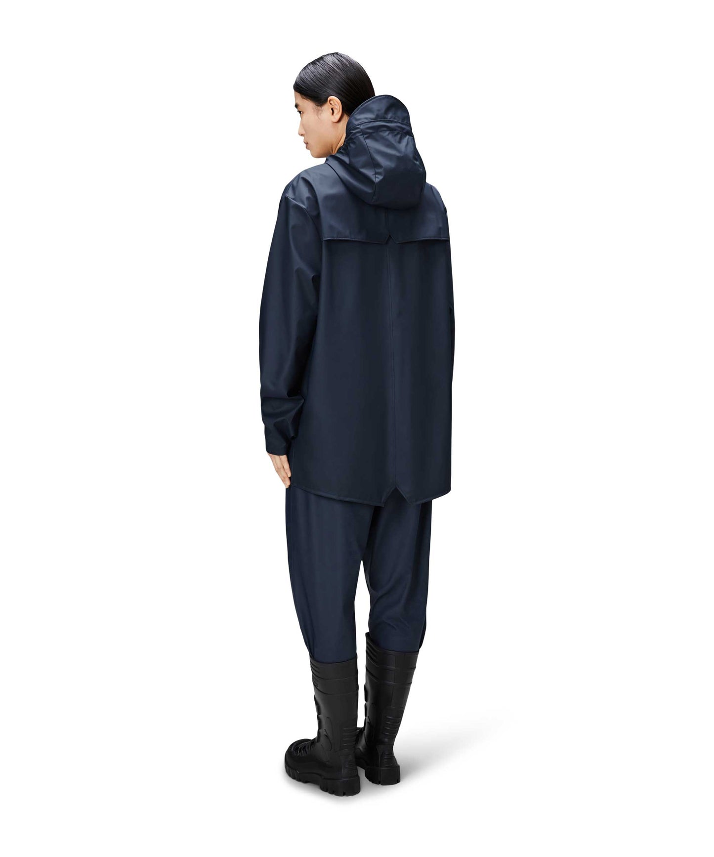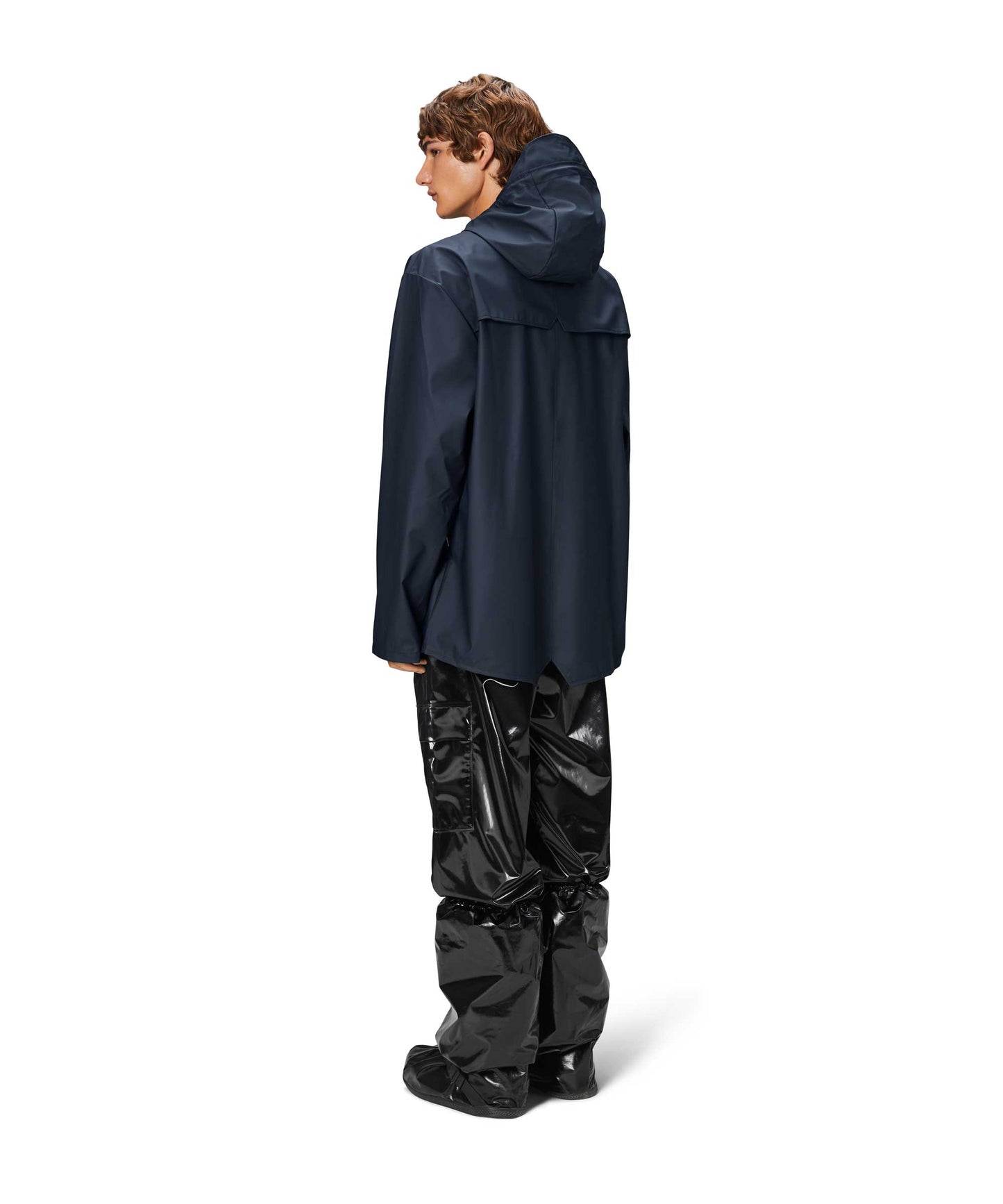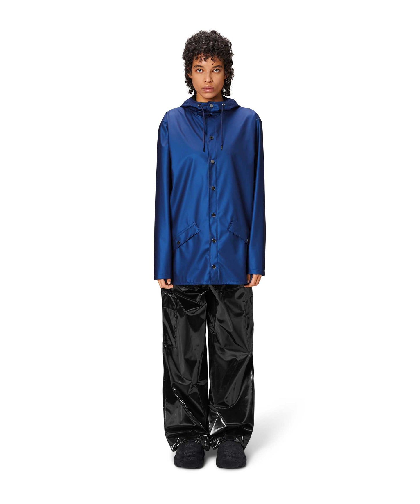 This contemporary unisex Rains Jacket is characterized by a minimal silhouette and high functionality. Featuring a placket with snap fastenings for closure, hood with built-in cap and two side pockets with snaps, it is completed with under-arm eyelets and a back yoke with concealed vents for breathable comfort. The sleeves are finished with snaps for an adjustable fit. The easy-to-wear design features Rains' signature PU fabric and features welded seams, for a lightweight finish and smooth feel.