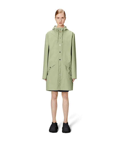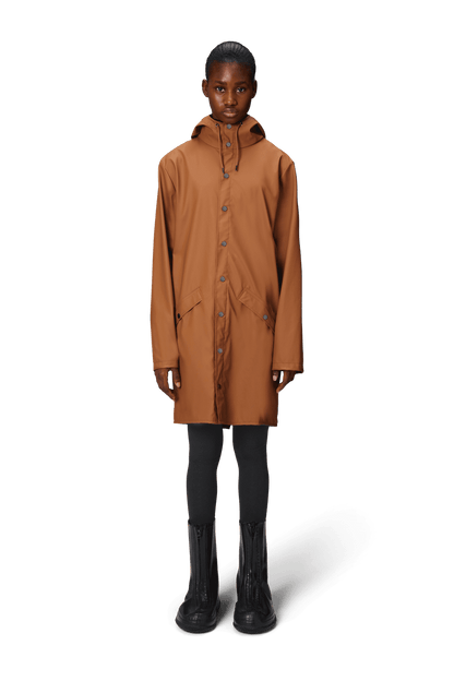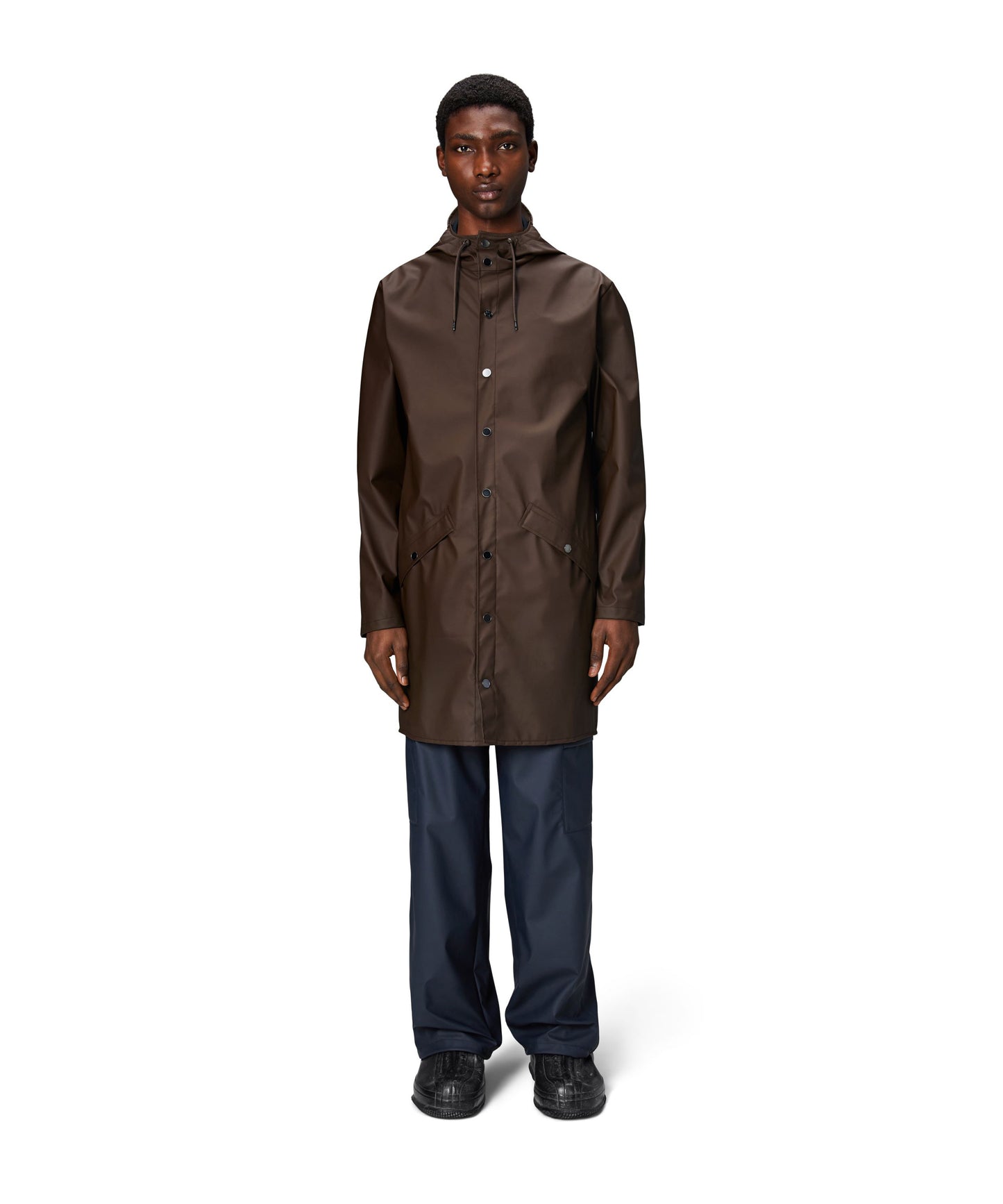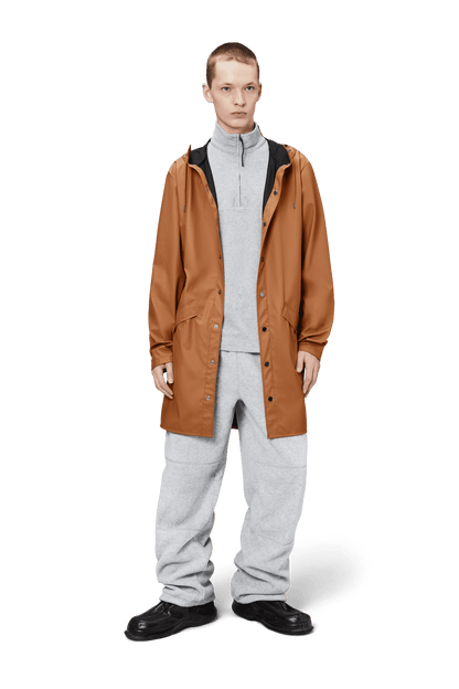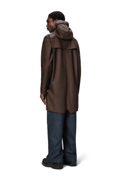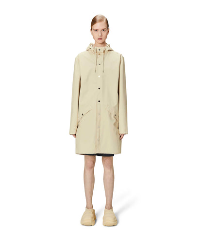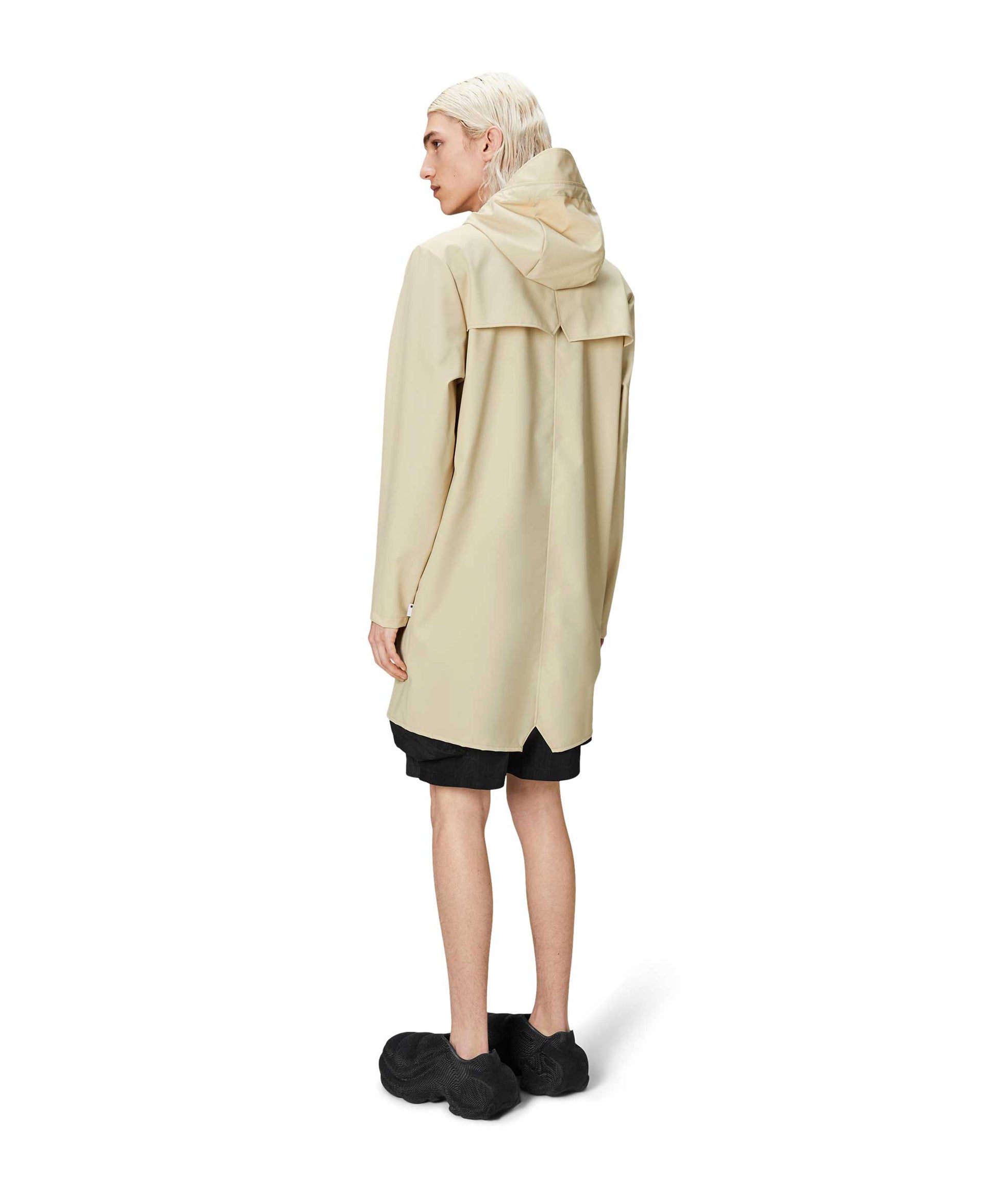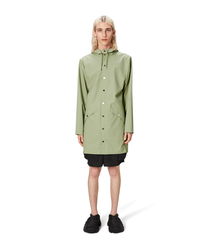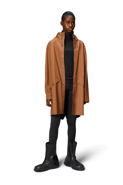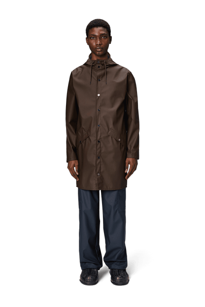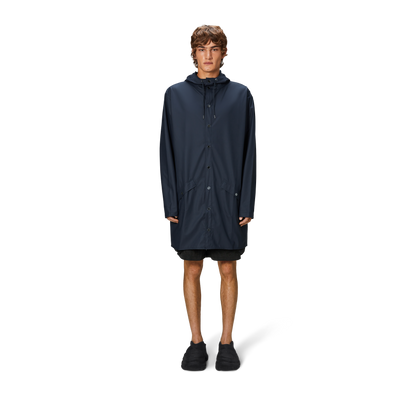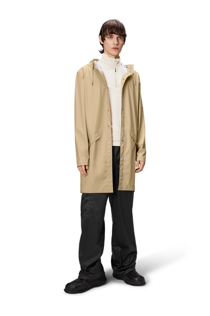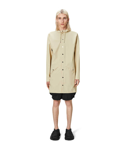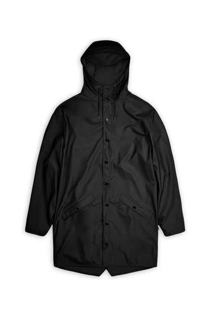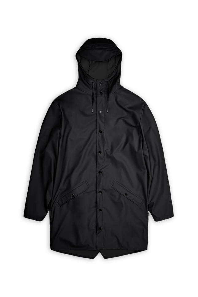 This contemporary unisex jacket is a long version of Rains' classic rain jacket, characterized by a minimal silhouette and high functionality. Featuring a placket with snap fastenings for closure, hood with built-in cap and two side pockets with snaps, it is completed with under-arm eyelets and a back yoke with concealed vents for breathable comfort. The sleeves are finished with snaps for an adjustable fit. The easy-to-wear design features Rains' signature PU fabric and features welded seams, for a lightweight finish and smooth feel.