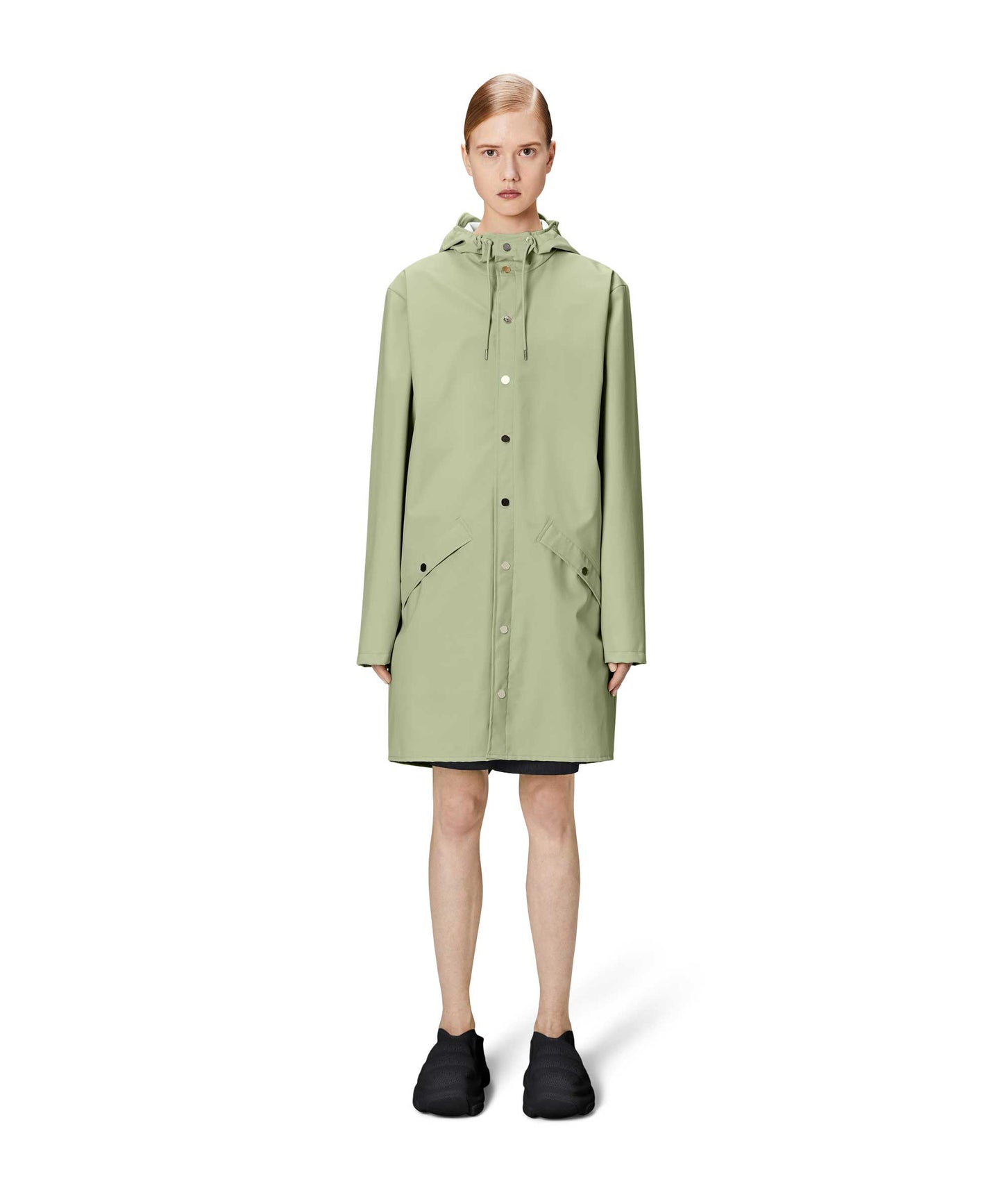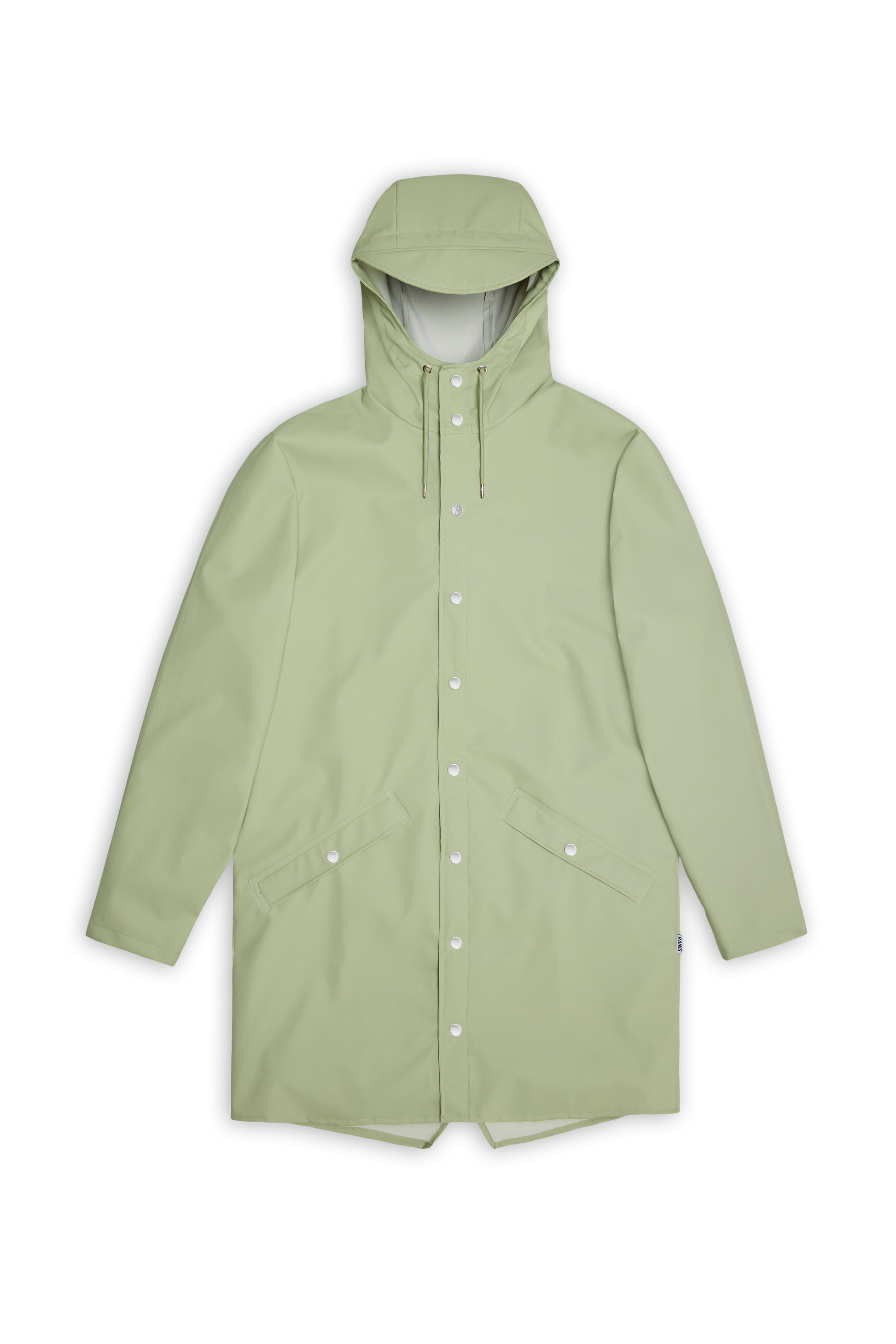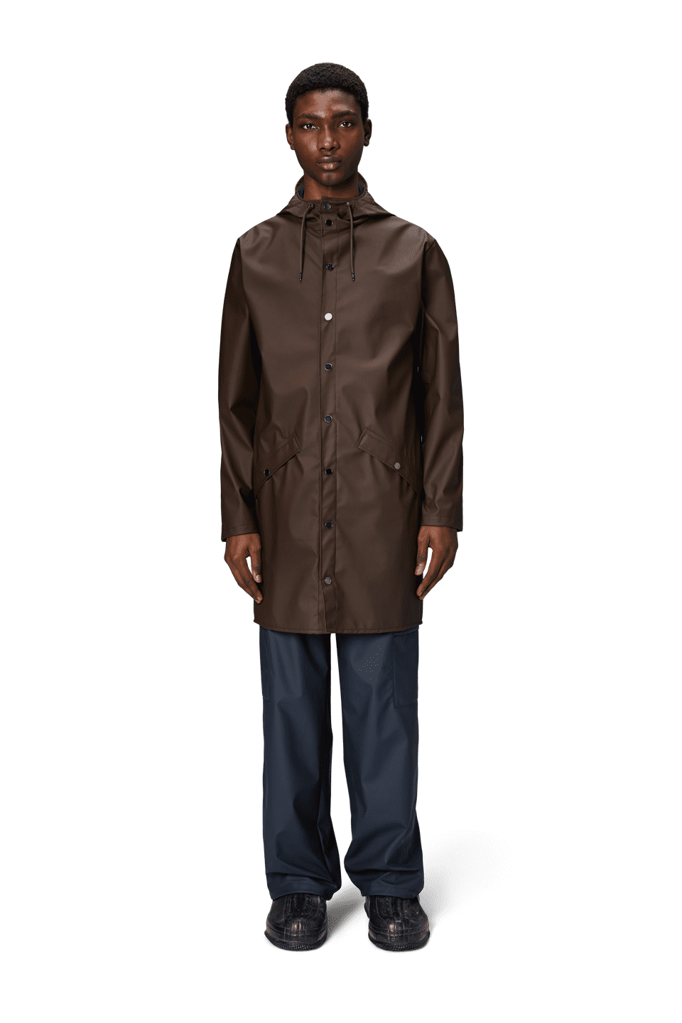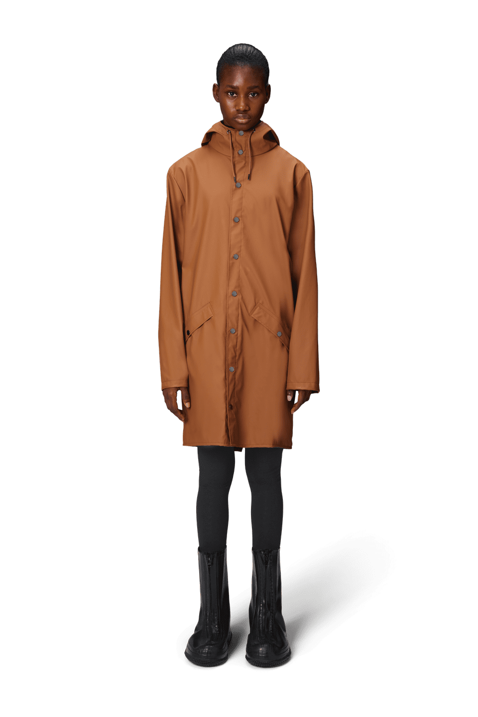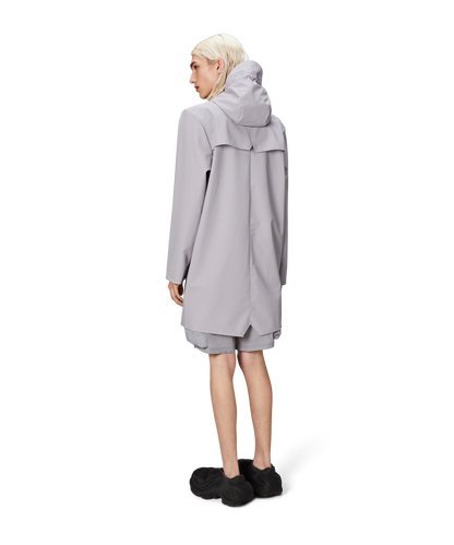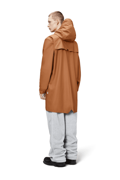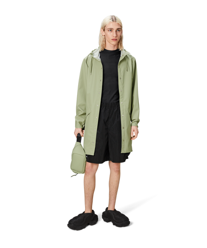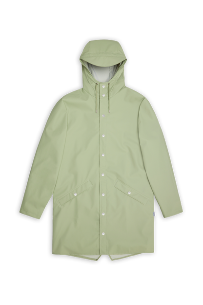 This contemporary unisex jacket is a long version of Rains' classic rain jacket, characterized by a minimal silhouette and high functionality. Featuring a placket with snap fastenings for closure, hood with built-in cap and two side pockets with snaps, it is completed with under-arm eyelets and a back yoke with concealed vents for breathable comfort. The sleeves are finished with snaps for an adjustable fit. The easy-to-wear design features Rains' signature PU fabric and features welded seams, for a lightweight finish and smooth feel.