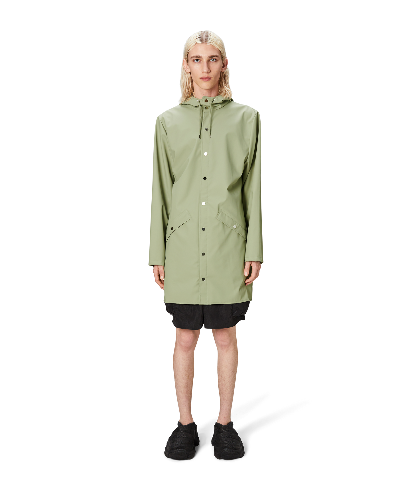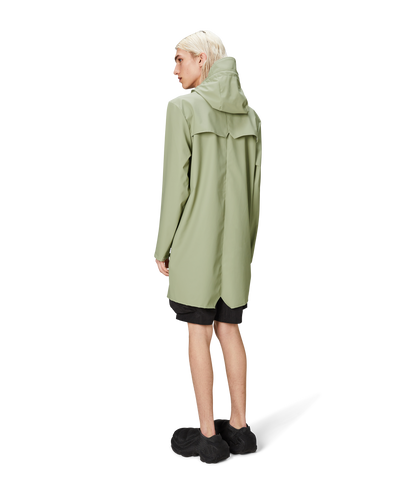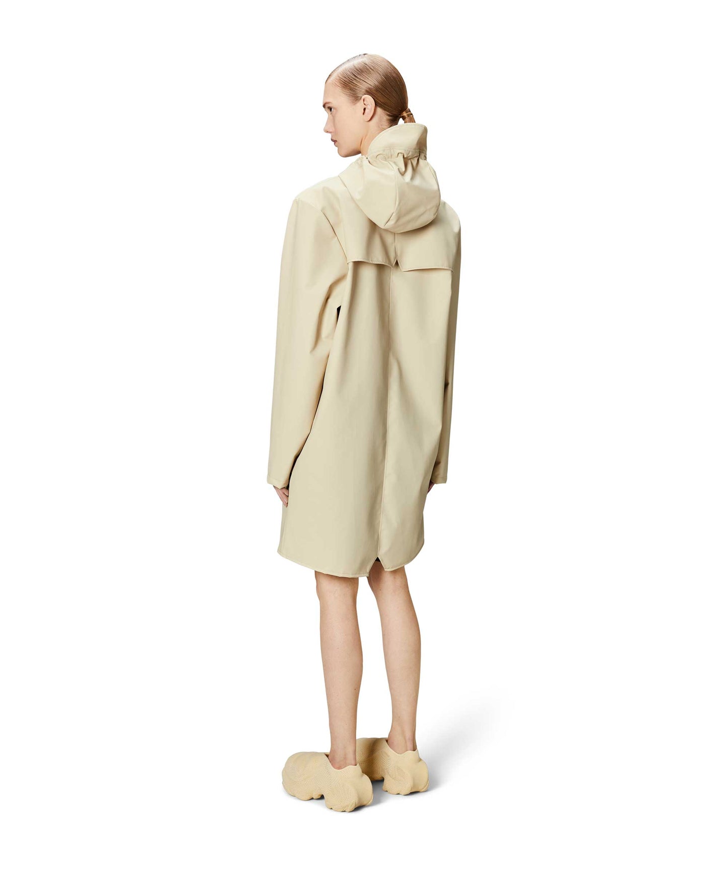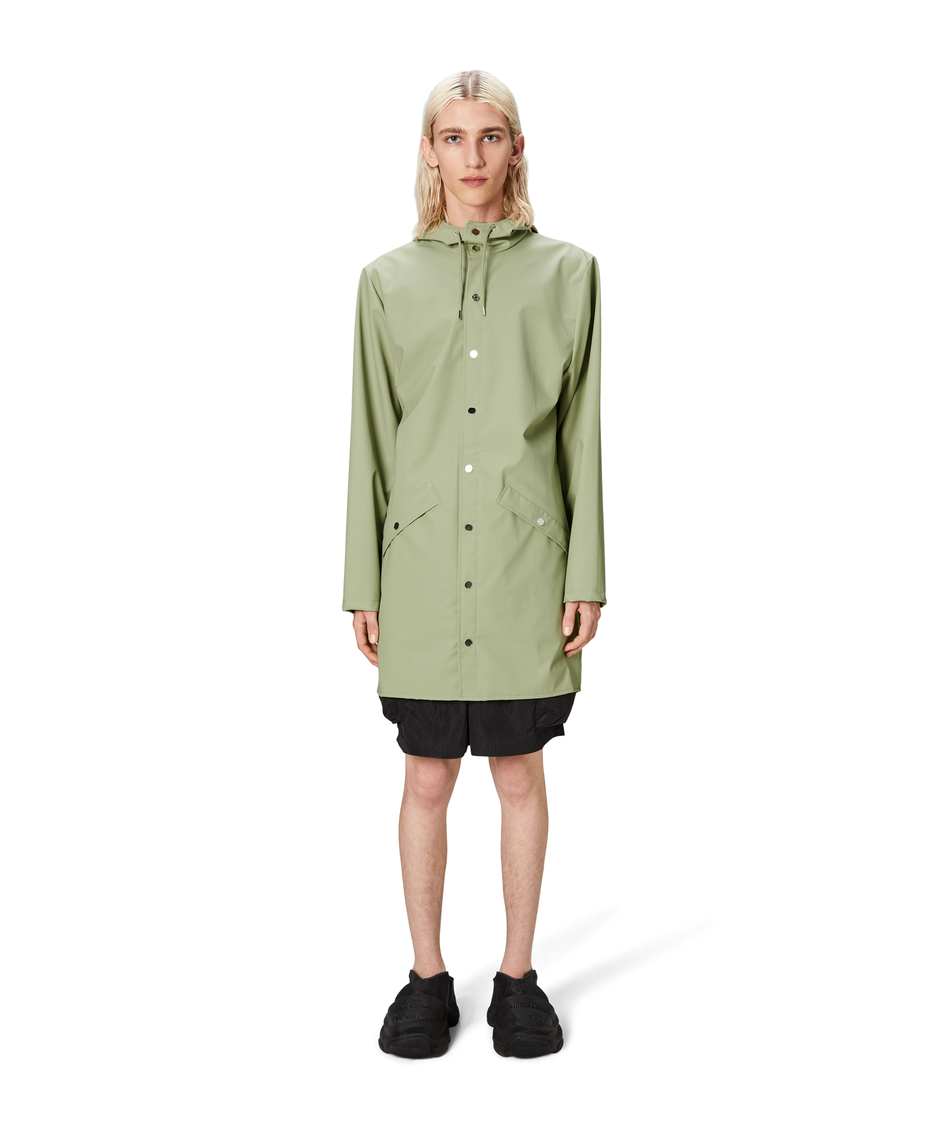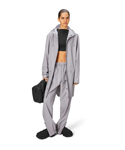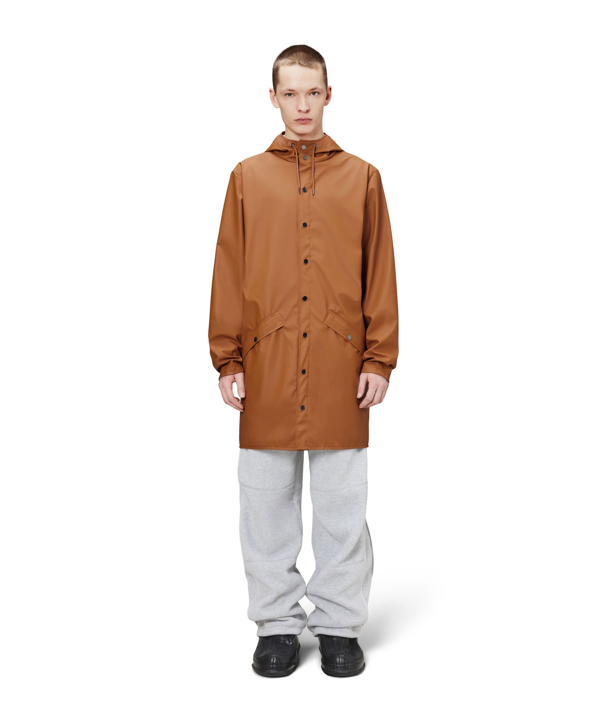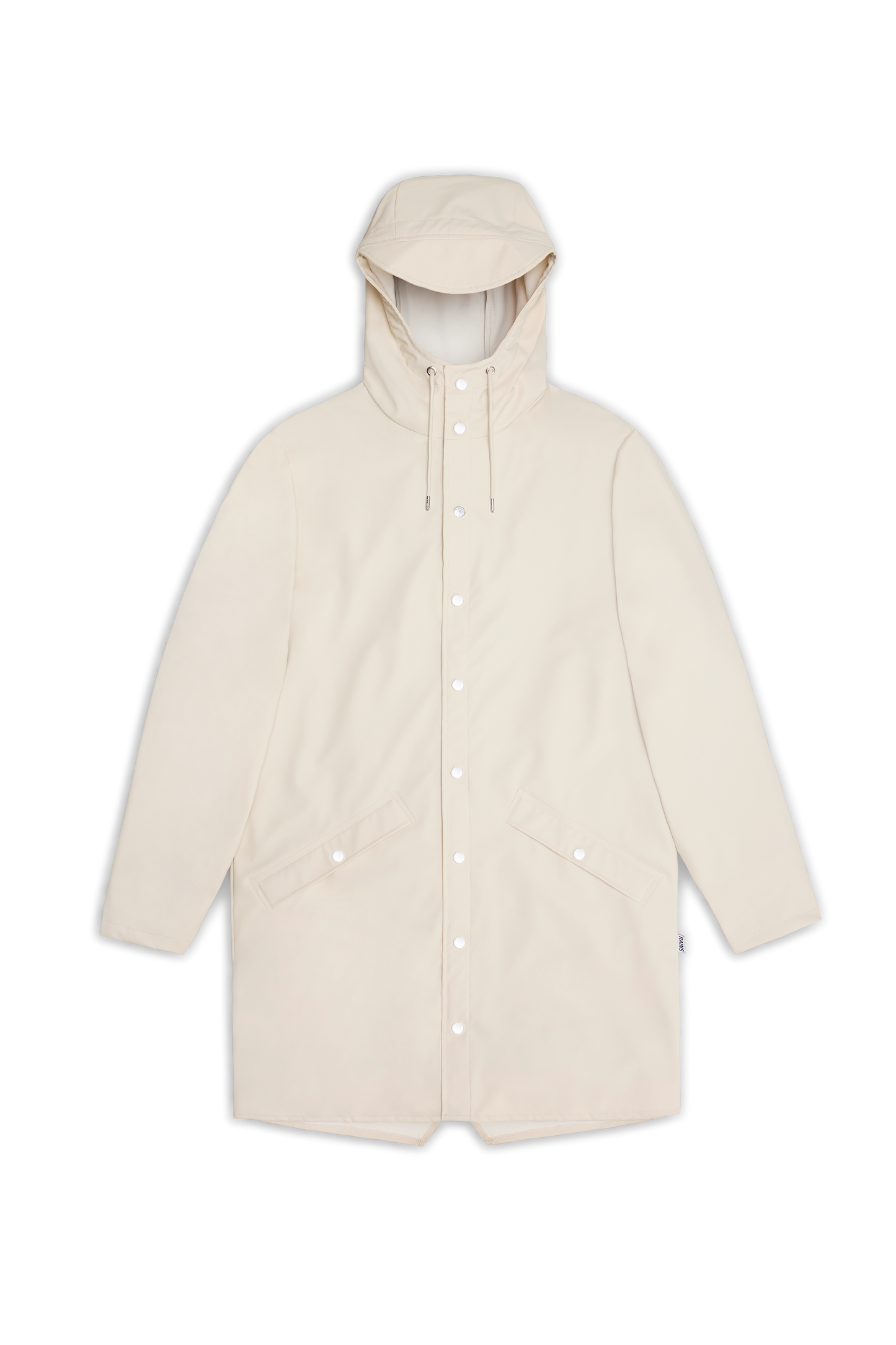 This contemporary unisex jacket is a long version of Rains' classic rain jacket, characterized by a minimal silhouette and high functionality. Featuring a placket with snap fastenings for closure, hood with built-in cap and two side pockets with snaps, it is completed with under-arm eyelets and a back yoke with concealed vents for breathable comfort. The sleeves are finished with snaps for an adjustable fit. The easy-to-wear design features Rains' signature PU fabric and features welded seams, for a lightweight finish and smooth feel.