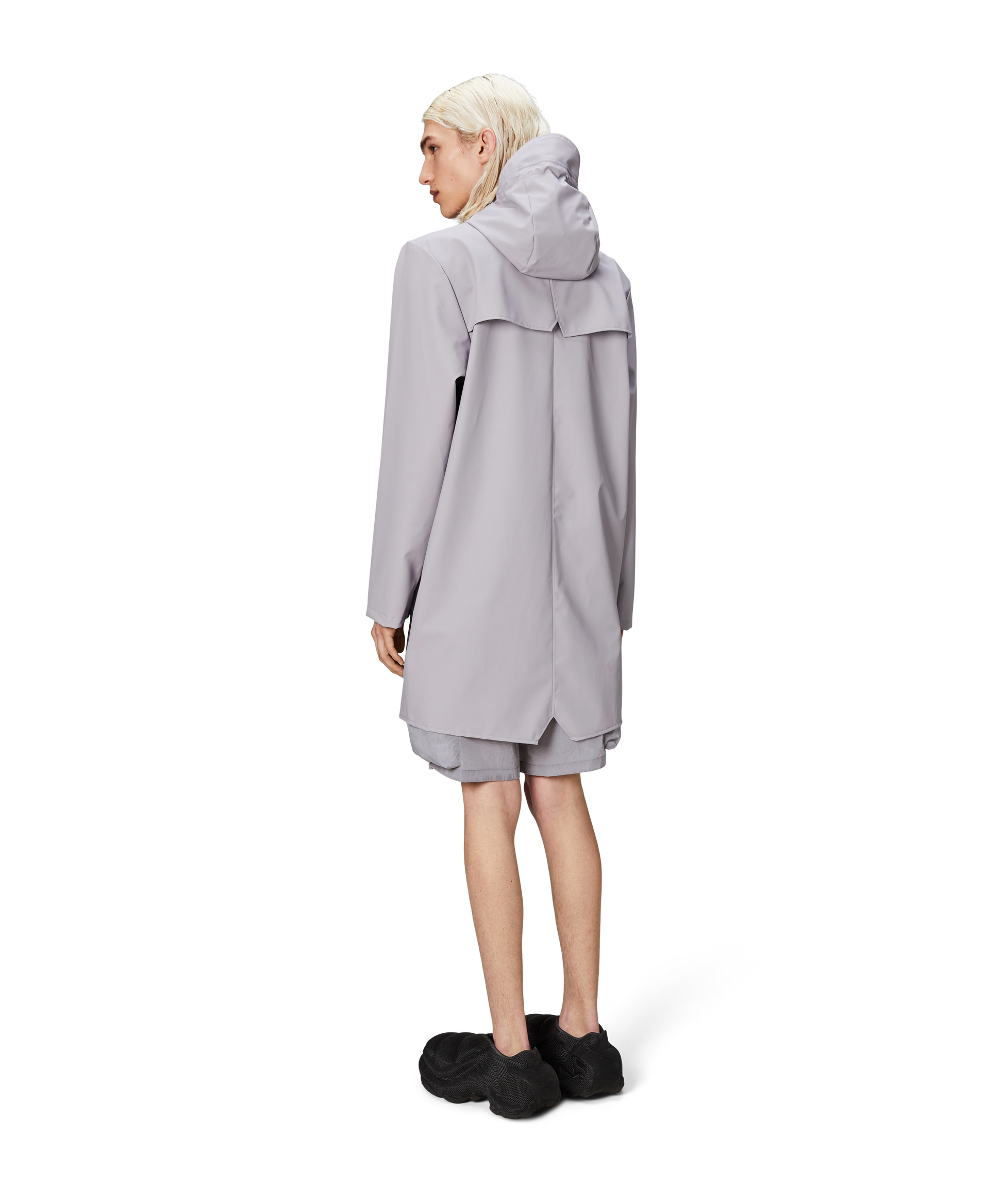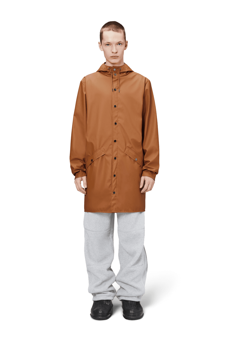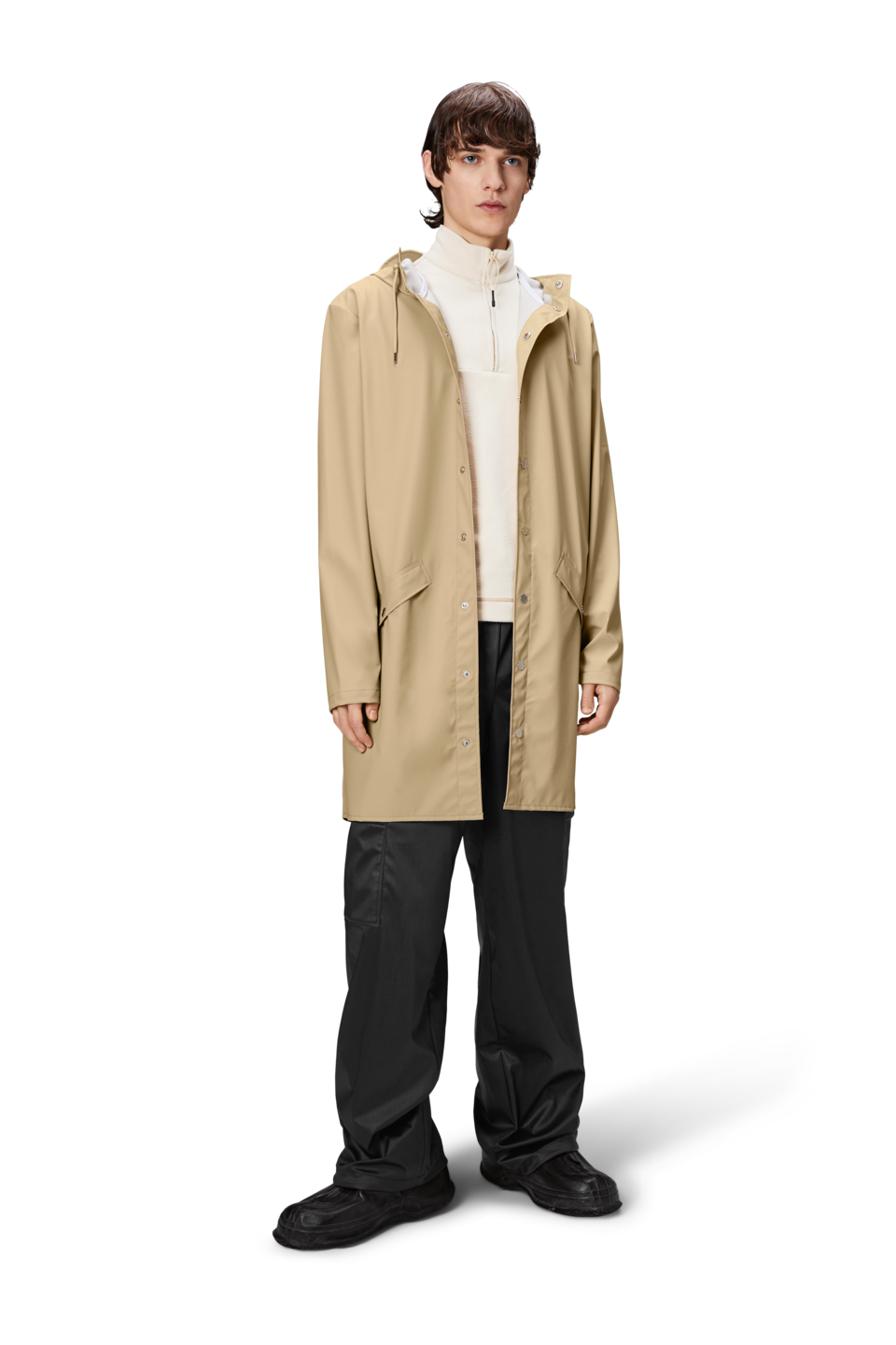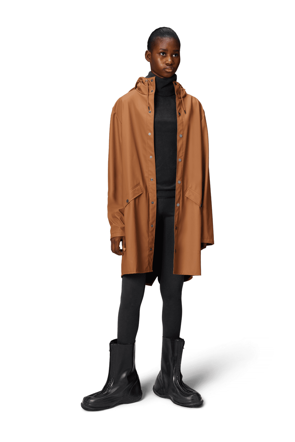 This contemporary unisex jacket is a long version of Rains' classic rain jacket, characterized by a minimal silhouette and high functionality. Featuring a placket with snap fastenings for closure, hood with built-in cap and two side pockets with snaps, it is completed with under-arm eyelets and a back yoke with concealed vents for breathable comfort. The sleeves are finished with snaps for an adjustable fit. The easy-to-wear design features Rains' signature PU fabric and features welded seams, for a lightweight finish and smooth feel.