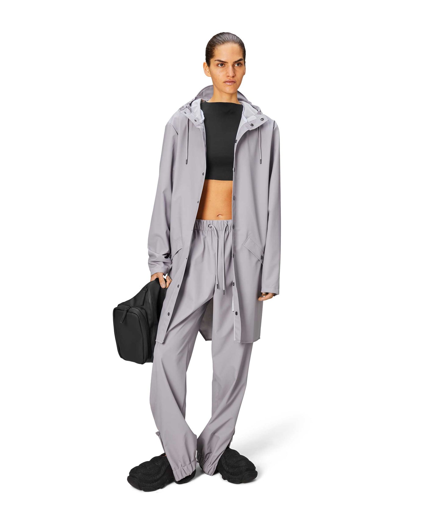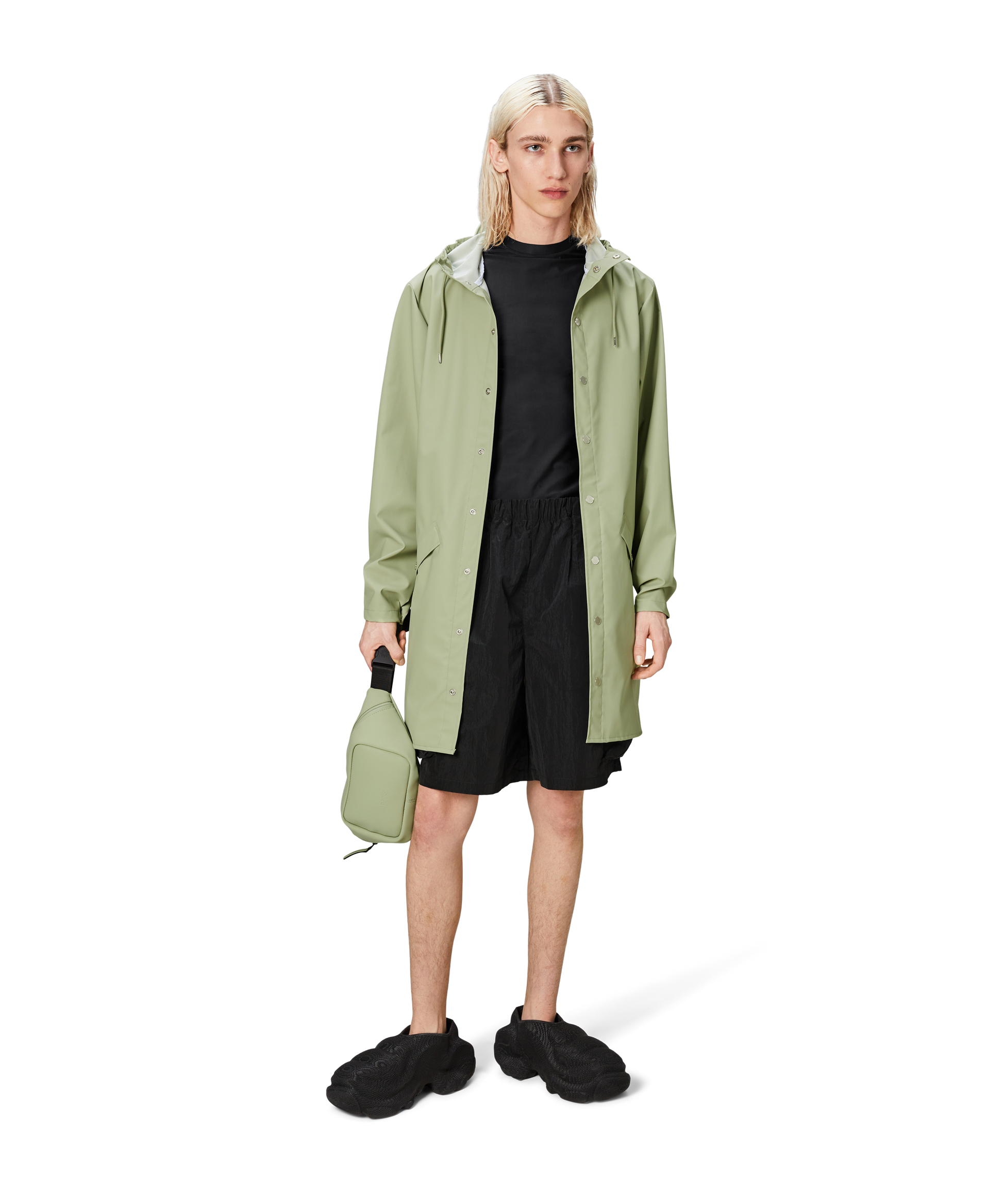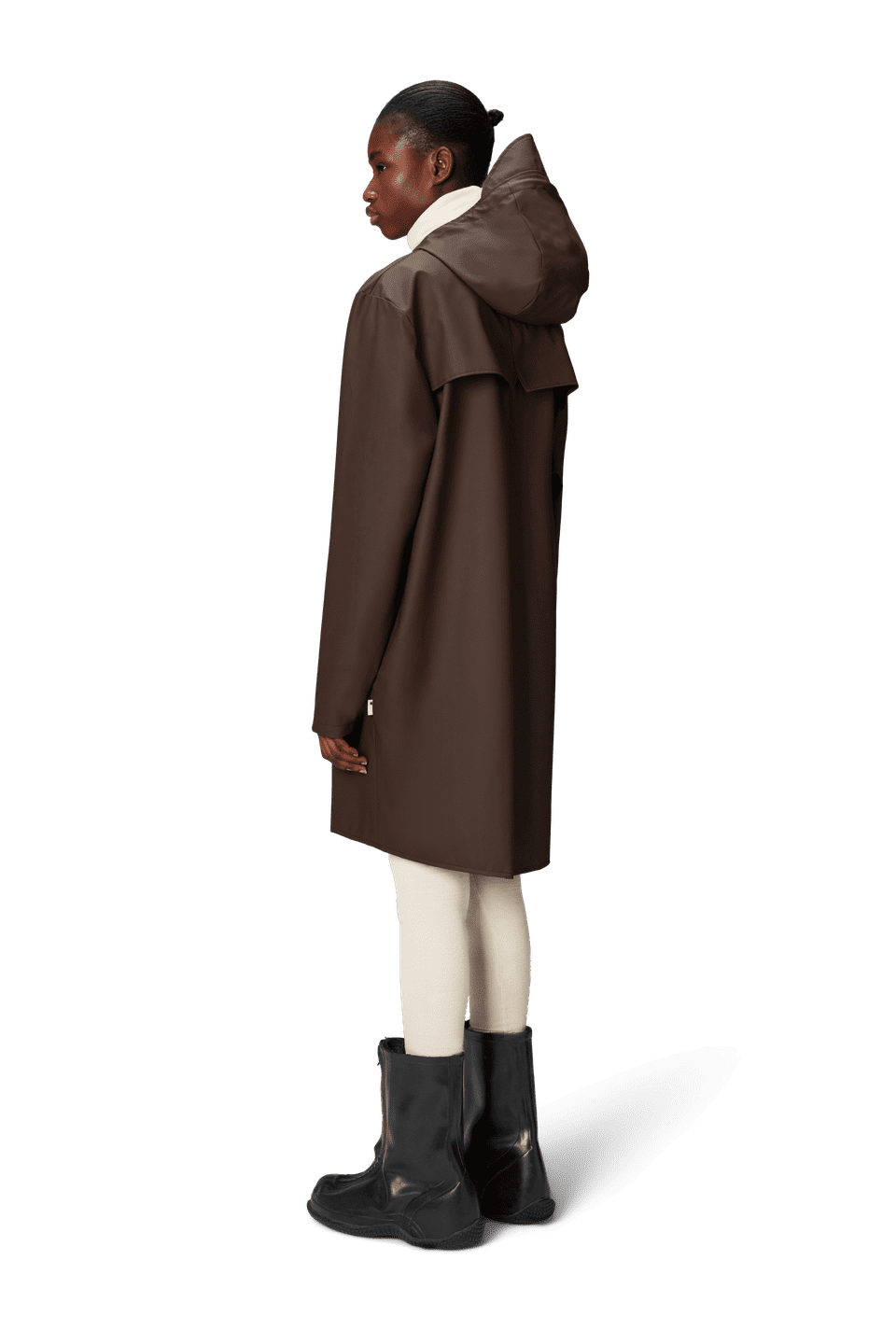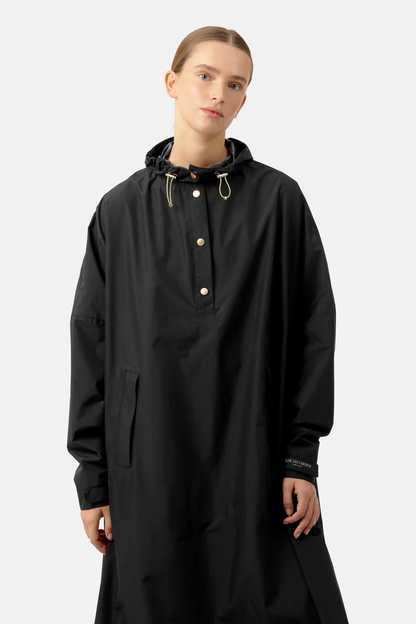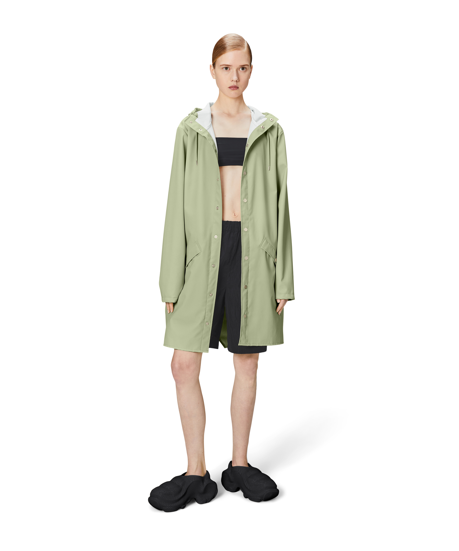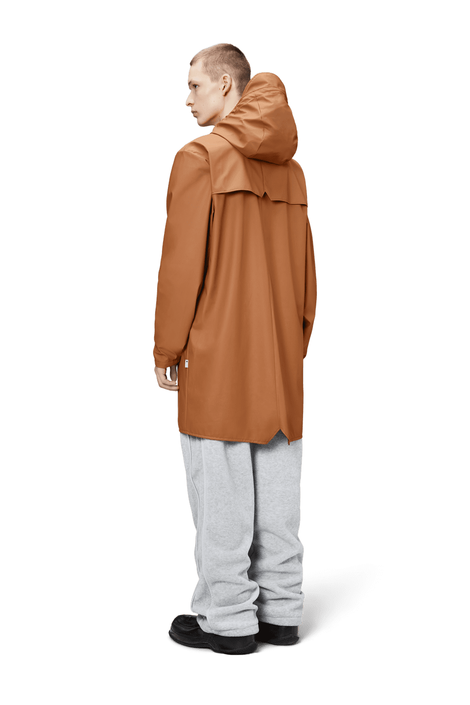This contemporary unisex jacket is a long version of Rains' classic rain jacket, characterized by a minimal silhouette and high functionality. Featuring a placket with snap fastenings for closure, hood with built-in cap and two side pockets with snaps, it is completed with under-arm eyelets and a back yoke with concealed vents for breathable comfort. The sleeves are finished with snaps for an adjustable fit. The easy-to-wear design features Rains' signature PU fabric and features welded seams, for a lightweight finish and smooth feel.
