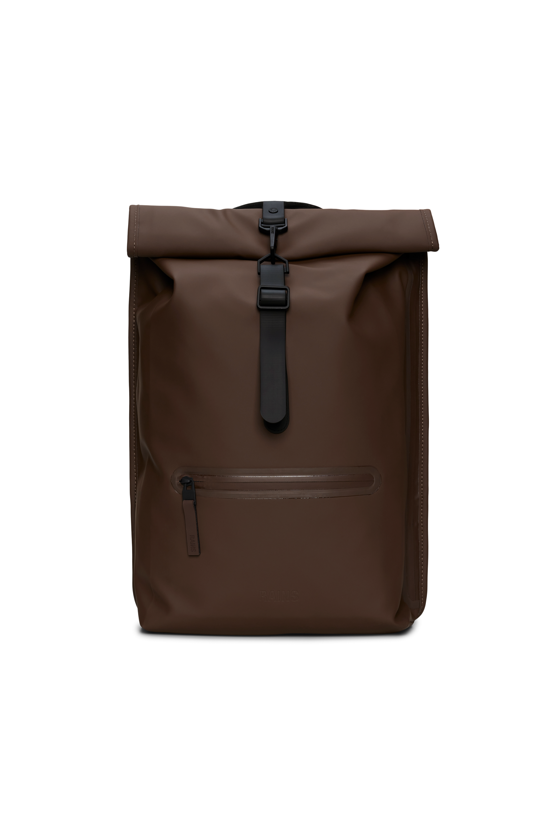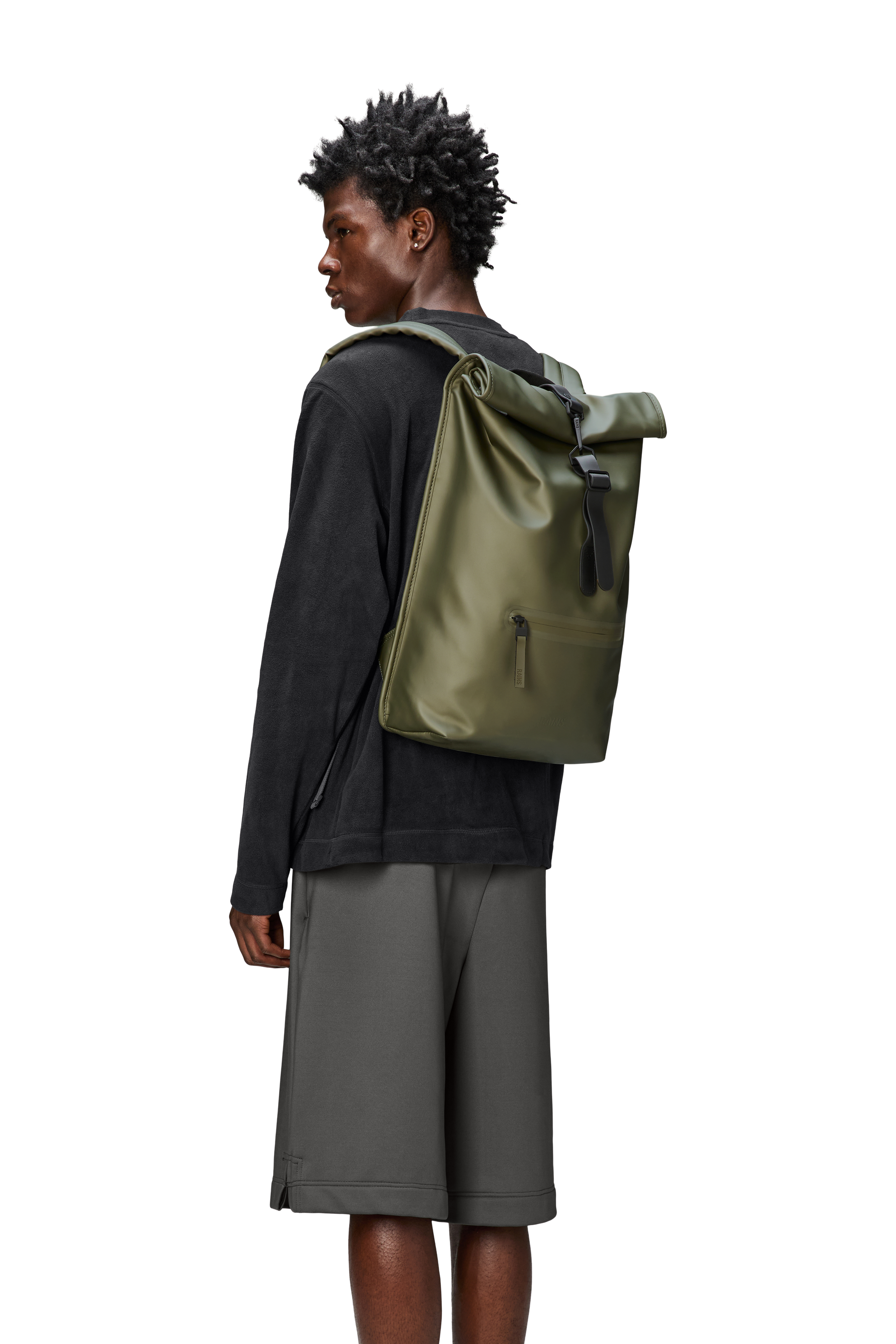 The Rolltop Rucksack is cut from Rains' signature PU fabric, engineered for carrying strength, durability and a smooth feel.