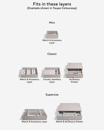 Tailor your jewellery box even more to your collection with one of Stackers Watch Pads. You can fit multiple watches on one and it's been designed to fit neatly in the Watch/Accessory Layers. Keeping your wristwear in shape and beautifully organised. Top tip: You can also use the Watch Pad for bangles and bracelets.