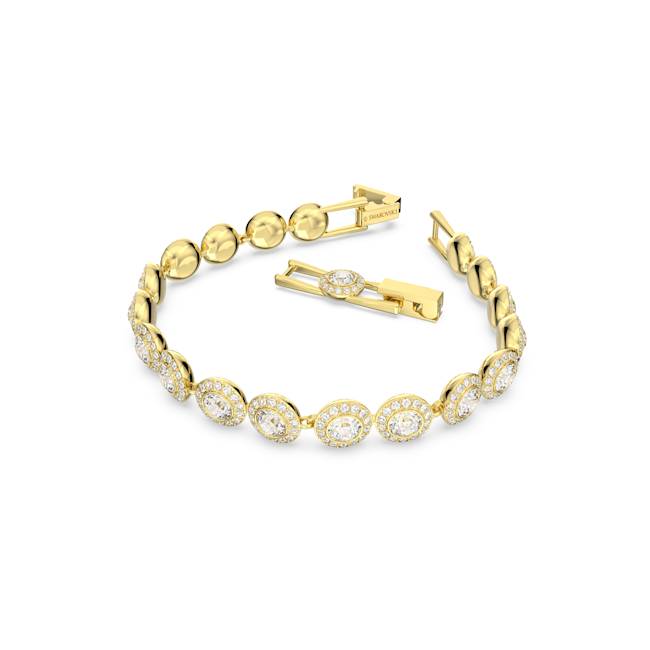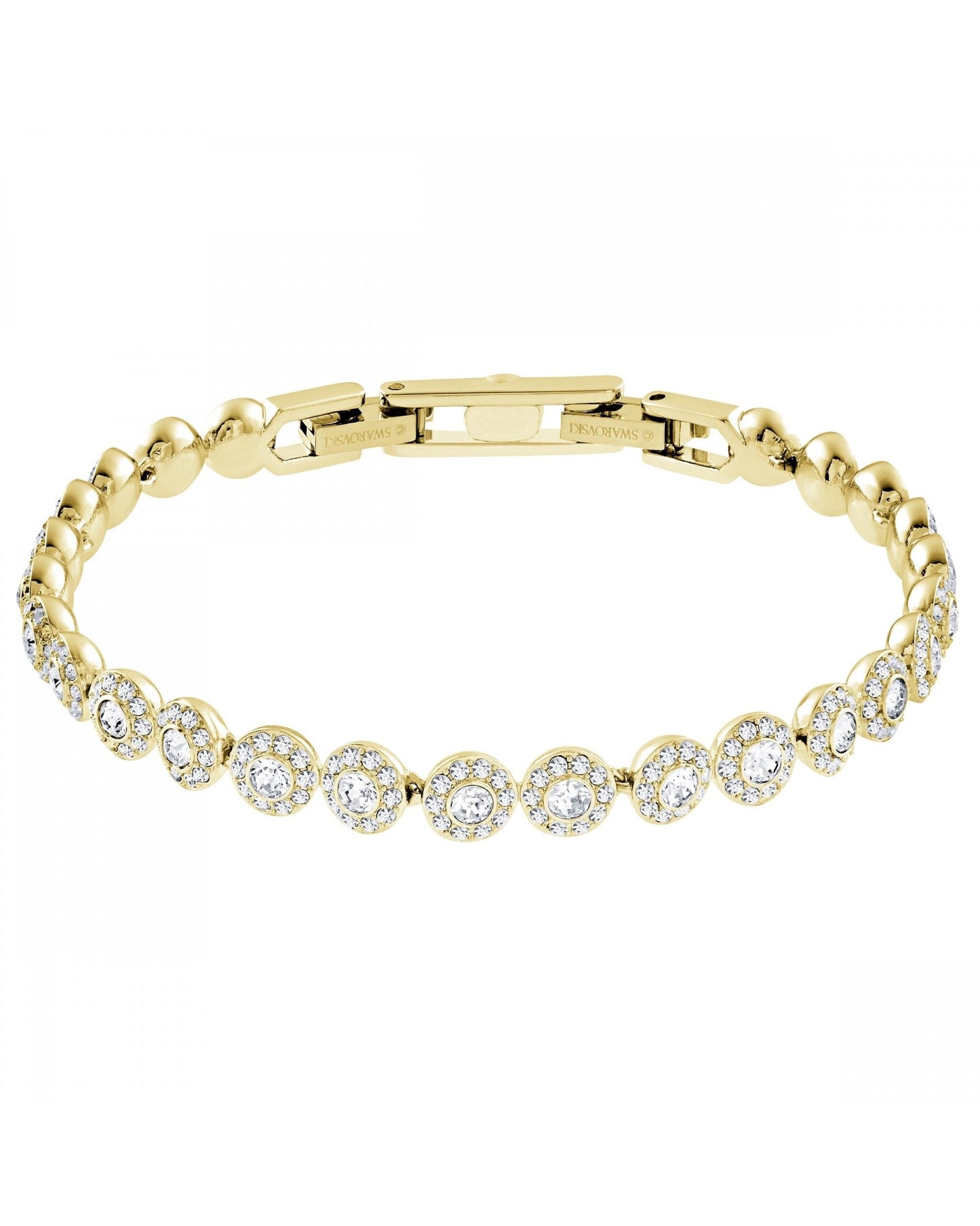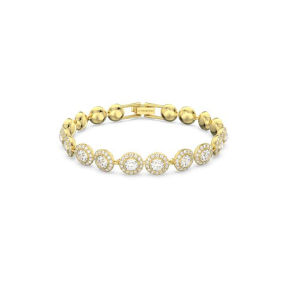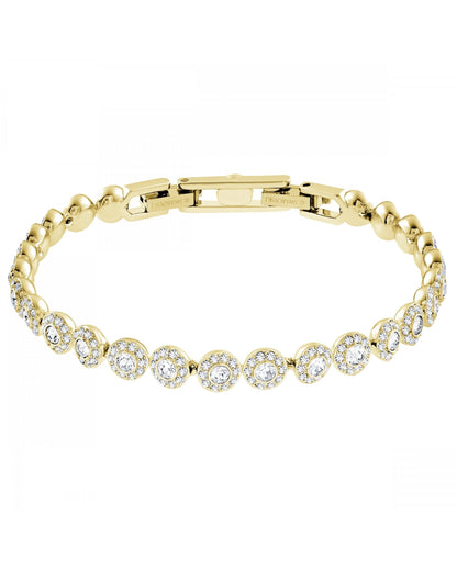 Pure, timeless sophistication. This gold-tone plated bracelet features a row of round clear crystals, each one framed in sparkling clear crystal pavé. Combining perfectly with other pieces from the Angelic family, it would make a gorgeous gift.