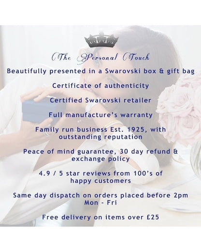 A Swarovski piece purchased from Nicholls Online will come in its own beautiful presentation box and supplied with a certificate of authenticity. We will also do our best to package the item in its own Swarovski gift bag (subject to availability) - See the image to the left for an example of the gorgeous packaging.