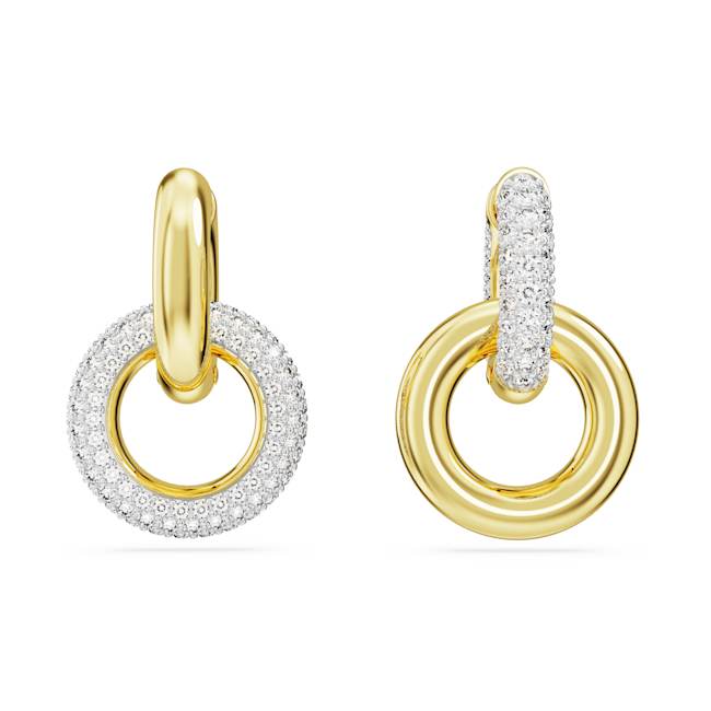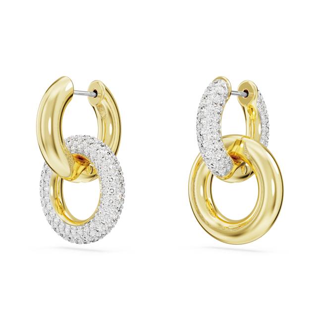 These Dextera interlinked hoop earrings feature two gold-tone plated tubular rings, one with all-over pavé. To add an asymmetrical touch, the positioning of the rings is different on each piece, and for added versatility you can detach the second hoop for a single hoop style.