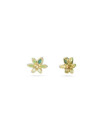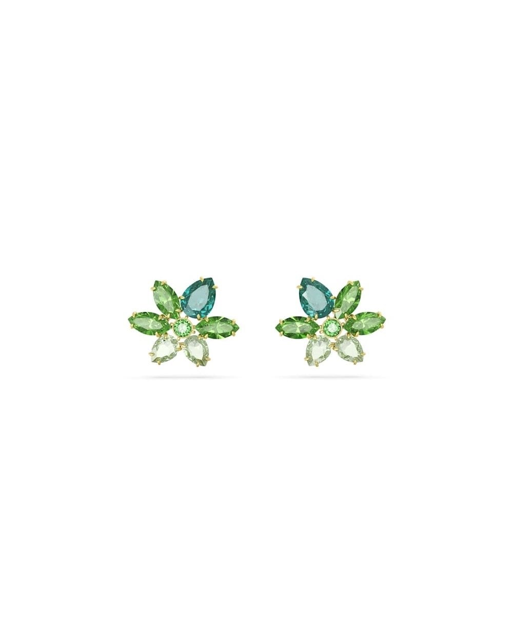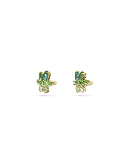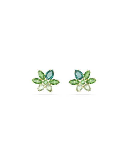 Designed as two delicate flowers, these radiant pierced earrings are a signature example of the Gema family’s vibrancy and eclectic style. Set in warm gold-tone plating, the variety of green tones in a mix of extraordinary cuts creates a mesmerizing look. Choose this style when you want sophisticated with a twist.