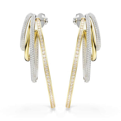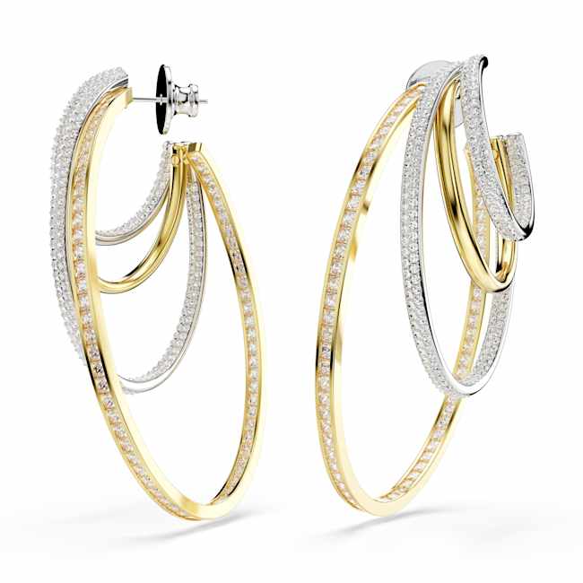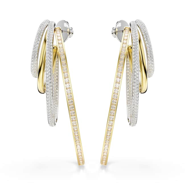Crafted from shimmering spirals in multiple sizes, these Hyperbola pierced earrings are the definition of head-turning style. Each side is presented with two gold-tone plated hoops alongside two rhodium plated hoops, embellished with clear Swarovski Zirconia in channel and prong settings. A scintillating way to create a mesmerising look.