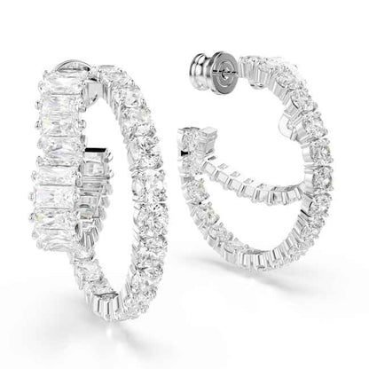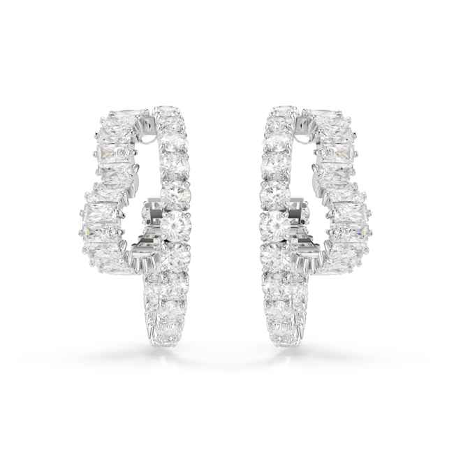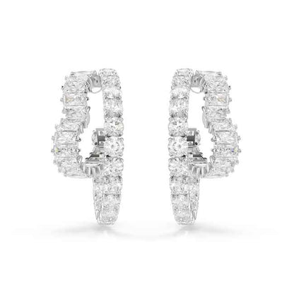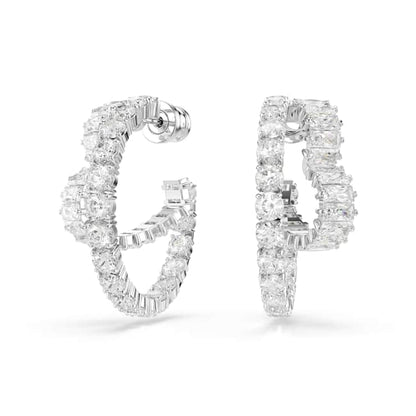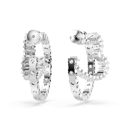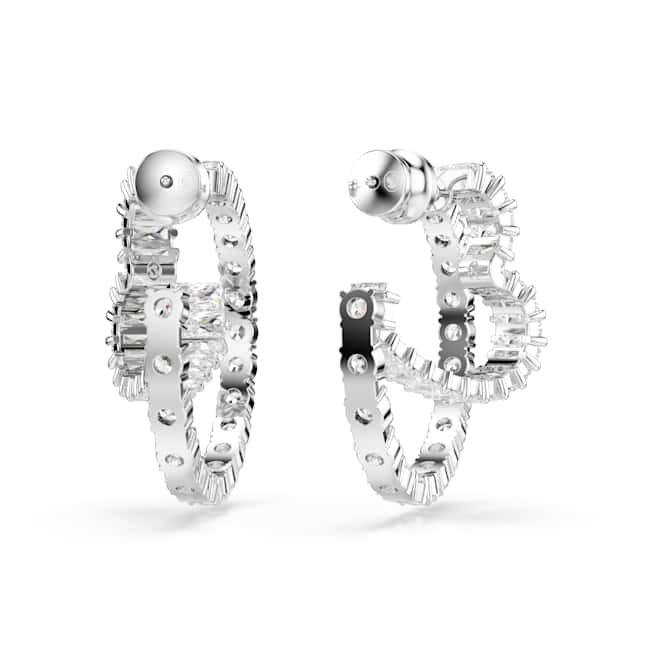Infused with the symbol of love, these pierced Matrix earrings are radiant and romantic. Each rhodium plated hoop features an open heart-shape in the middle, with a full adornment of baguette-cut Swarovski Zirconia in a clear hue. An exquisite choice for self-expression that will fill your style with light.