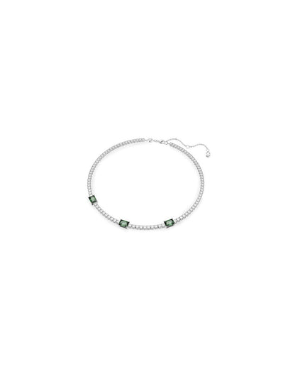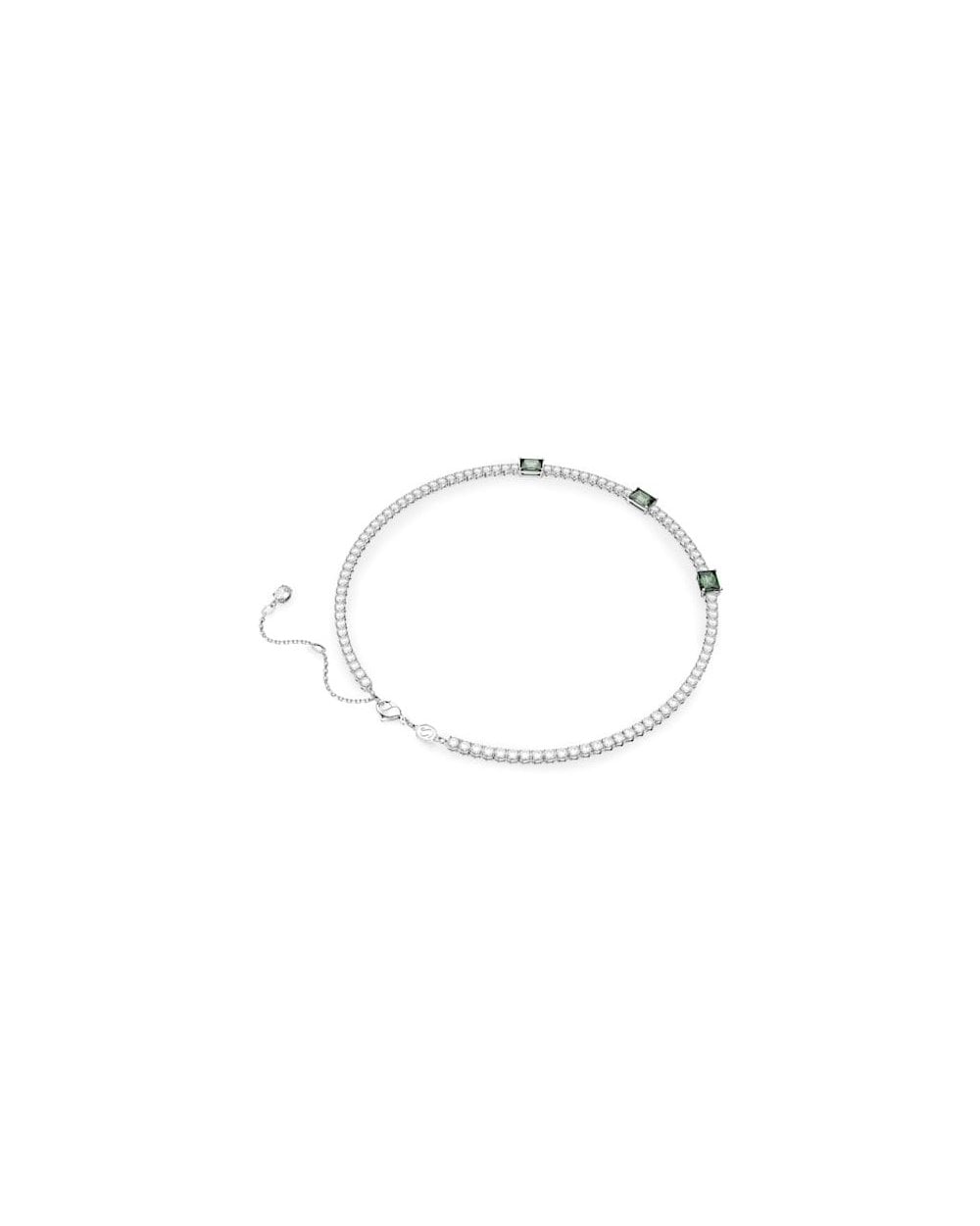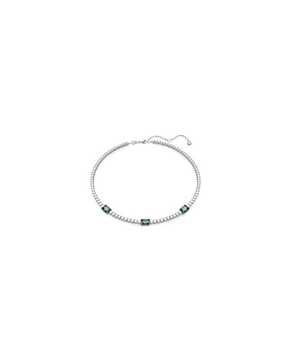 Combining classic elegance with a contemporary twist, this Matrix tennis necklace is both refined and luxurious. An all-around design of clear round stones is interjected by rectangular stones in deep green, illuminated by a rhodium plated setting. This piece will add instant glamour to any celebratory look as well making a memorable gift.