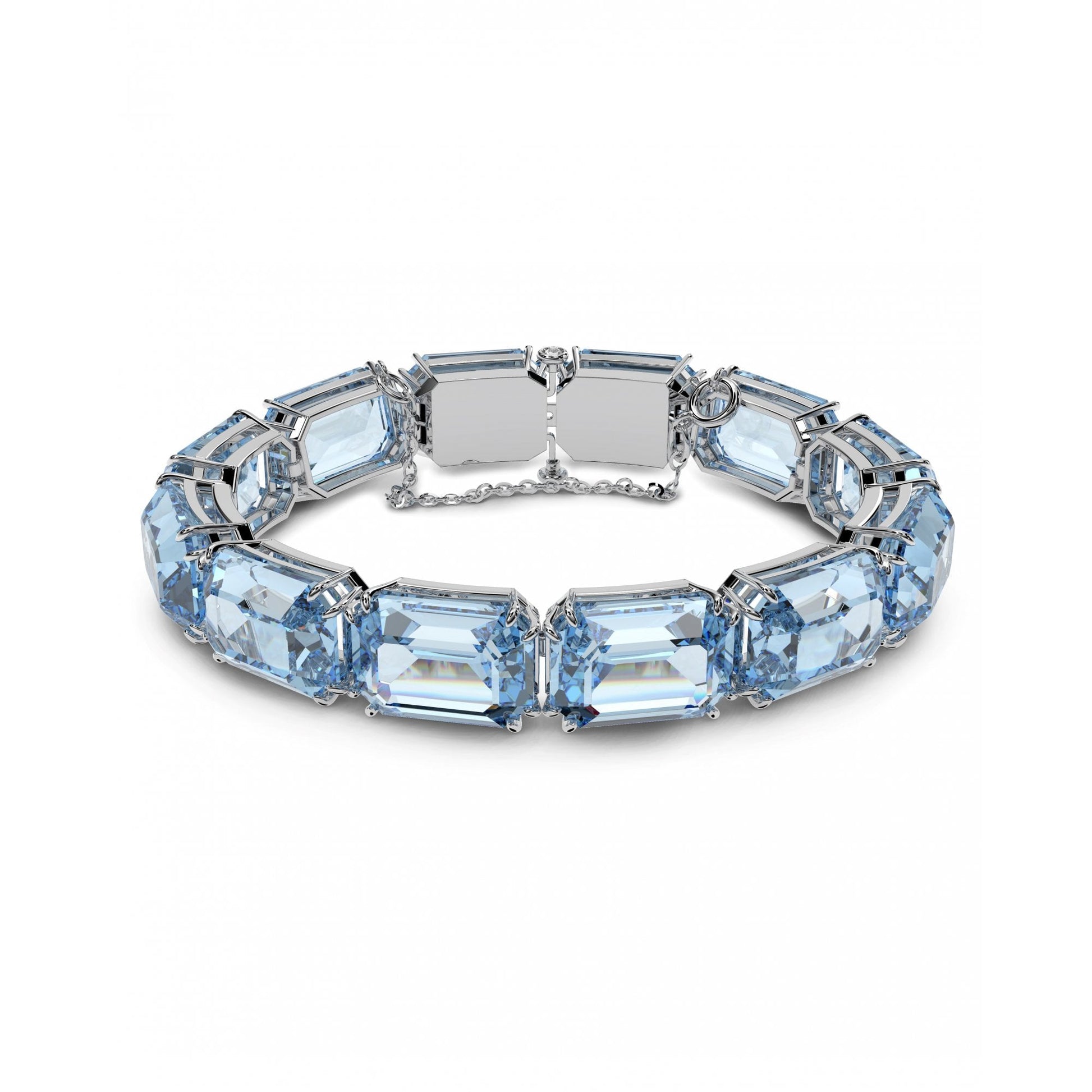 A beautiful everyday adornment, featuring light-sapphire blue octagon-step-cut crystals set in rhodium plated prongs, which are elegantly linked to create a delicate bracelet. This bracelet is part of the Millenia family, designed by Creative Director Giovanna Engelbert for Collection III.