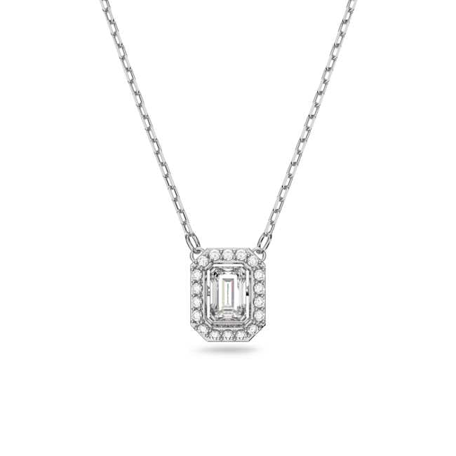Created in a striking octagon shape, this pendant necklace will become one of the hardest-working pieces in your wardrobe. A delicate rhodium-plated chain holds a clear step-cut stone at its center, which moves as you wear it, and is framed by smaller brilliant-cut stones.