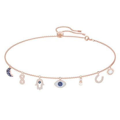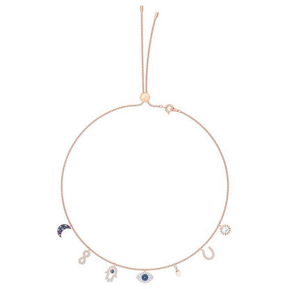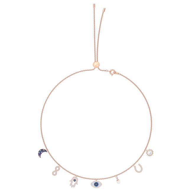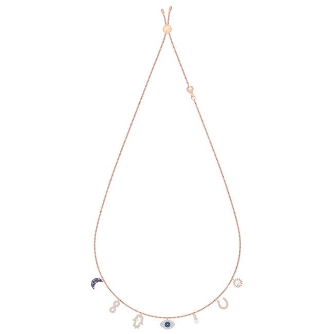 Taking its cues straight from the catwalk, this on-trend charm necklace is championing 2019’s “‘more is more”’ mantra. The rose-gold tone plated design has a choker-style silhouette and features seven different symbols, including a lucky horseshoe, an infinity sign, a hamsa hand and an evil eye. Full of protective meaning, it sparkles in an array of tones and crystal settings. A statement piece, which will add fashionable flair to your look, day and night.