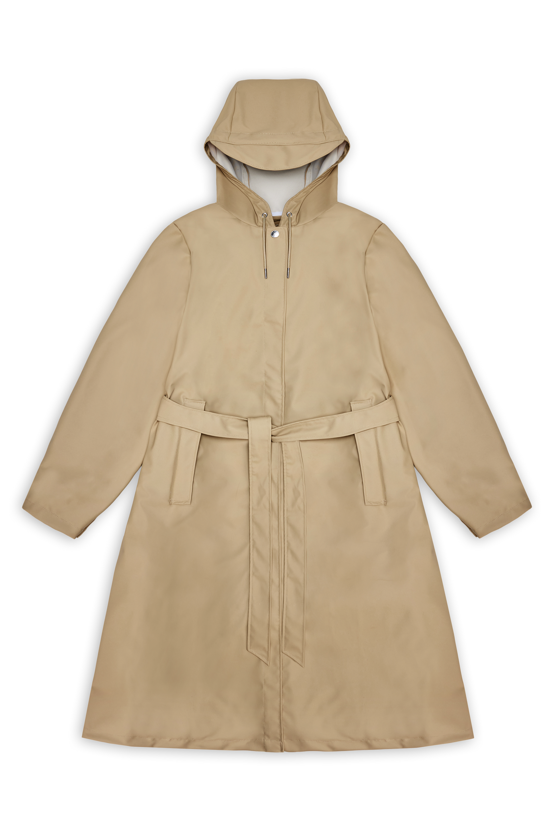 A-line Jacket Longer is a women's raincoat characterized by its A-shaped silhouette and belt that elegantly accentuates the waist. This jacket is a longer version of Rains' A-shaped womens raincoat. It features a drawstring hood with built-in cap, side pockets, hidden snap buttons for closure and adjustable snap cuffs. The A-line Longer Jacket is completed with a belt to accentuate the waist for an individually fitted silhouette. The finish is soft with a lightweight feel and elegant drape.