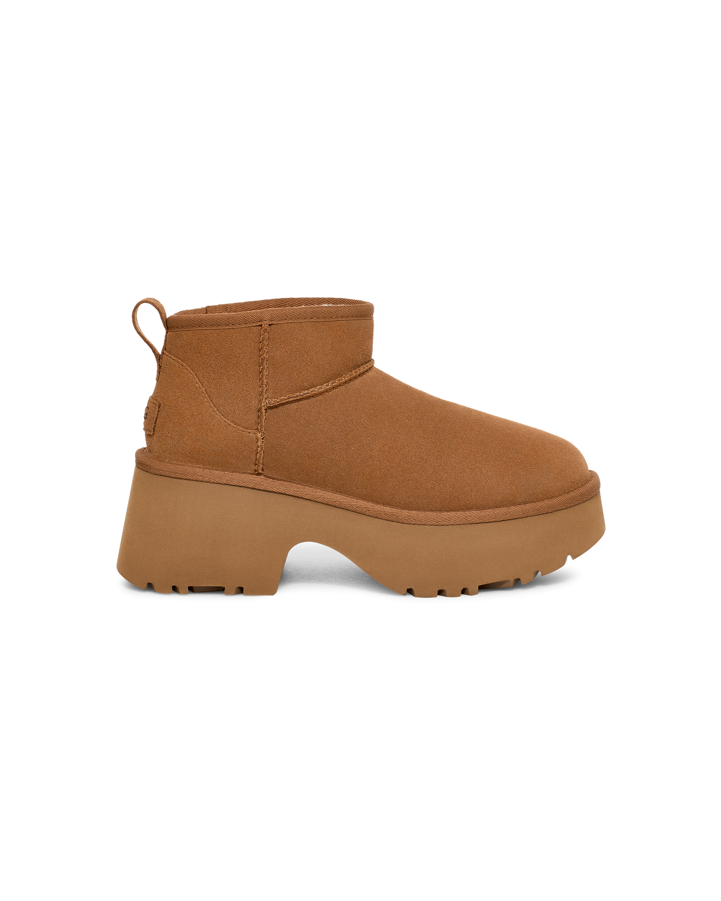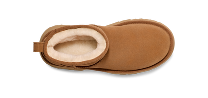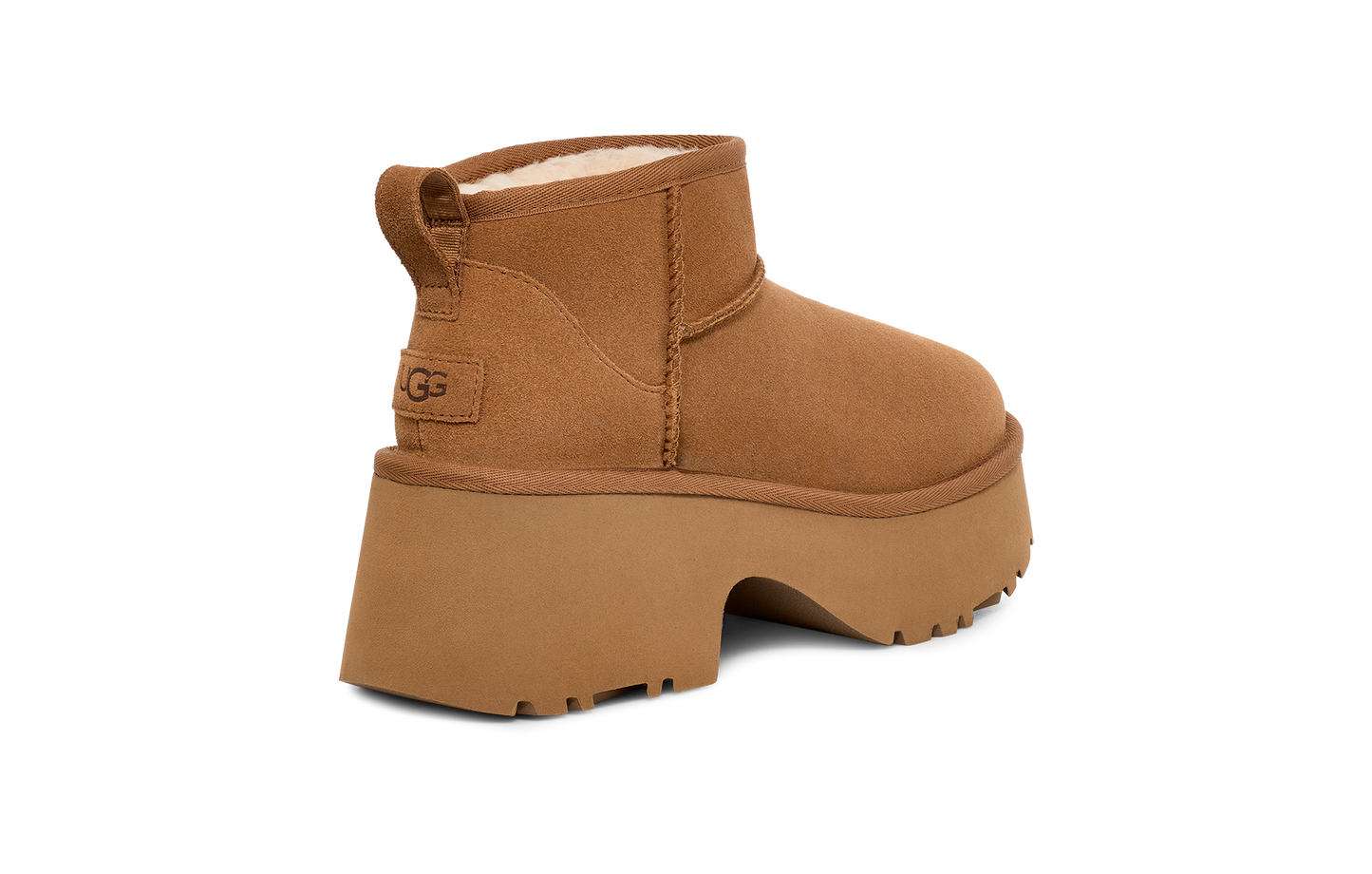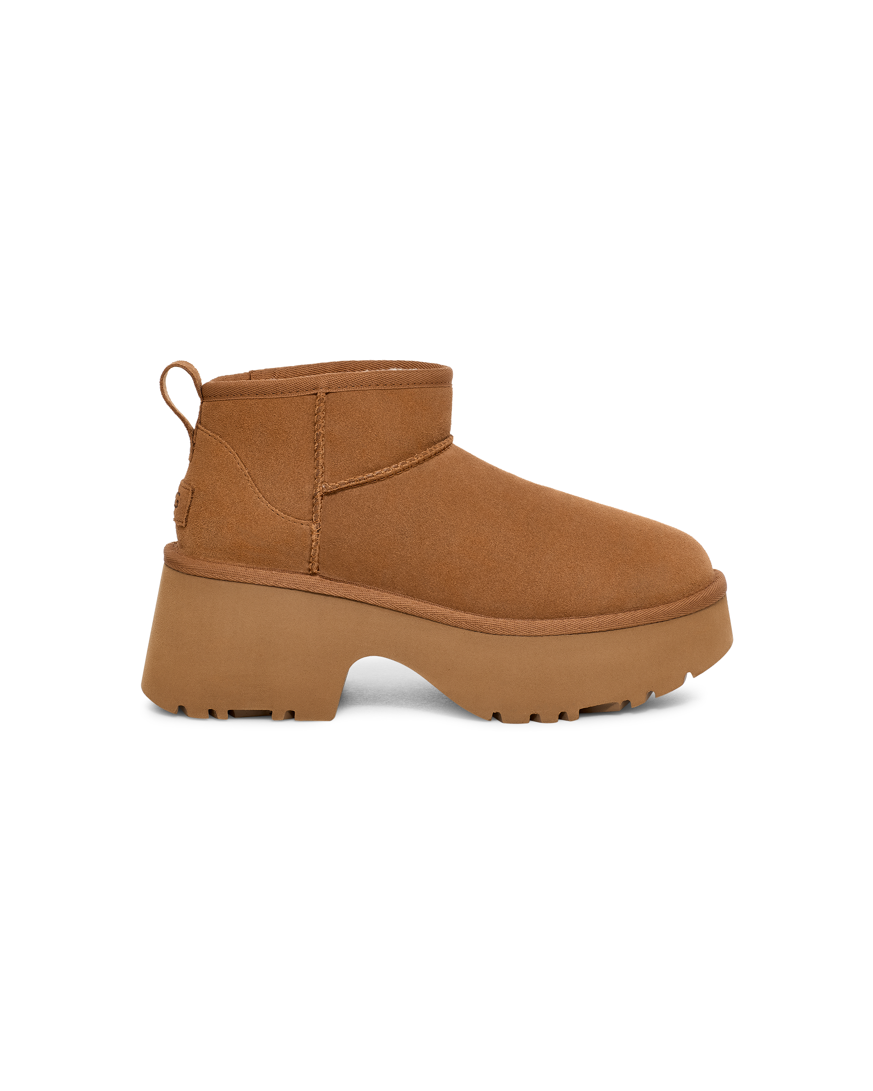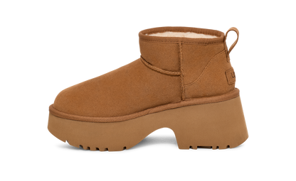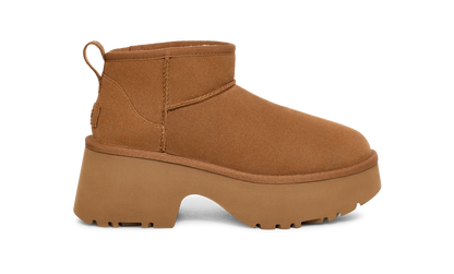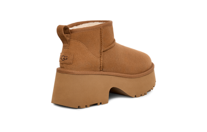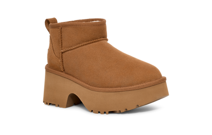 Elevate your 'fits with the Classic Ultra Mini New Heights. Designed with our suede upper, UGGplush™ lining, and a bold cropped shaft, this Classic Ultra Mini gets a bold new update with a chunky notched platform and a 3" heel.