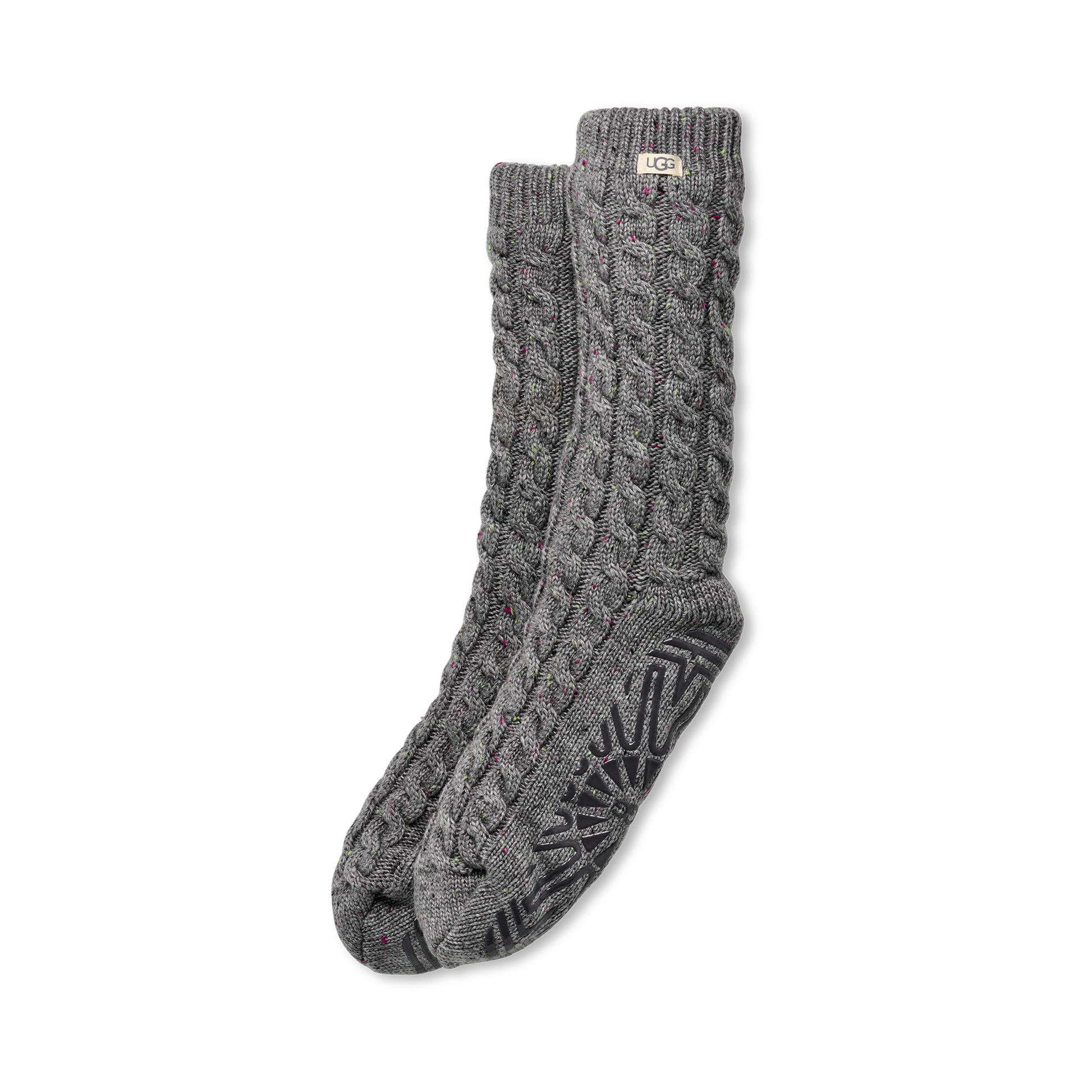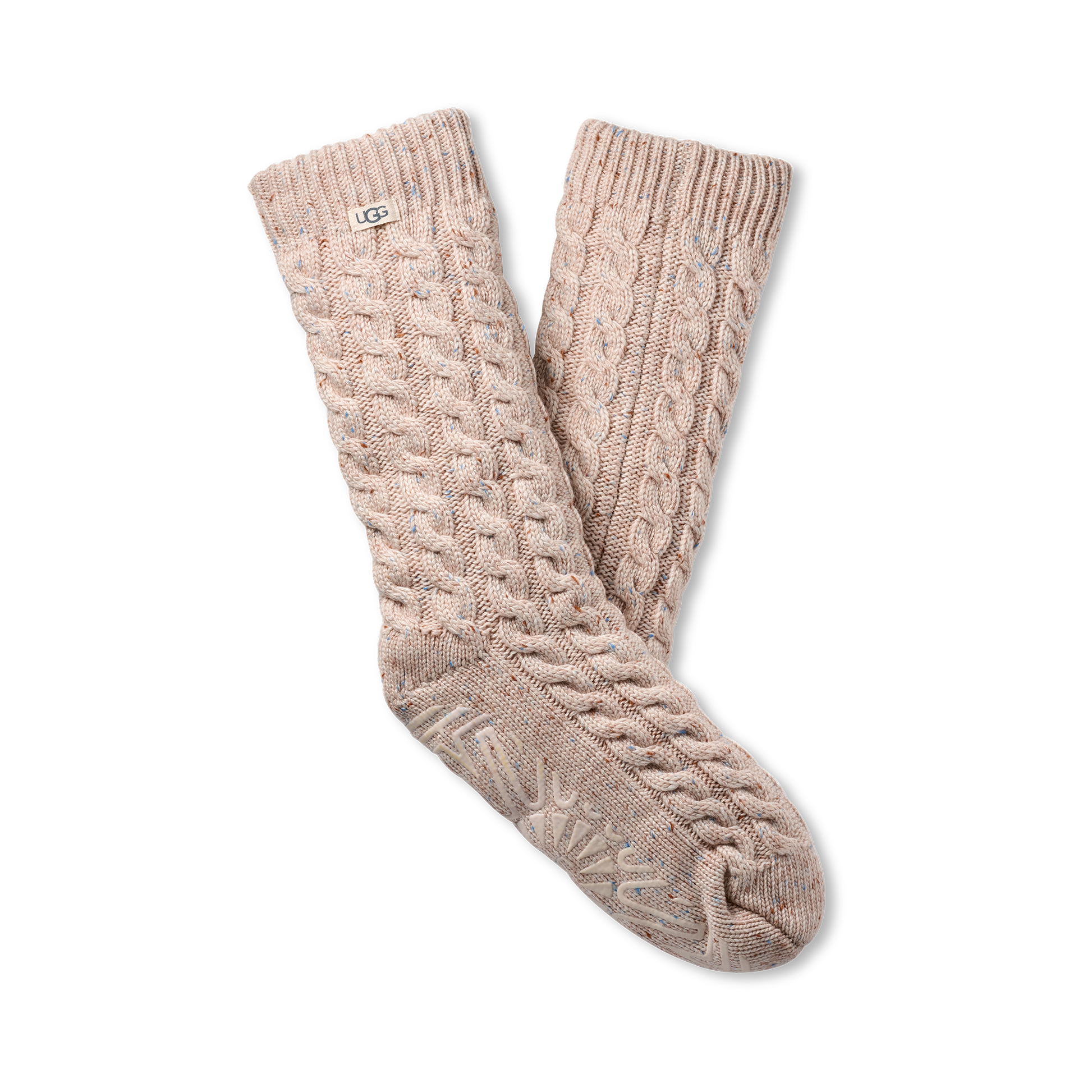 Our Elowyn Cable Knit Fleece Lined sock is designed for cozy cabin days and snow-filled evenings. It features a thick fleece lining and The Sun Logo Shape gripper footbed for indoor traction.