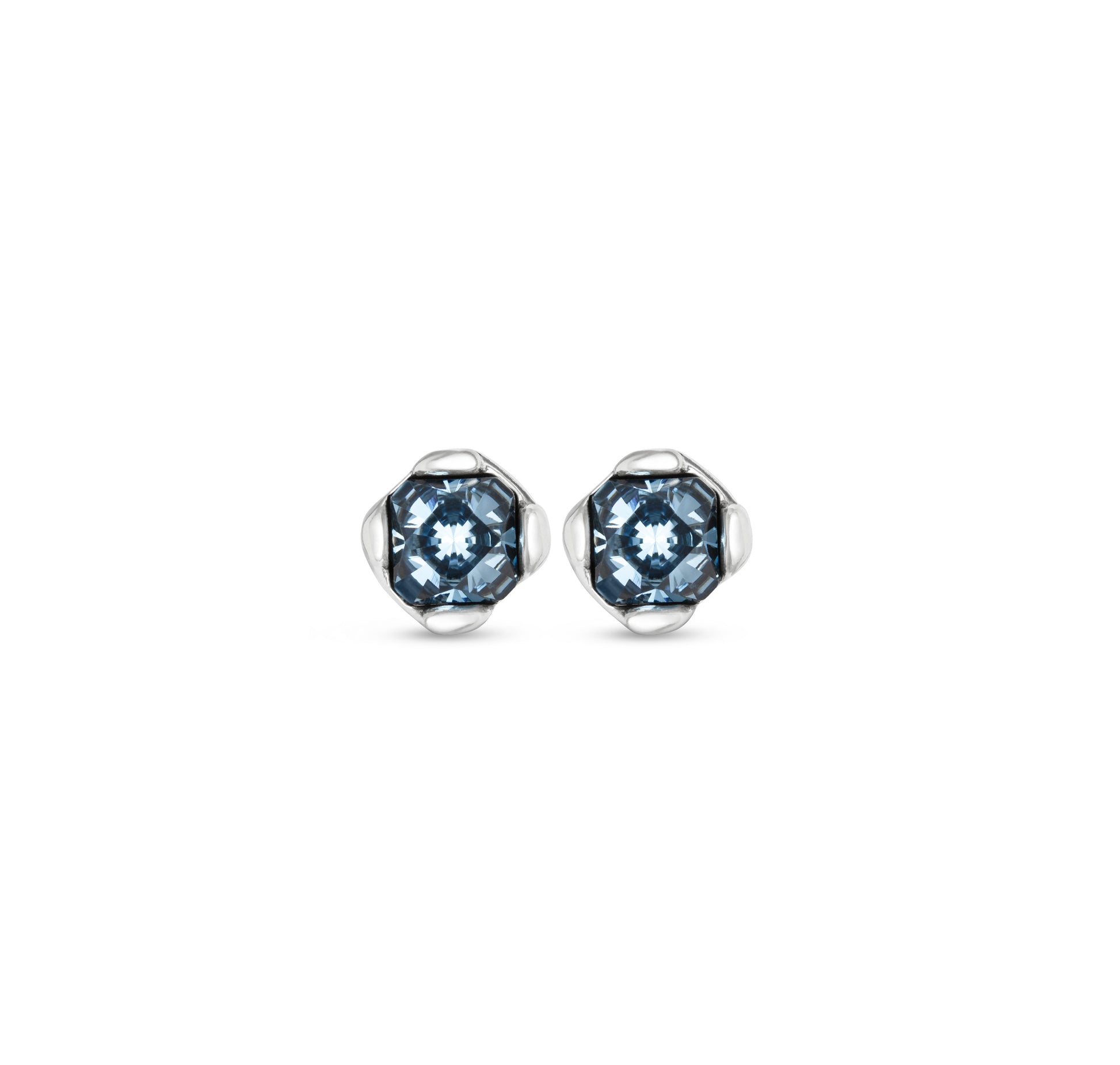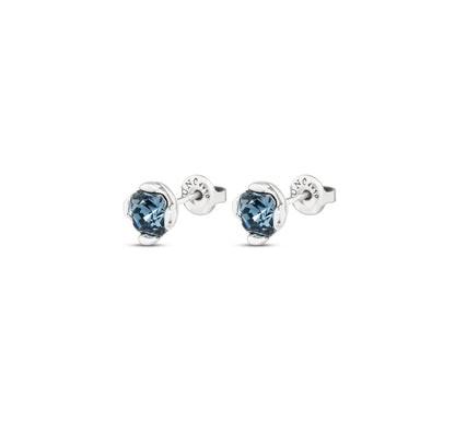 Sterling silver metal alloy earrings, stud style, with 1 blue faceted crystal