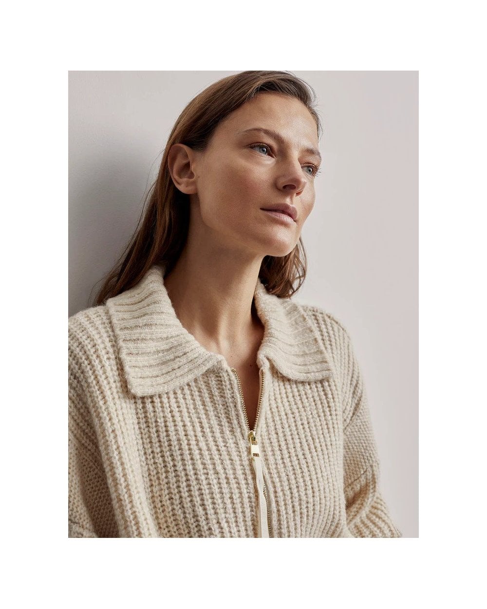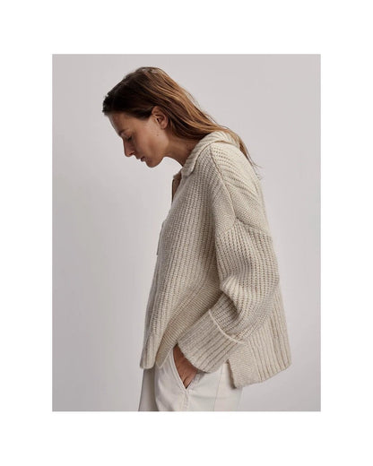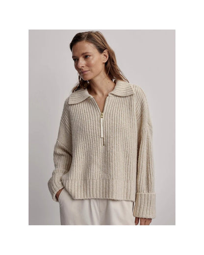 Crafted from wool-blend Flecked Boucle Knit, this sweater offers a relaxed fit with a draped silhouette that’s perfect for easy layering. With its half zip design, large rib collar, deep hem, and turn-up cuffs, the Amelia can be styled with leggings or trousers depending on the occasion.