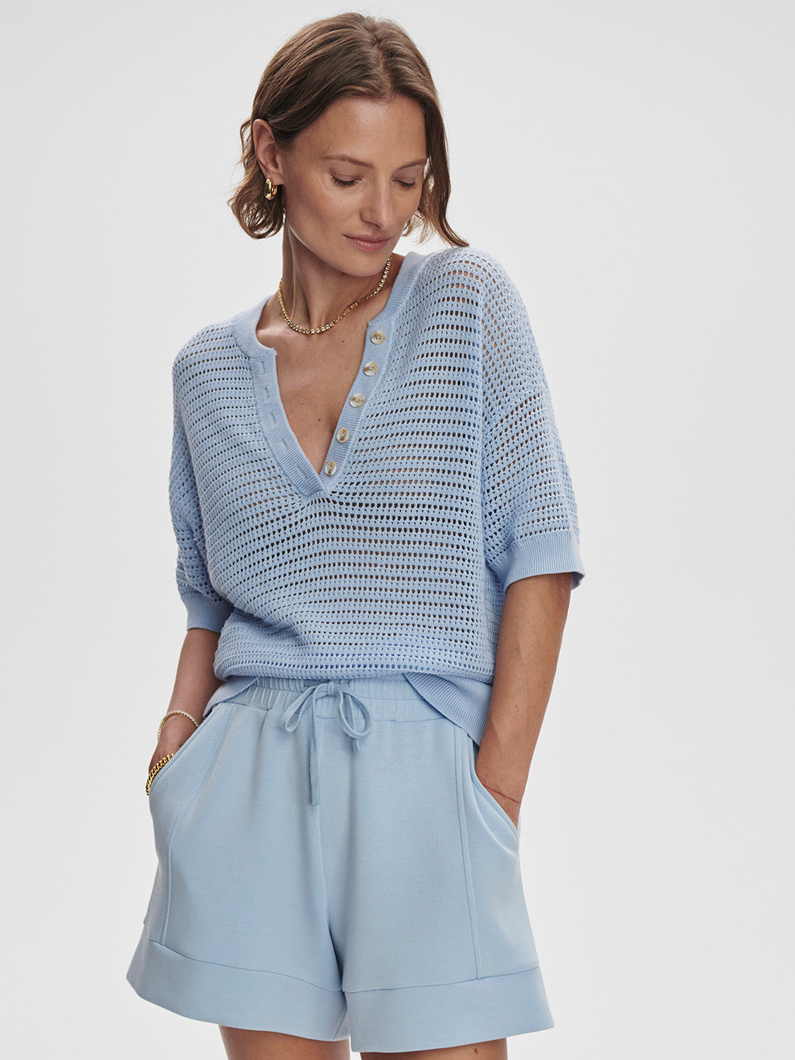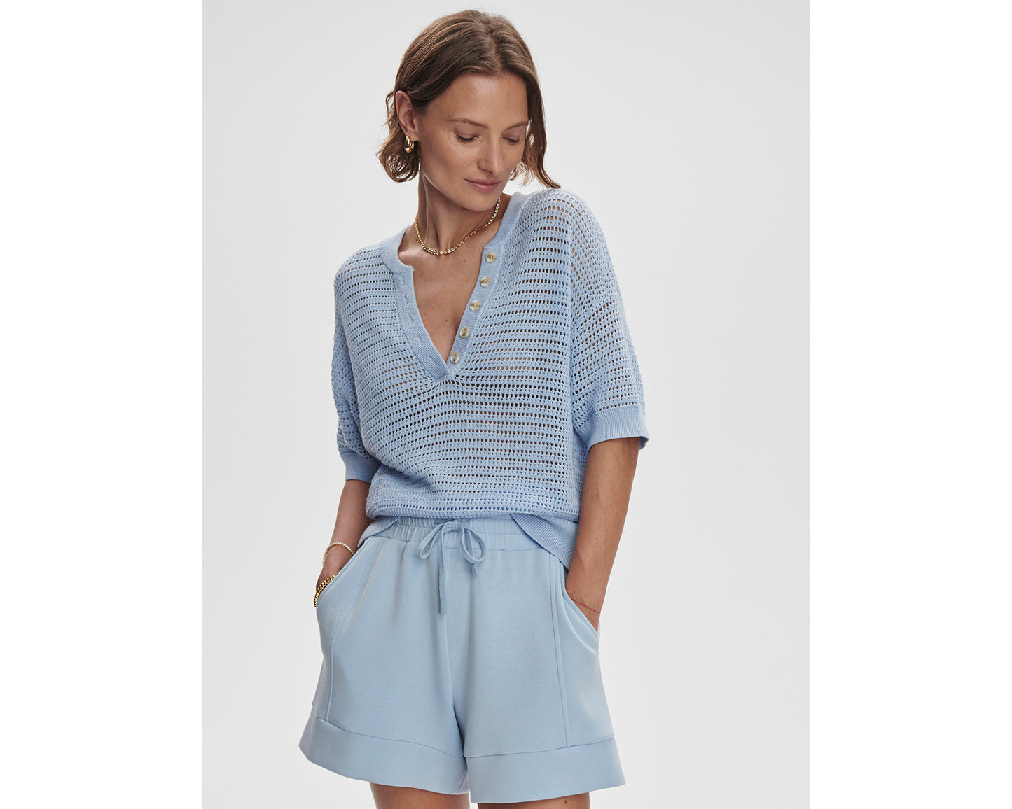 Crafted in our lightweight cotton mesh knit to a boxy, oversized silhouette, this top hangs elegantly off the frame with a deep V-neckline. Featuring short sleeves with dropped shoulders for a more relaxed fit, style with everything from active sets to everyday staples.