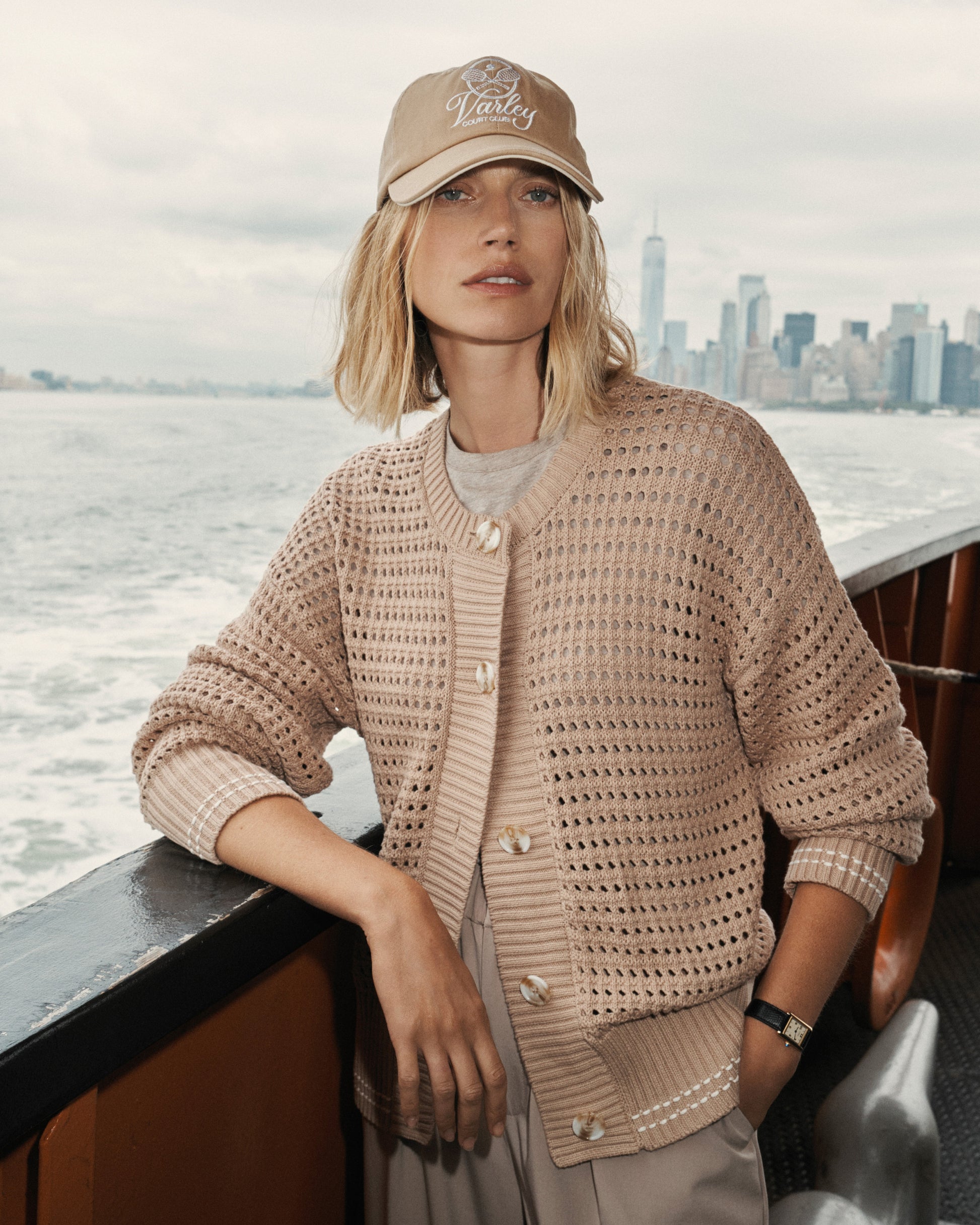 The Kris jacket features a boxy silhouette and contrast stitch detail, accented by classic details including a round neckline and honeyed buttons. Made from 100% cotton in a Link Crochet design, this cardigan will add a tactile finish to any look. Effortlessly cool, this knitted cardigan blends retro charm with timeless elegance in a relaxed fit.