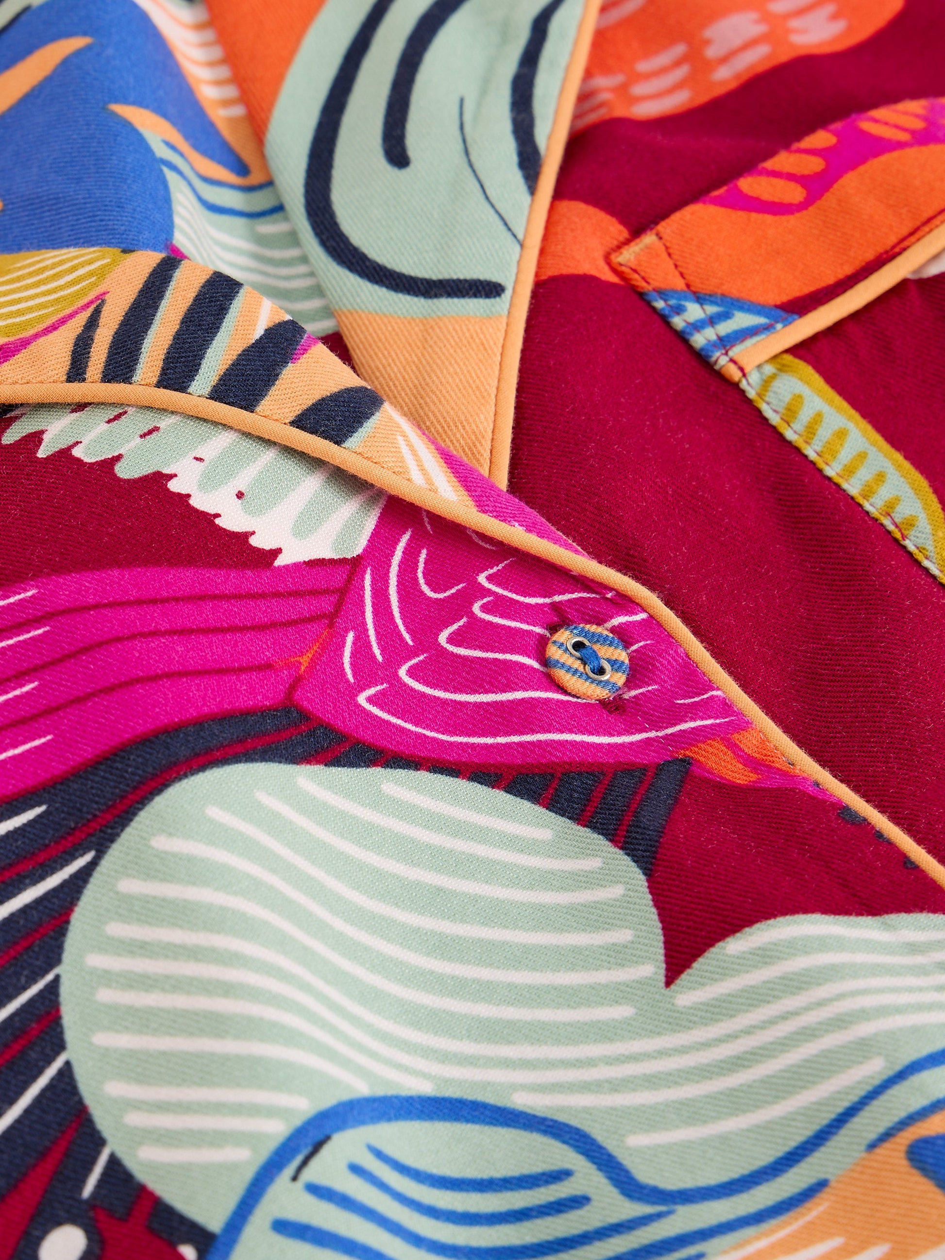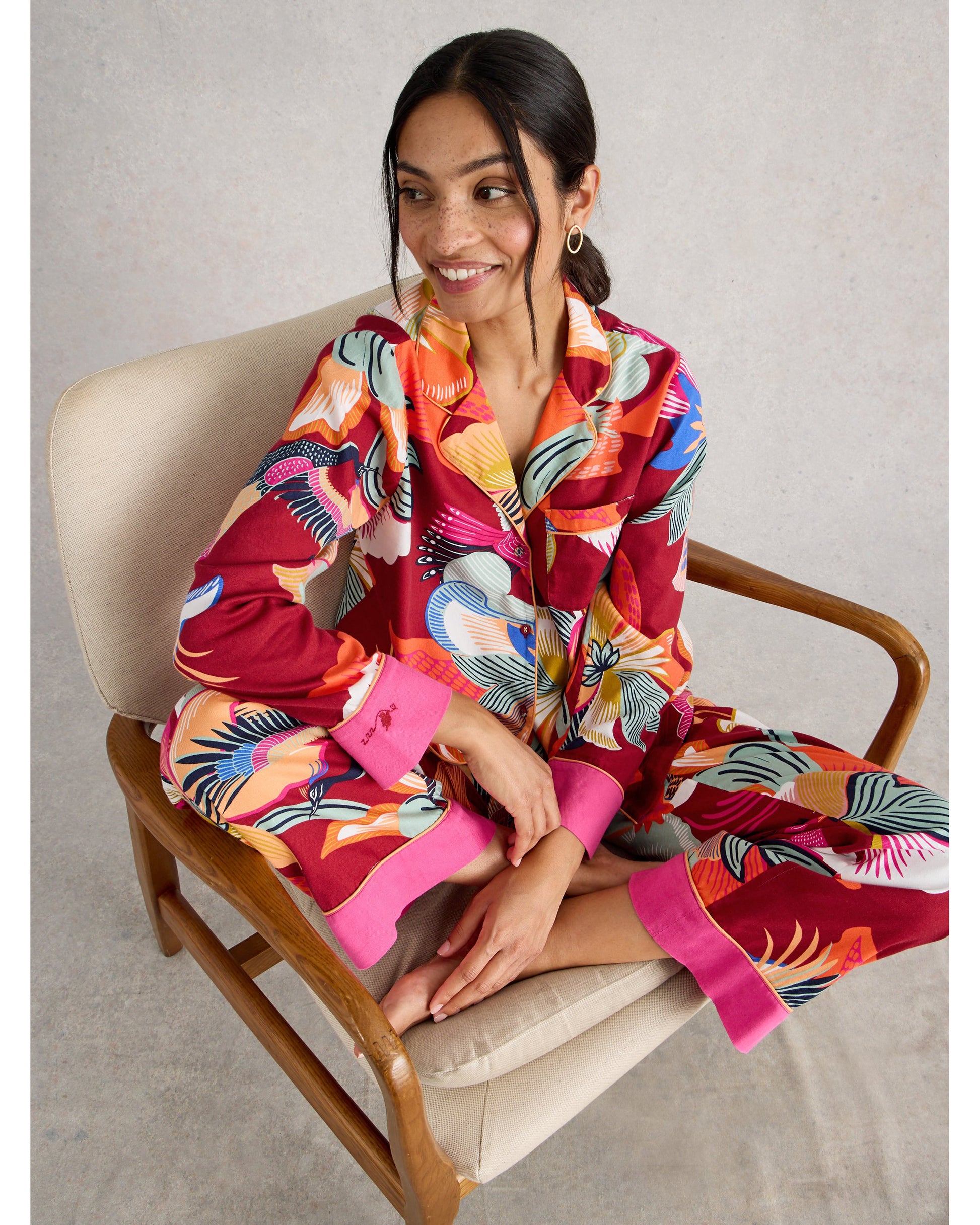 A pyjama shirt with a contrasting print on the cuffs, a little colour pop and embroidery details. Add the matching bottoms and consider this your excuse to lounge.