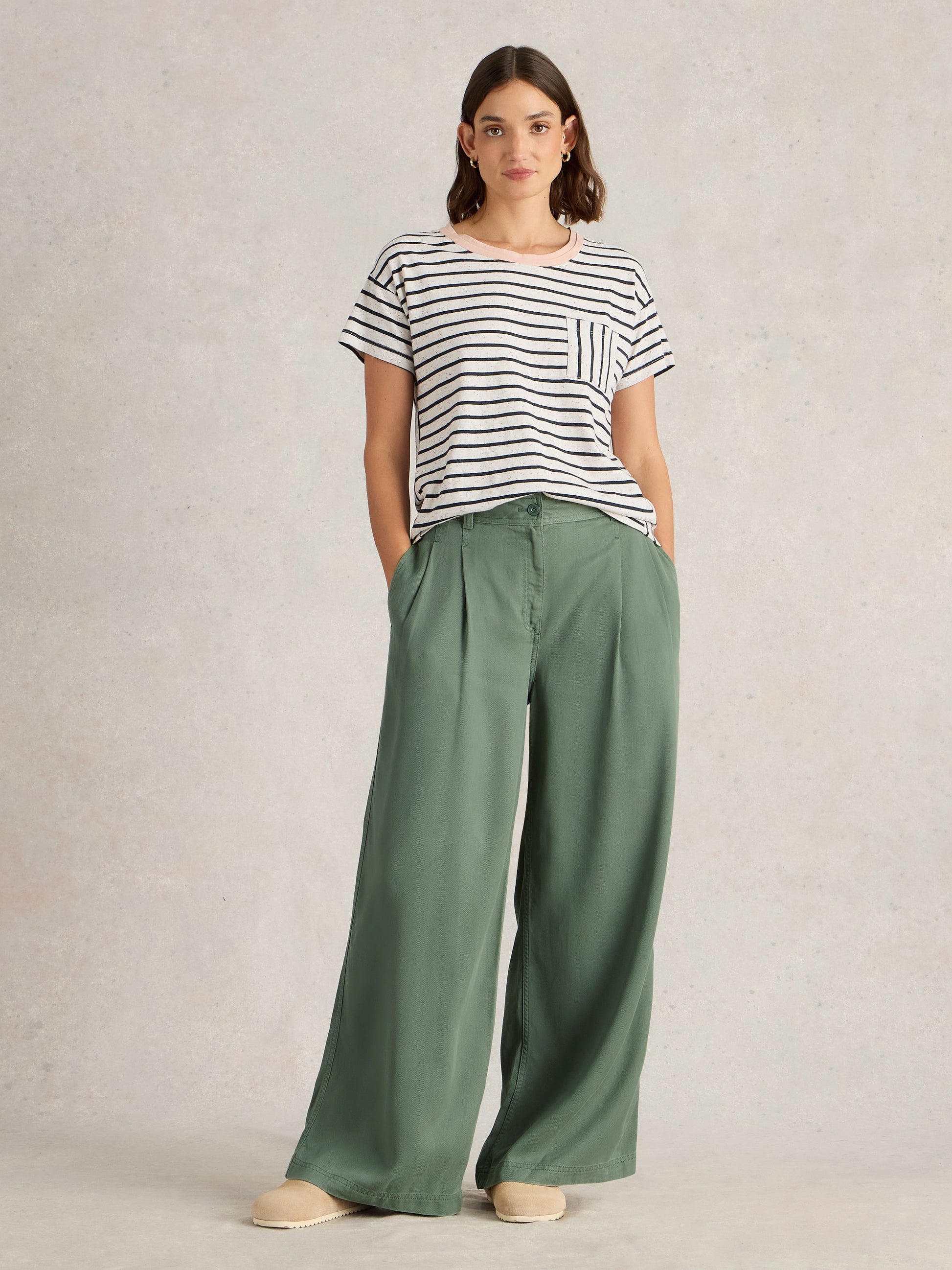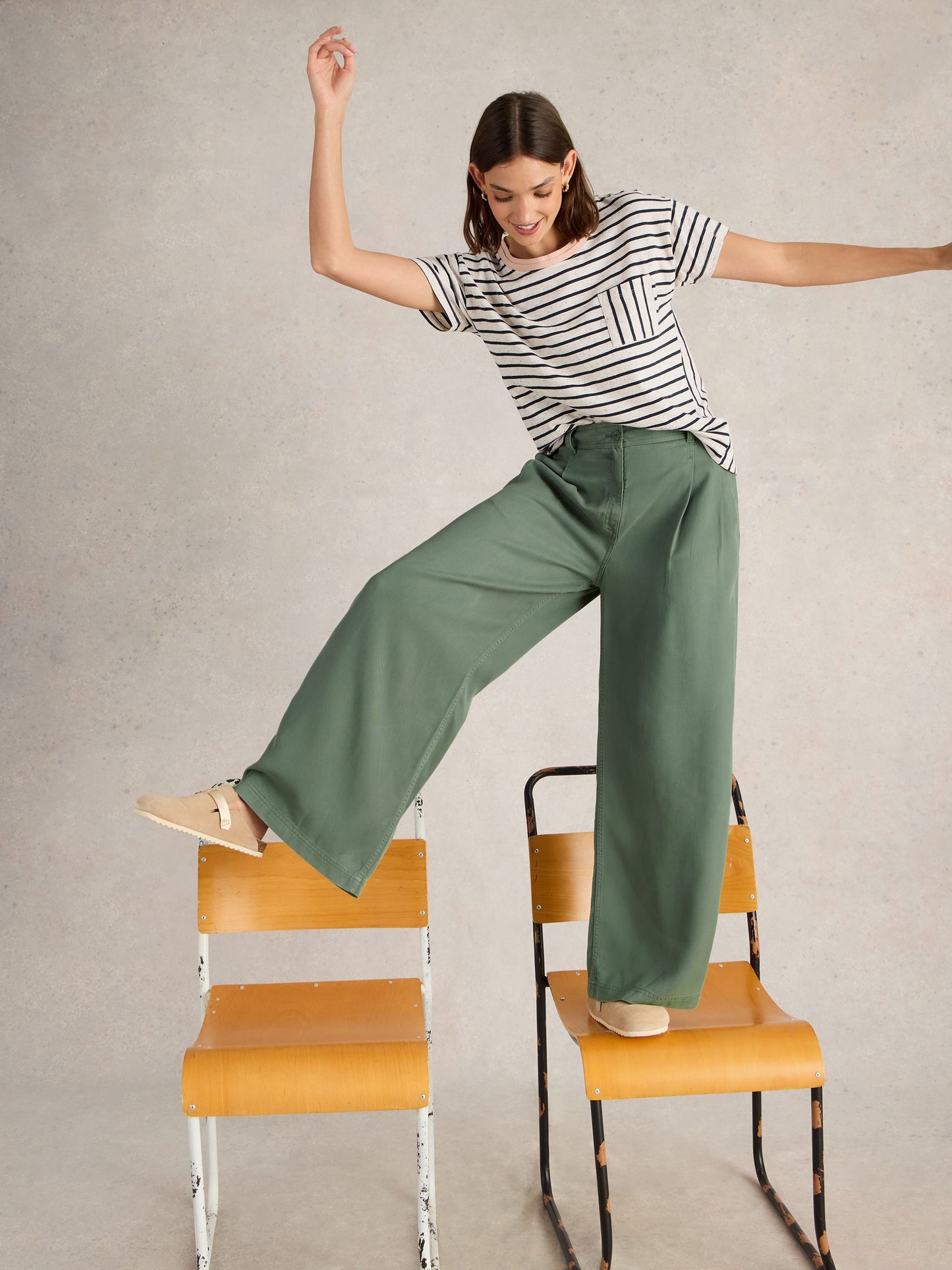 Bye bye, uncomfortable trousers. Welcome, wide leg. These ones are made using 100% TENCEL™ Lyocell (which is really soft), and have pleats at the top for a drapey feel.