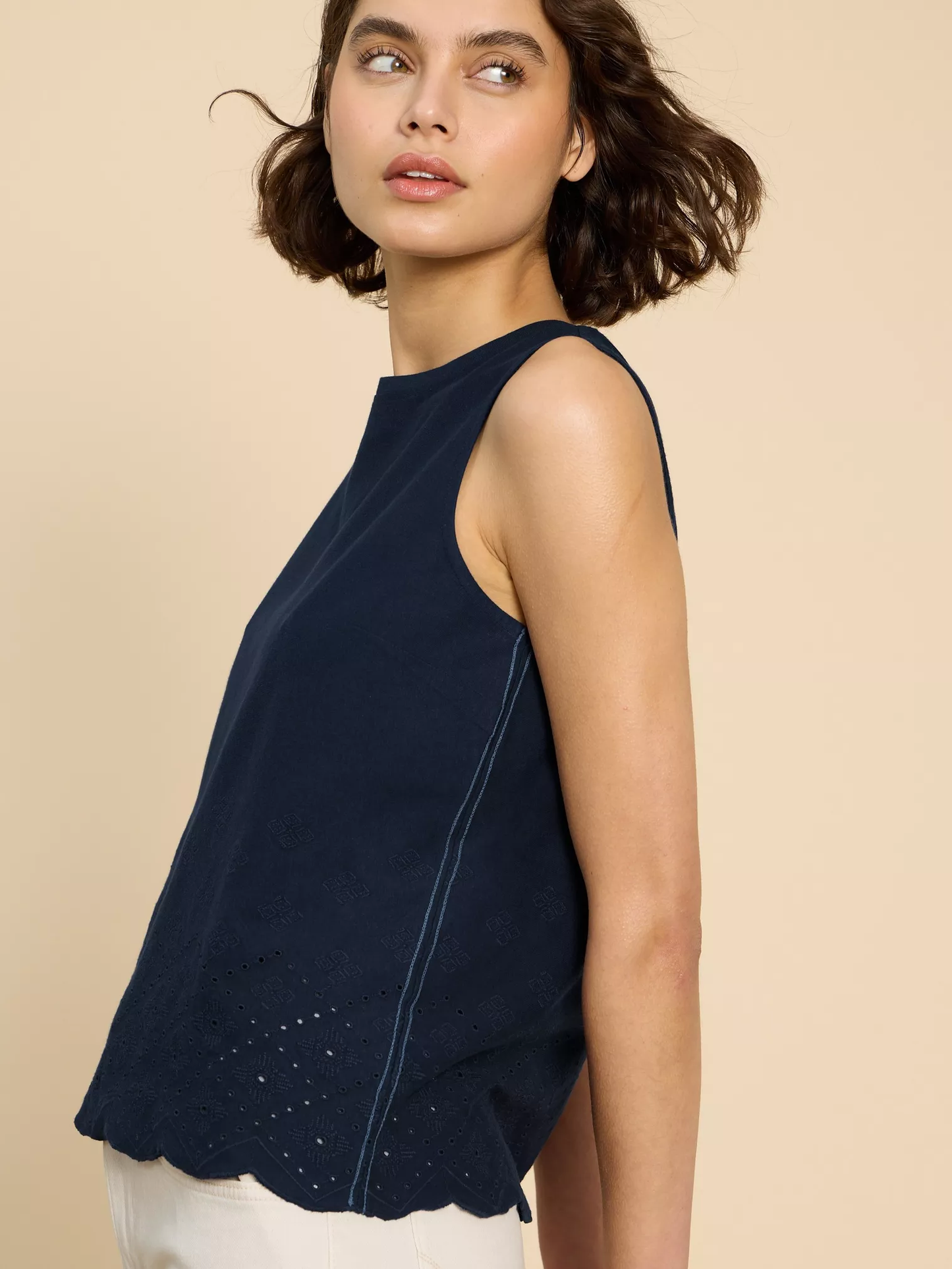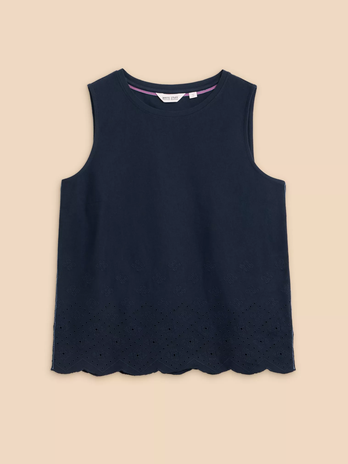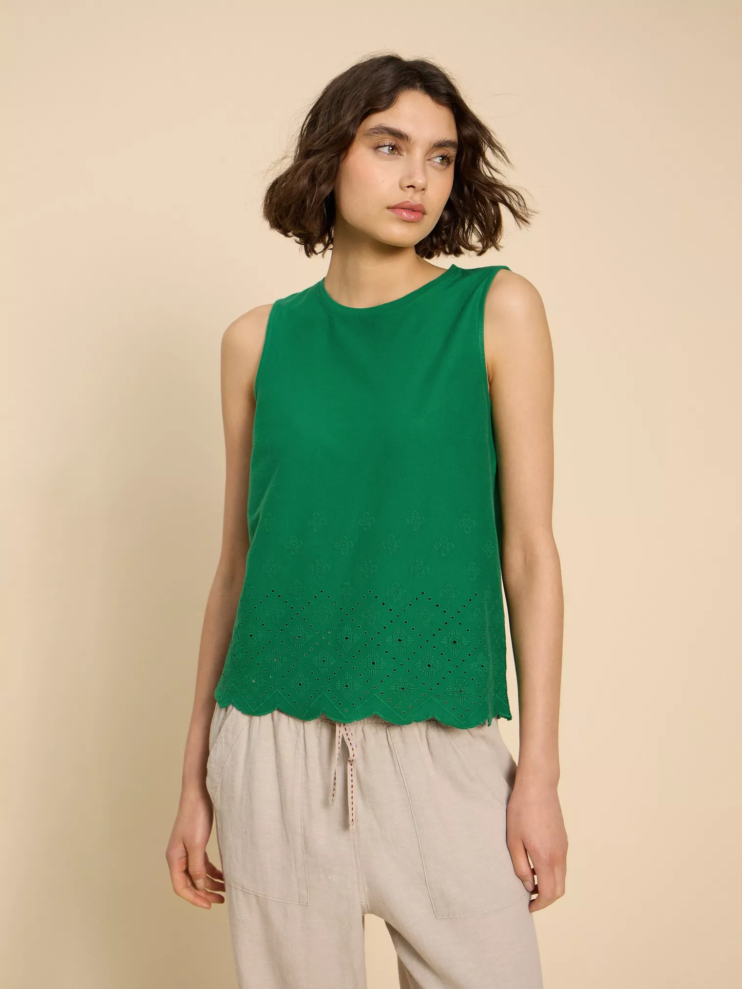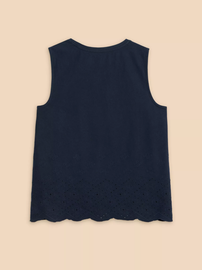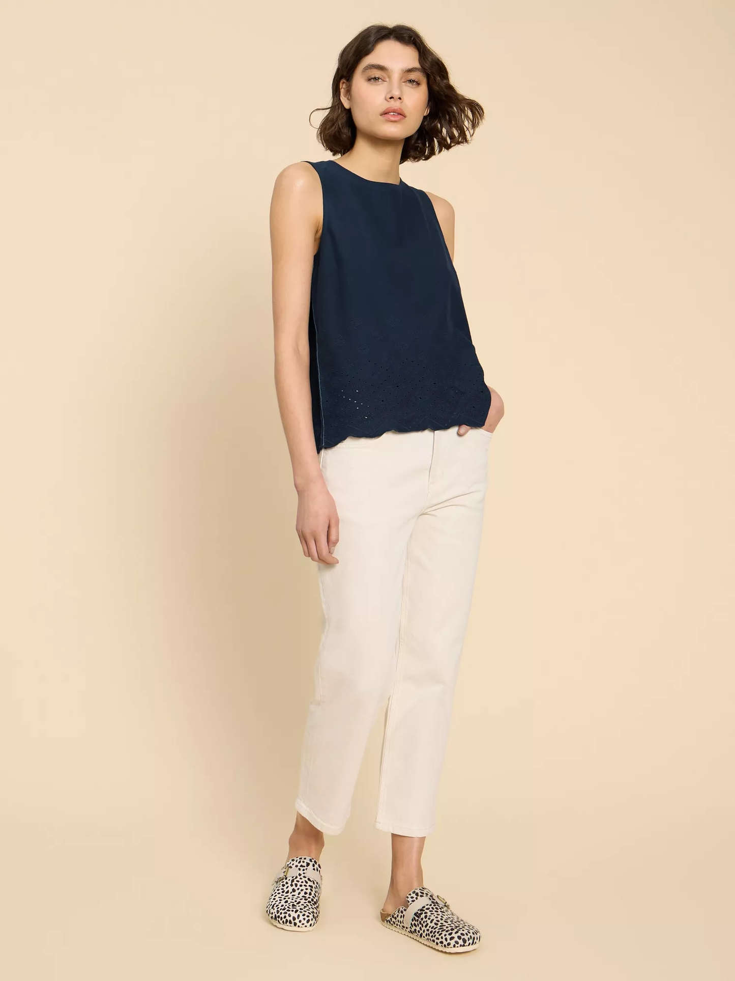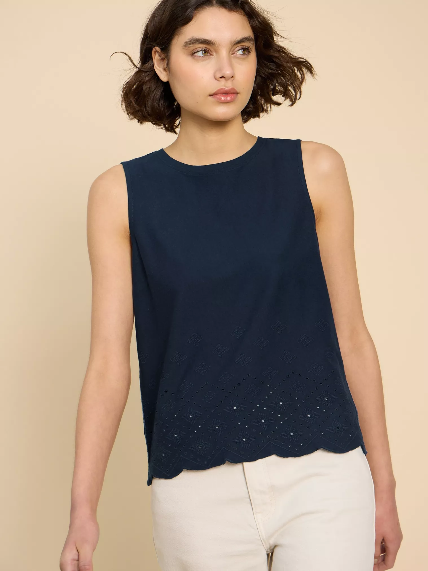 This little cotton vest top is all about the hem. With scalloped edging and embroidered broderie anglaise detailing. She looks great with light jeans or chinos.