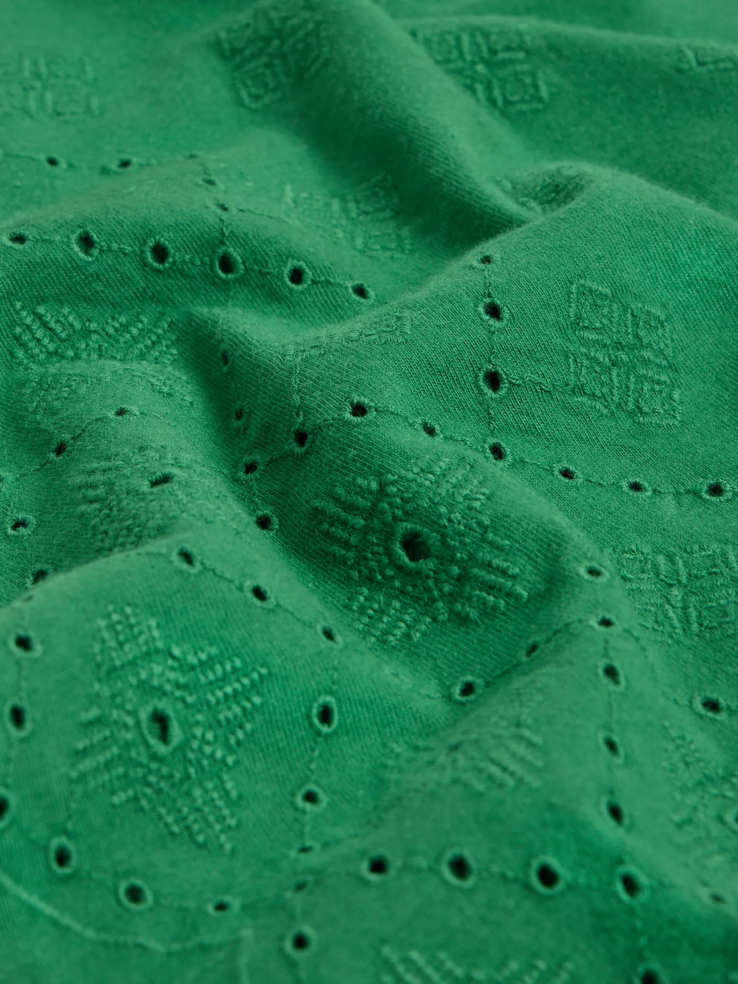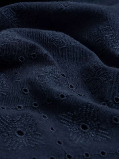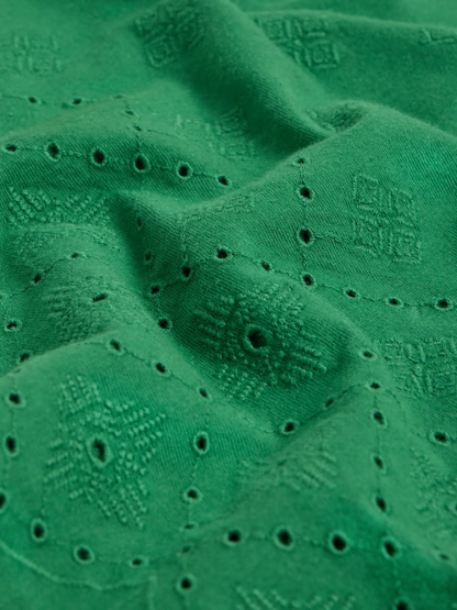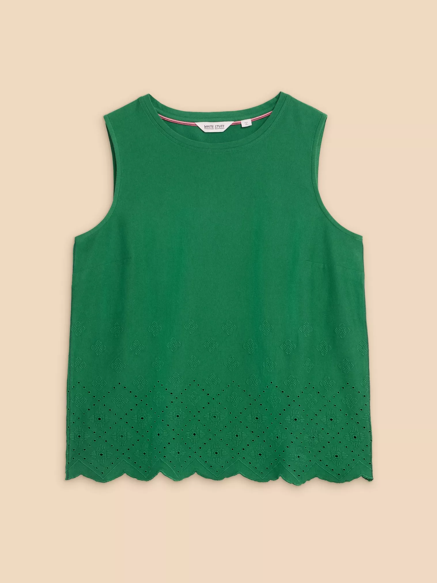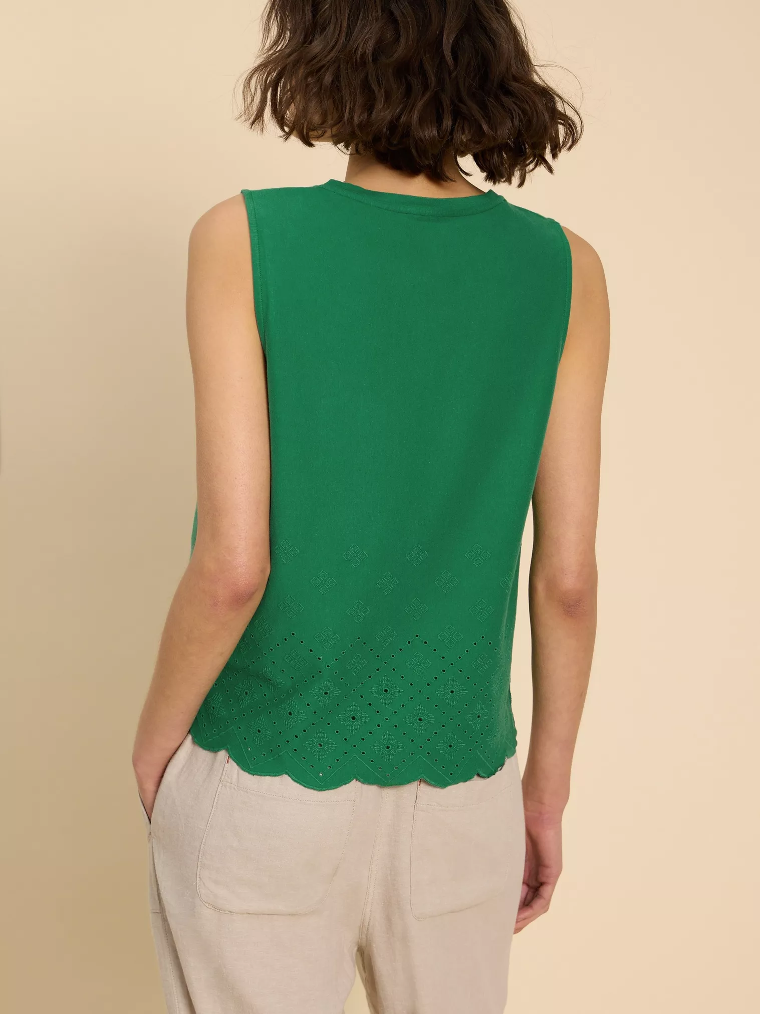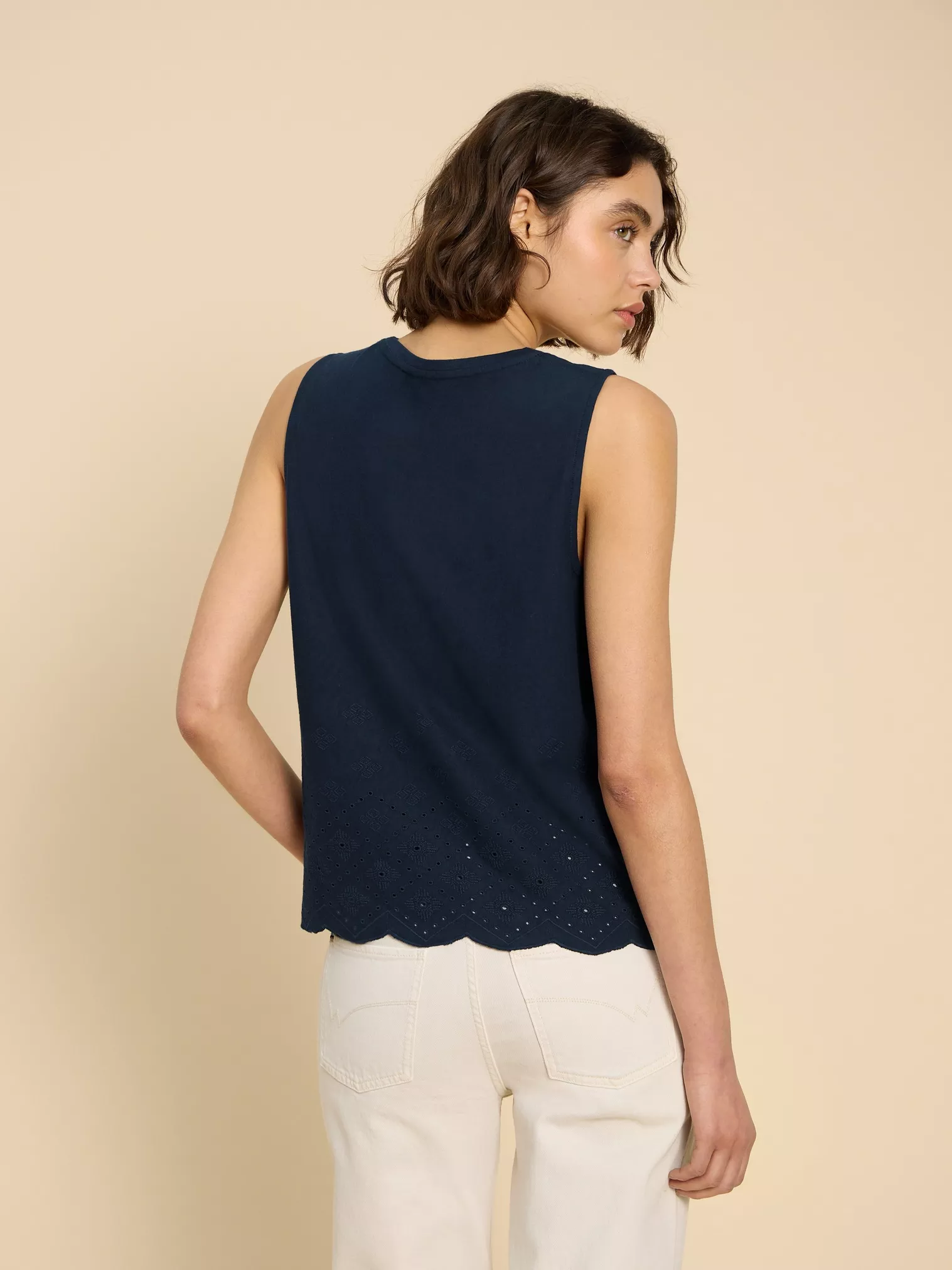 This little cotton vest top is all about the hem. With scalloped edging and embroidered broderie anglaise detailing. She looks great with light jeans or chinos.